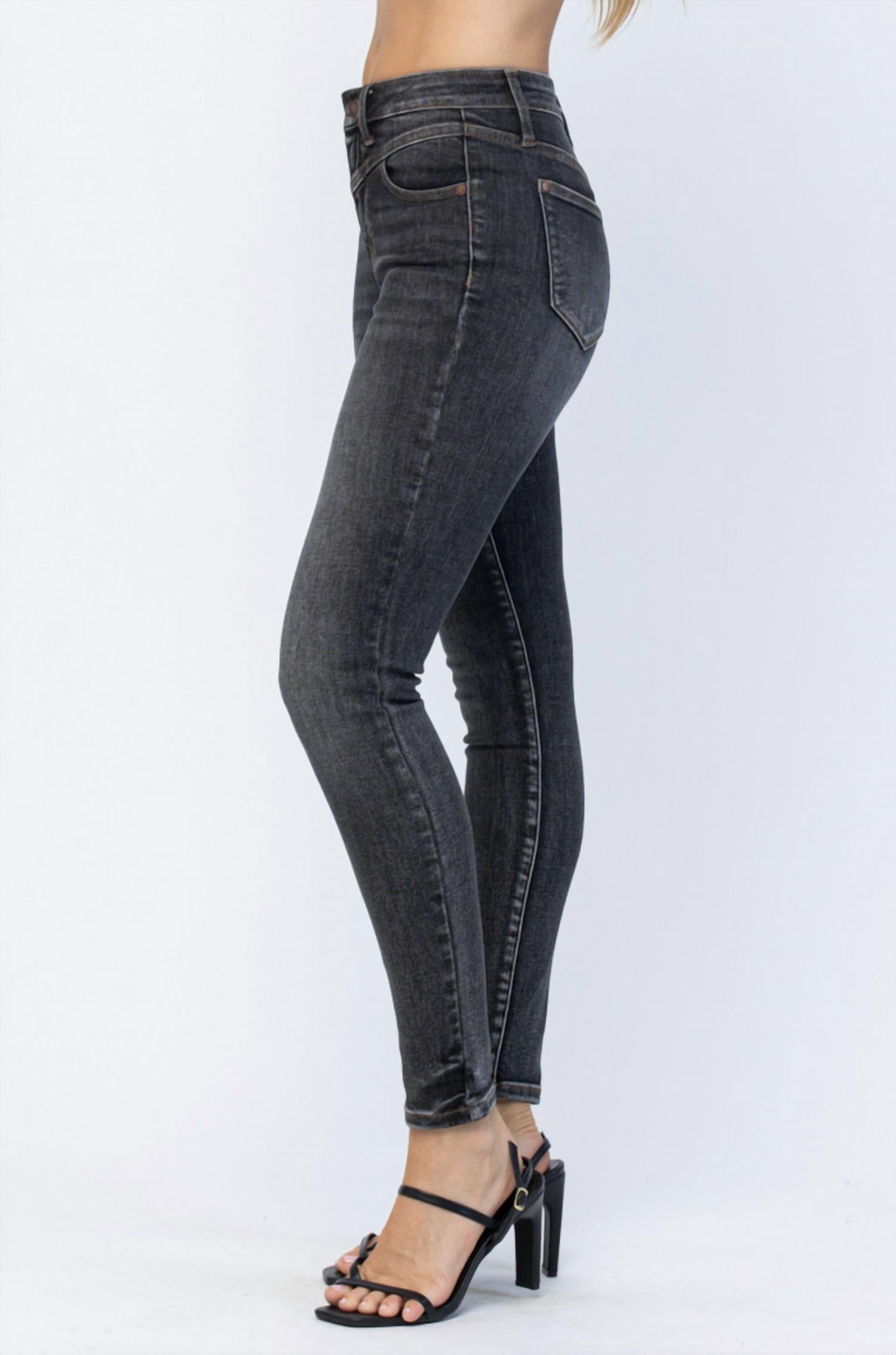 Everyone needs a good pair of skinny jeans and this is a style you'll keep reaching for no matter the season. Discover the Judy Blue Yoke Skinny Jeans in a chic vintage black, perfect for adding a touch of understated elegance to your summer wardrobe. These women's jeans feature a slim fit with a classic skinny leg and a comfortable mid-rise waist, designed with a rise of 10.75 inches and an inseam of 28.5 inches. Made from a soft cotton blend of 92% cotton, 7% polyester, and 1% spandex, these solid pattern jeans ensure a flattering silhouette and lasting comfort. Closure: Button closure. Care is simple with machine wash and tumble dry instructions, making them an ideal choice for vacation-ready style.