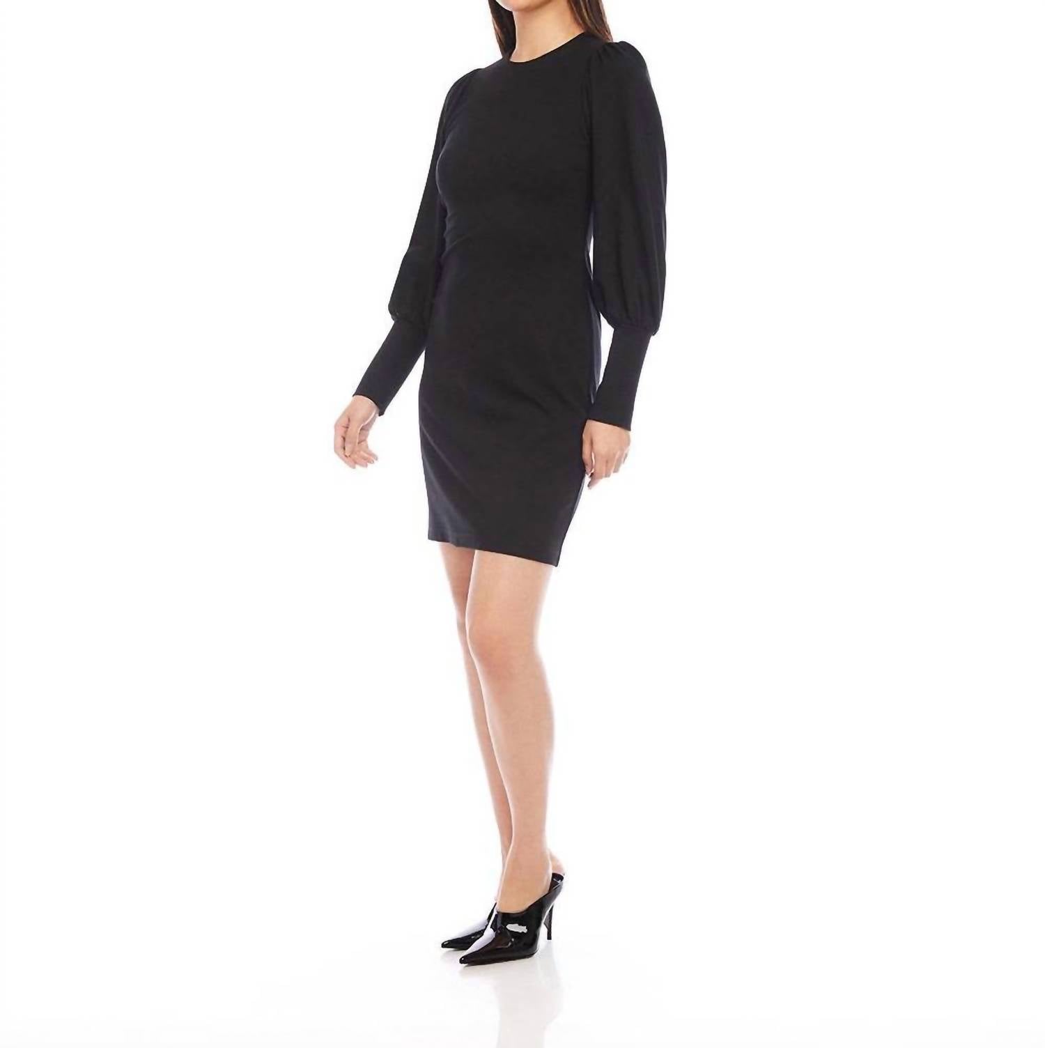 The kind of easy and flattering dress you'll be reaching for all season long. The Karen Kane Bishop Sleeve Dress in petite is perfect for a dinner party, showcasing quiet luxury in solid black with a flattering sheath silhouette. This long-sleeved mini dress, fitted at the bust, waist, and hips, features wide cuffs and a crewneck, crafted from a viscose blend (65% Viscose, 23% Nylon, 12% Spandex) for stretch and comfort. Made in the USA, it has a length of 35 3/8 inches for size MP and secures with a back zipper closure. Care instructions include hand washing cold, hanging to dry, or dry cleaning.