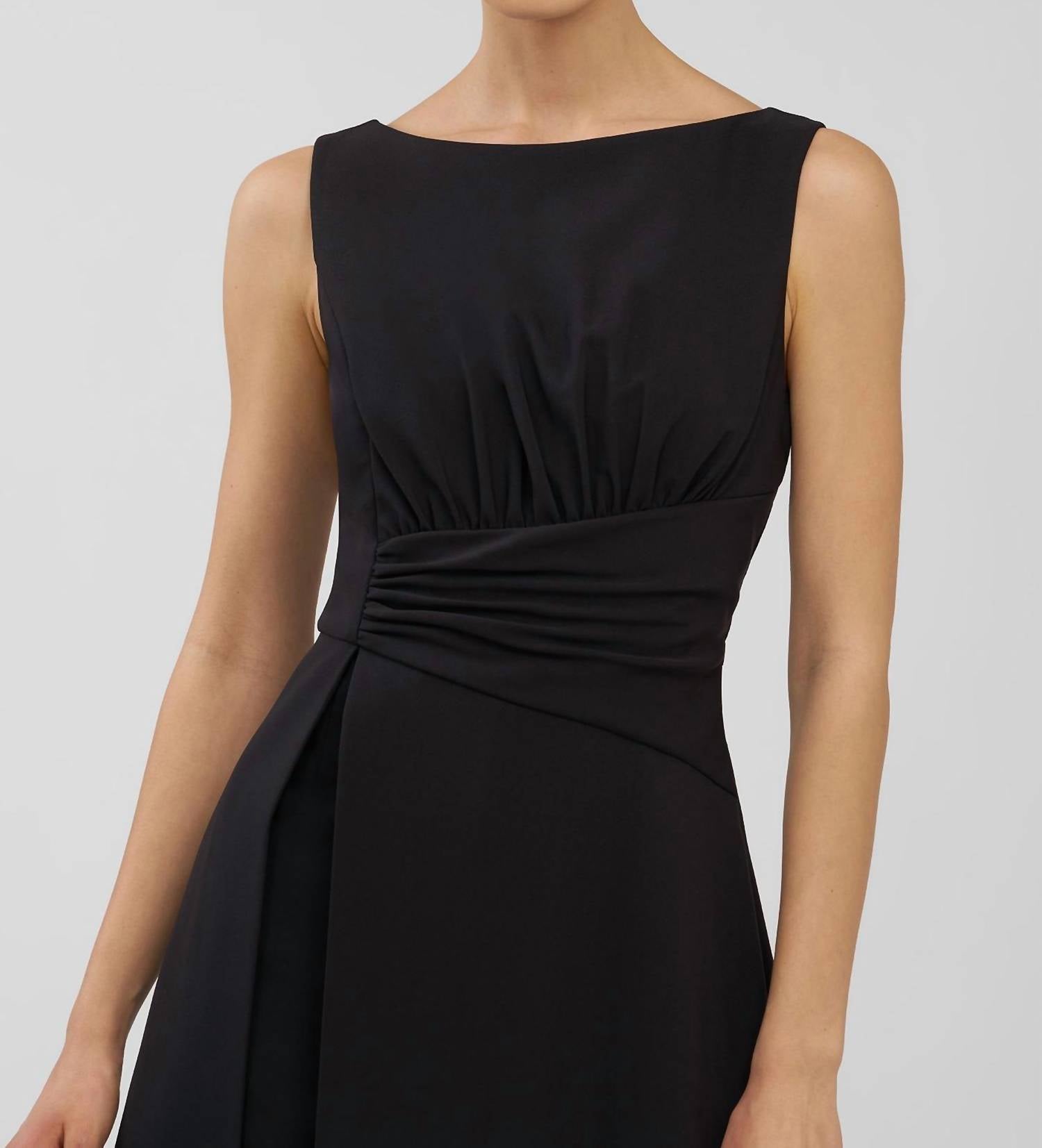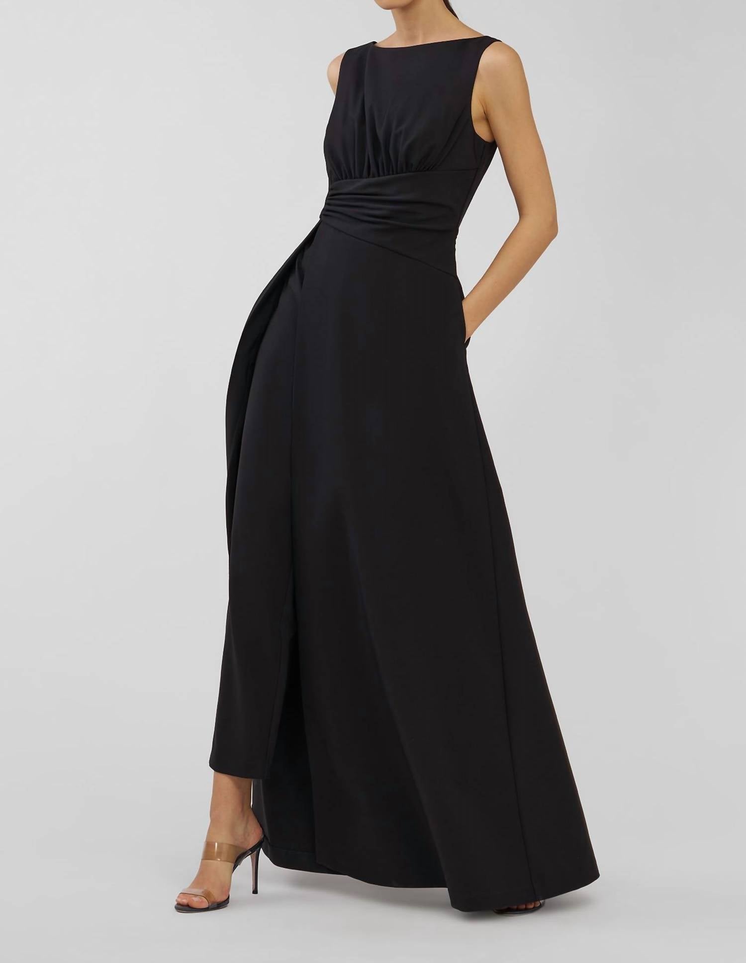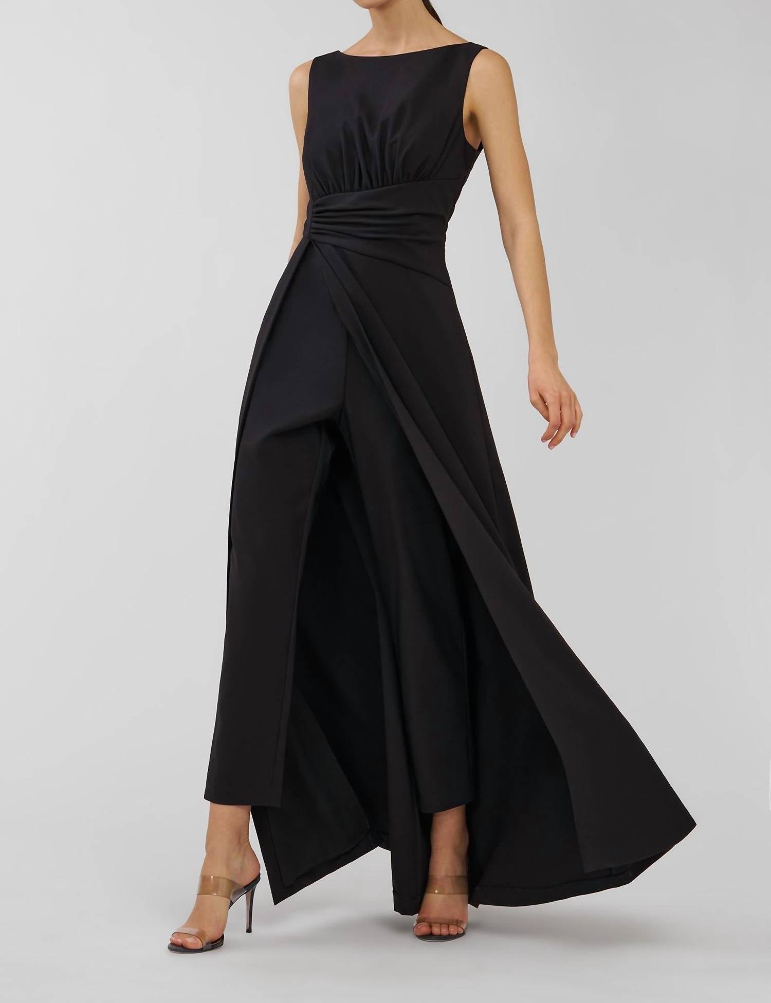 The perfect outfit choice when you you need something quick to throw on and still want to look efforlessly cool. The Palmer Walk Thru Jumpsuit by Kay Unger is a sleek and sophisticated choice for any elegant occasion, crafted in black stretch crepe with a stylish bateau neck. This floor-length jumpsuit is sleeveless and features a unique design with a flowing overskirt that reveals slim, tailored pants beneath, along with functional pockets. Composed of 88% Polyester and 12% Spandex and partially lined, it offers a slightly stretchy feel for comfort and ease of movement. Closure is achieved via a zip, and it requires professional dry cleaning, imported for a touch of international flair. Measurements include a pant inseam of 25.5" and a skirt length of 43.5", as modeled in a size 4.