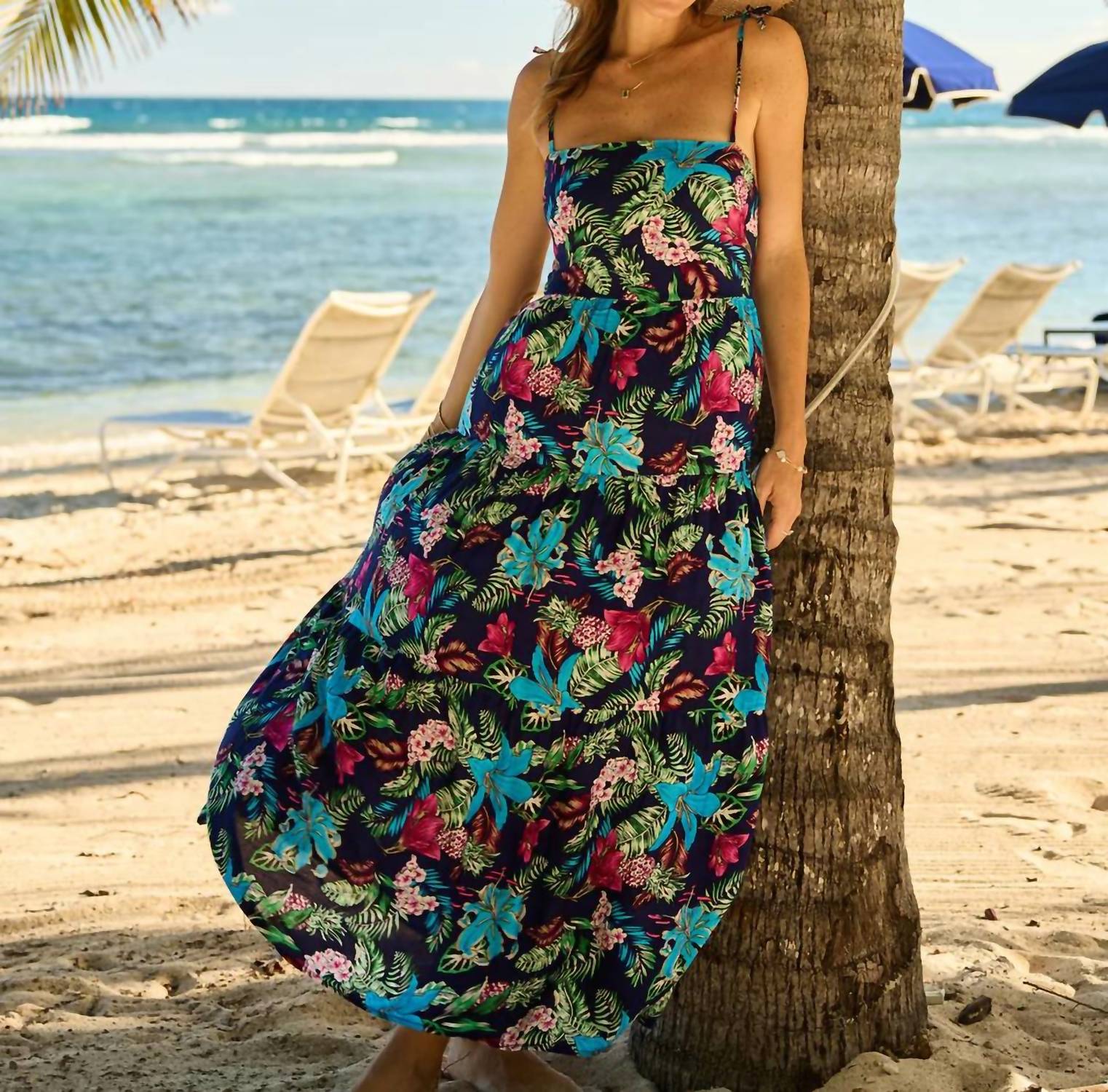 Style this maxi with your favorite statement necklace and sandals for the perfect look. This limited-edition maxi dress is ethically manufactured in Bali from 100% rayon and features a tiered bottom with pull-on styling. The design includes a stretchy, smocked back panel for fit adjustment and adjustable tie shoulder straps that can be tucked in for a strapless option. It is constructed as a full-length resort dress.