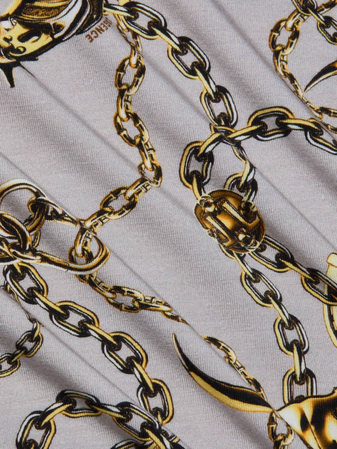 This classic, short sleeve tee will be your go-to staple this season and beyond. Introducing the Ressi Fitted Tee by L'Agence, your go-to for chic summer style with a playful twist. This short sleeve tee boasts a striking gold chain and horn print, crafted from an ultra-soft jersey comprising 92% Rayon and 8% Spandex. Designed with a slim fit and measuring approximately 24.75" from shoulder to hem, it's made in Los Angeles and closes with a convenient pull-on style. For best results, hand wash. Model is 5'10" with a 34" bust, 24" waist, and 35" hips, wearing size XS.