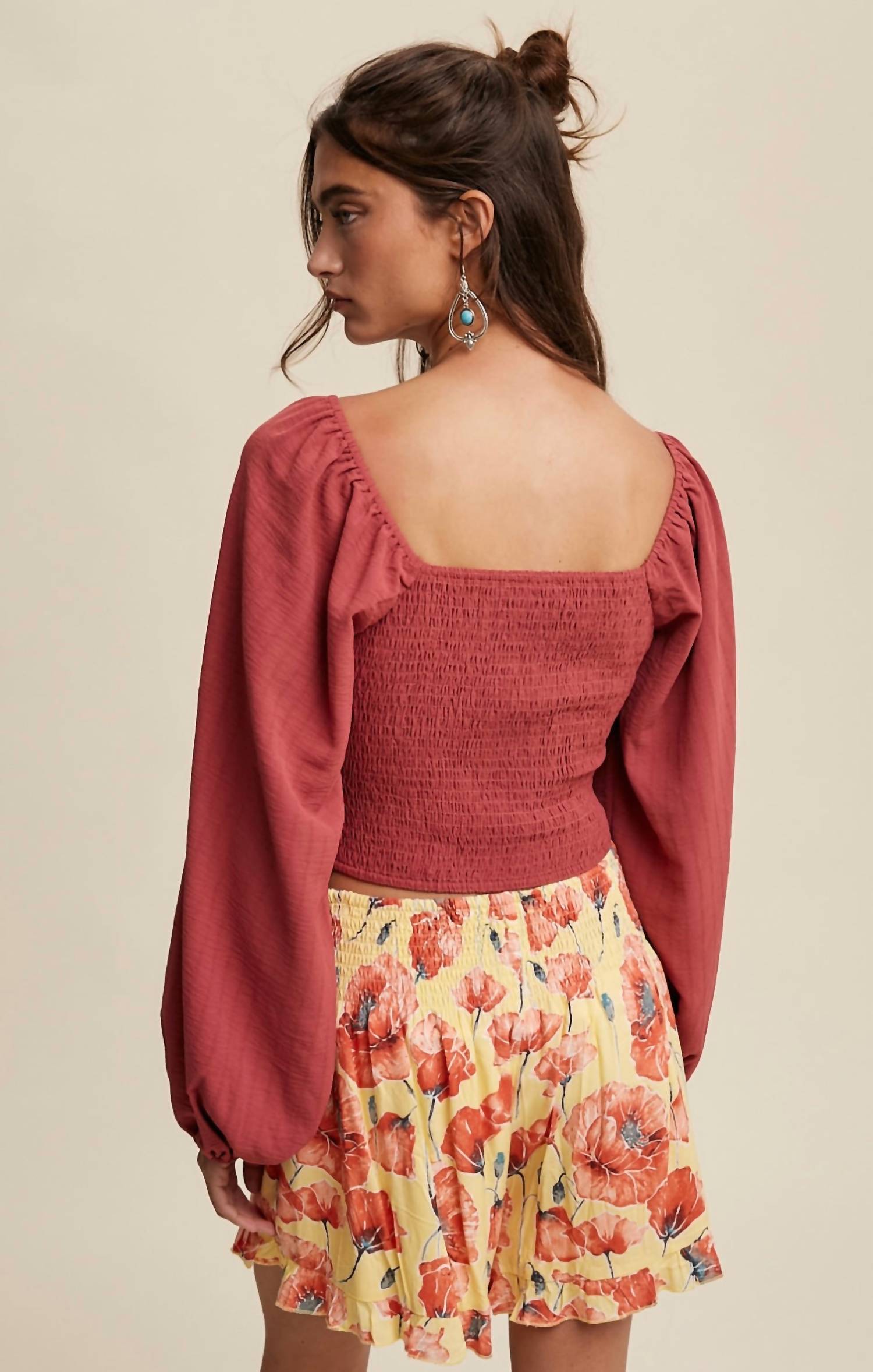 A long sleeve top you can wear with denim, skirts, well... just about anything! Introducing the Smocked Square Neck Top by Listicle, a chic choice in deep rose that embodies elegance. With long puff sleeves and elastic cuffs, this top features a smocked bodice and neckline for a flattering fit. Crafted with a square neck design and a clean hem, closure is a simple pull on style. Care instructions include hand wash and line dry for best results, perfect for your next vacation or Thanksgiving gathering. Model is 5'7" with measurements 31-24-35, wearing a size small.