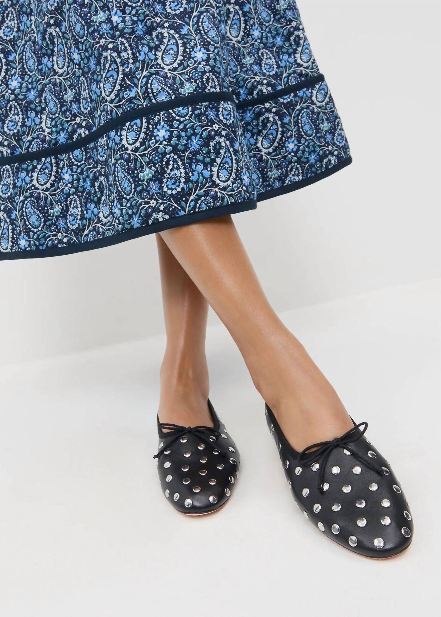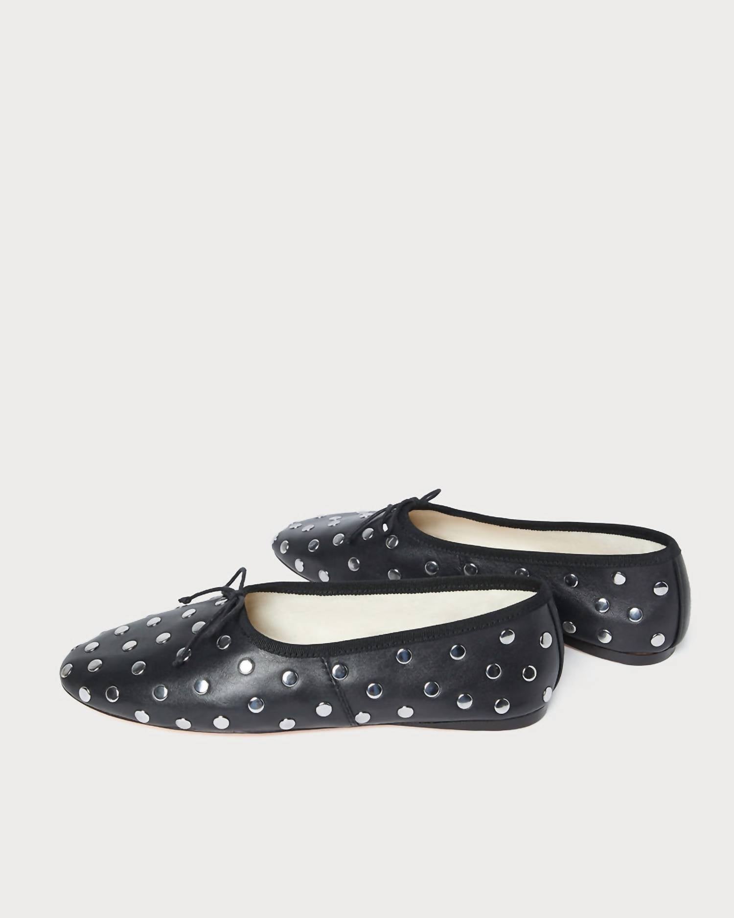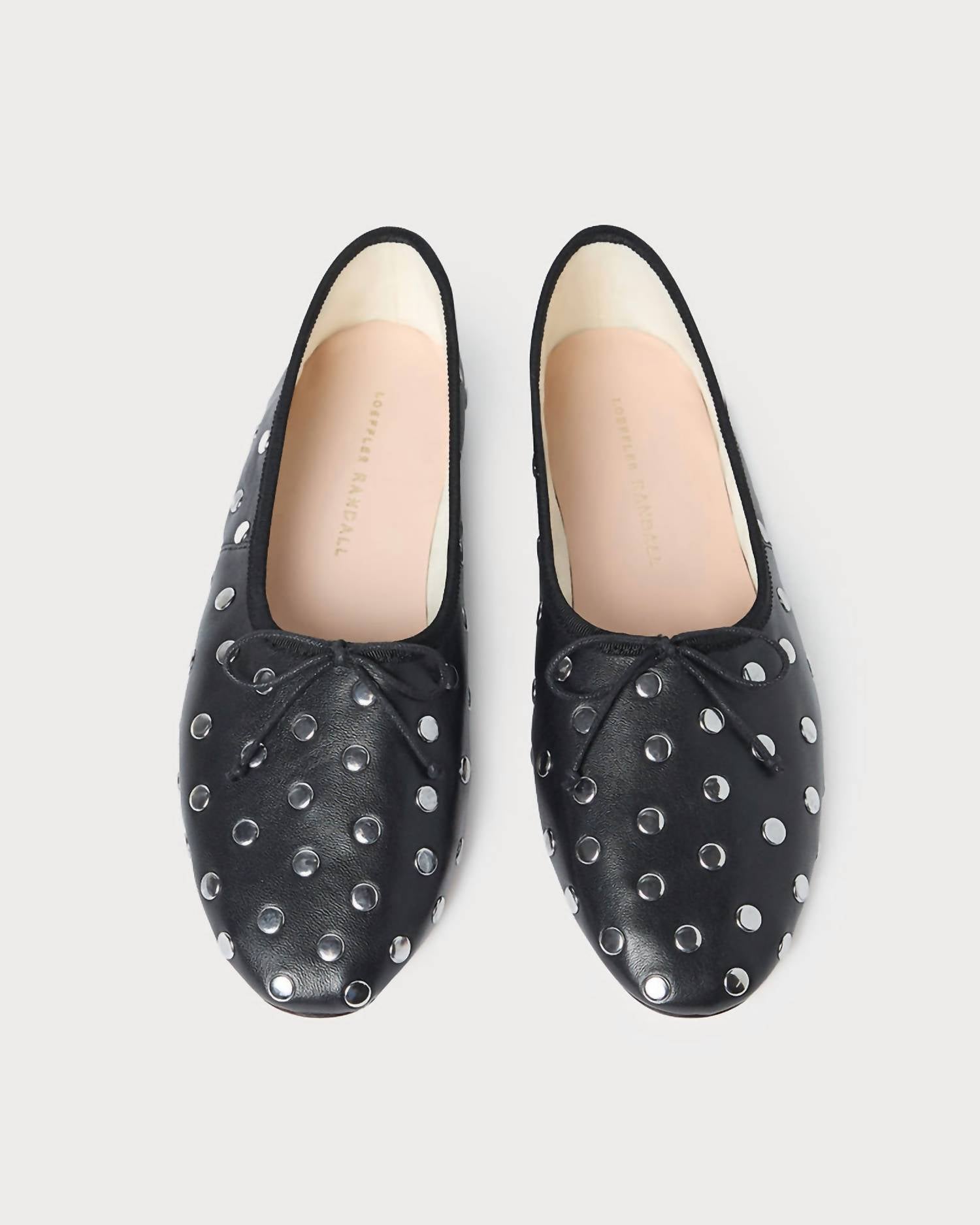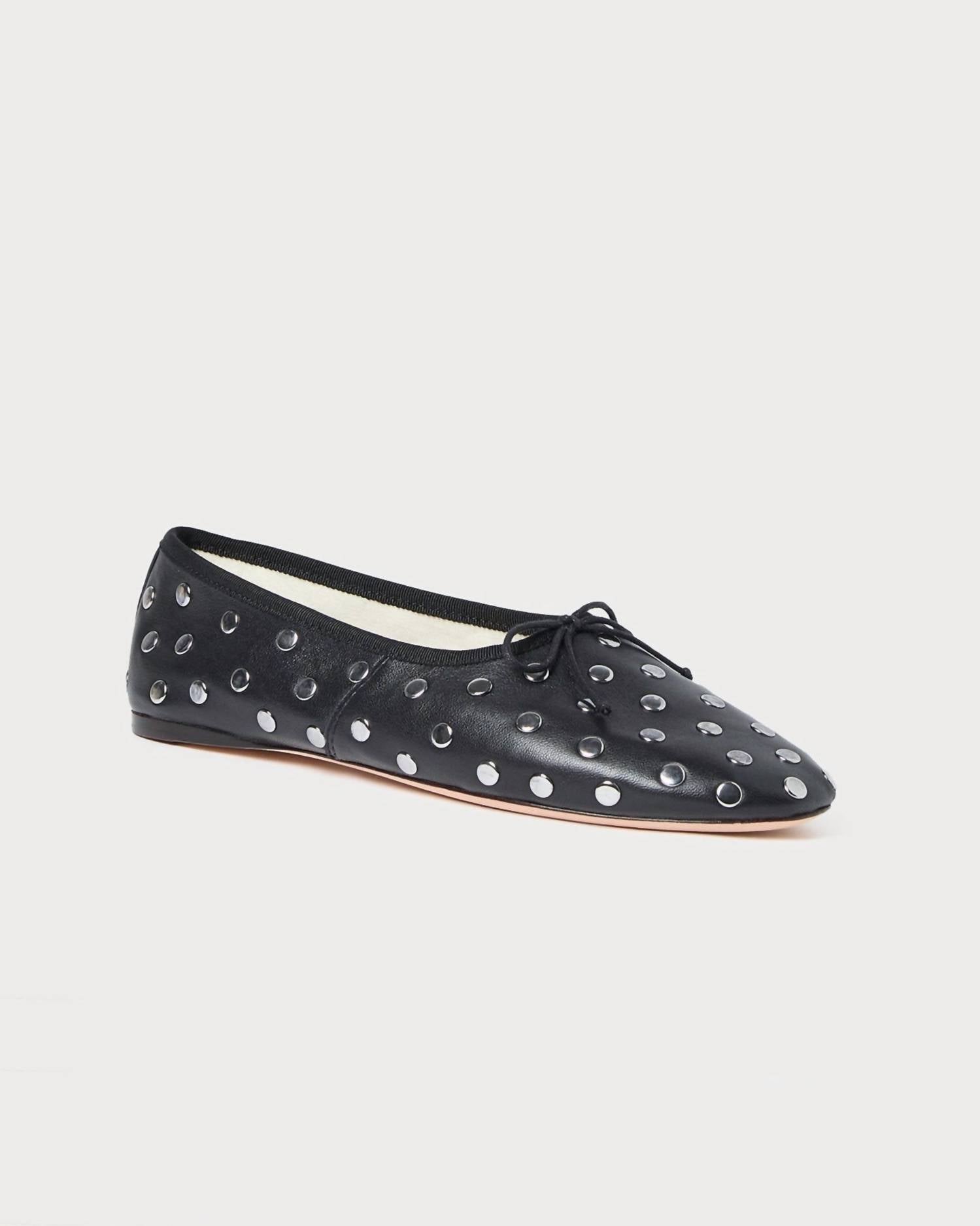 A preppy yet feminine take on the classic loafer. Step into elegance with Loeffler Randall's Women's Landon Soft Ballet Flats in Black/Silver, crafted from luxurious Italian nappa leather. These sophisticated flats showcase stylish nickel studs and a charming bow, complemented by a padded leather footbed featuring a gold-stamped logo for enduring comfort. With a sleek almond toe and convenient slip-on design, they are perfect for all-day wear. Made with an upper of 100% Lamb Leather and an outsole of 100% Bovine Leather, these flats are best refurbished seasonally to maintain their exquisite appearance.