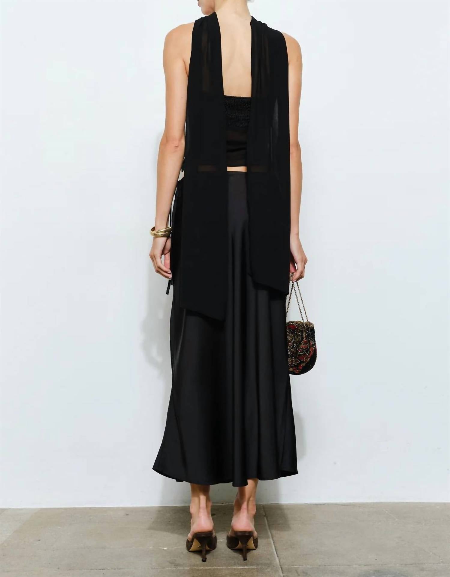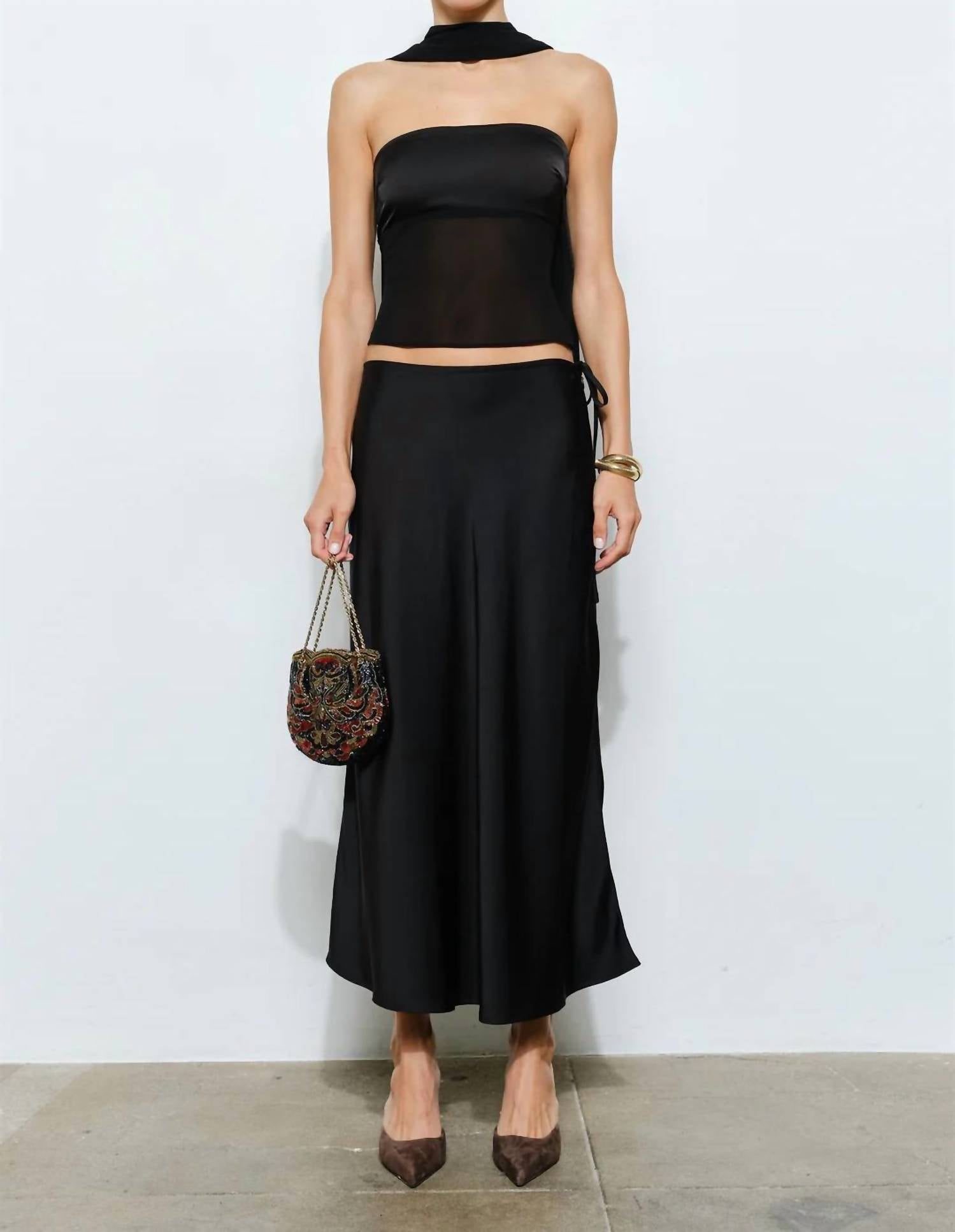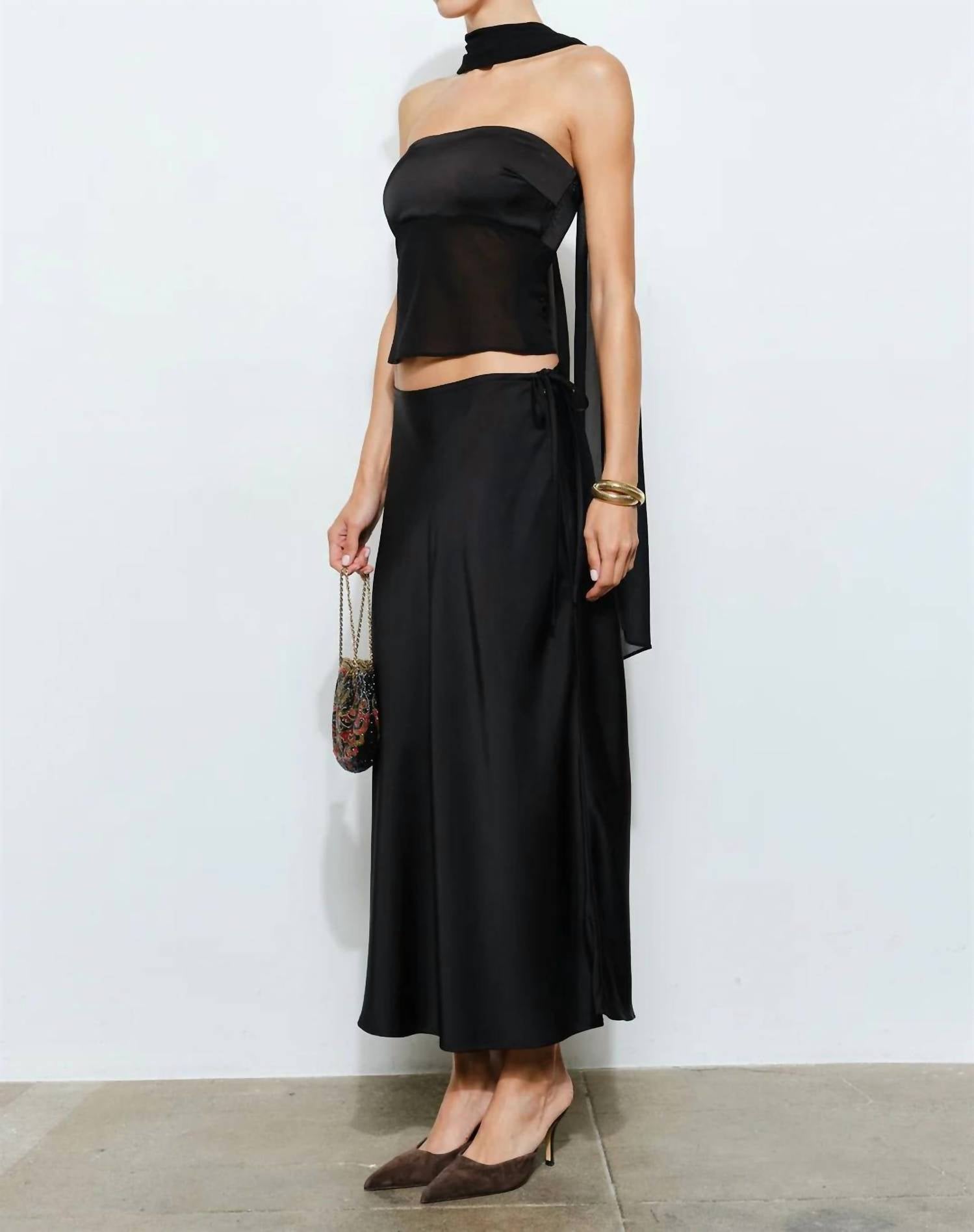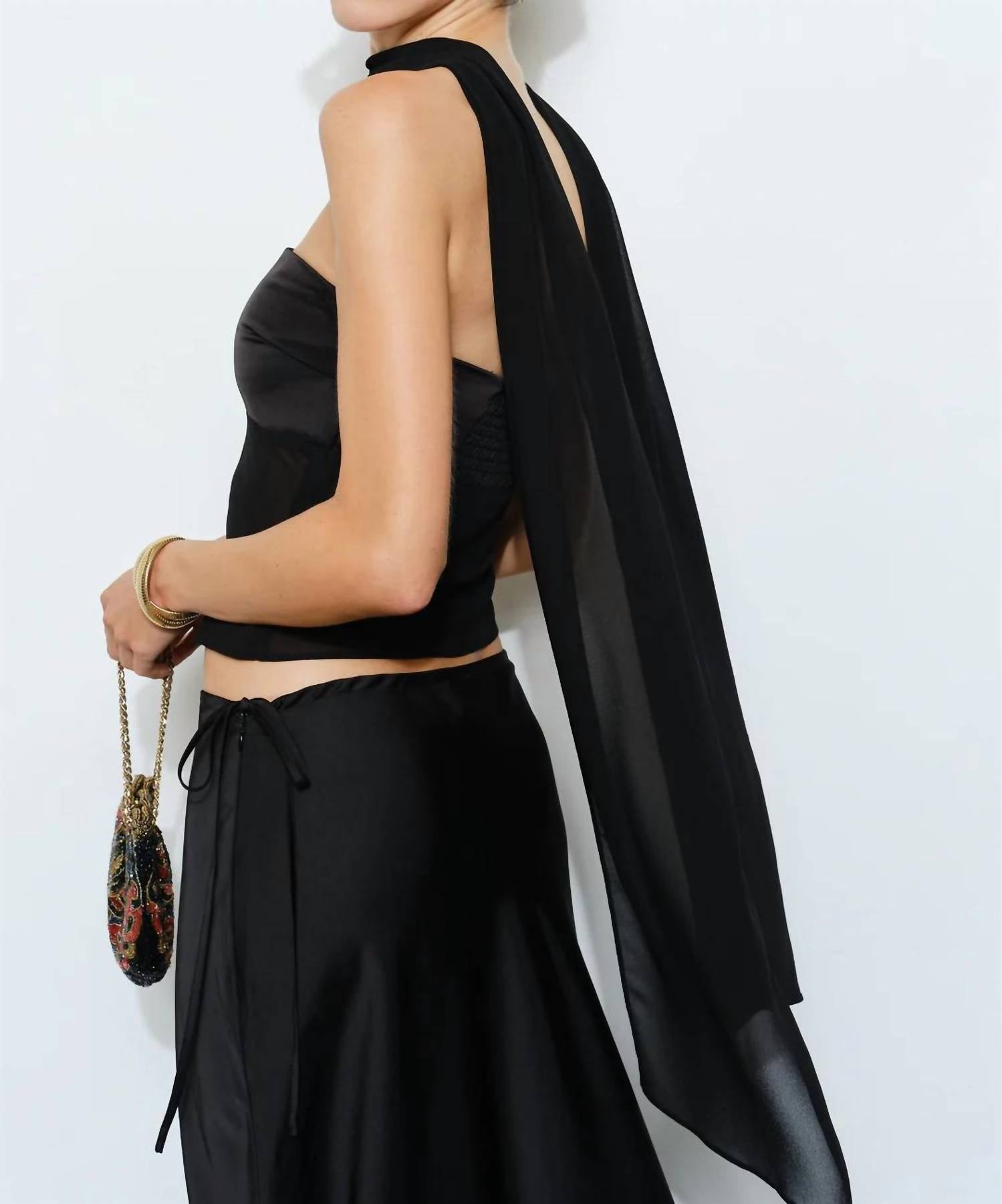 The perfect crop top for those warmer weather days. Introducing the Calliope Strapless Scarf Top by Loucia, a chic addition to your evening wardrobe. This strapless black crop top features a sumptuous satin bodice paired with sheer chiffon detailing for a touch of understated glamour. With its versatile self-tie scarf, you can adapt the look to suit your mood, whether draped elegantly at the neckline or flowing gracefully. Composition: Bodice – 45% Rayon, 55% Polyester; Lining – 100% Polyester, perfect for a stylish summer dinner party.