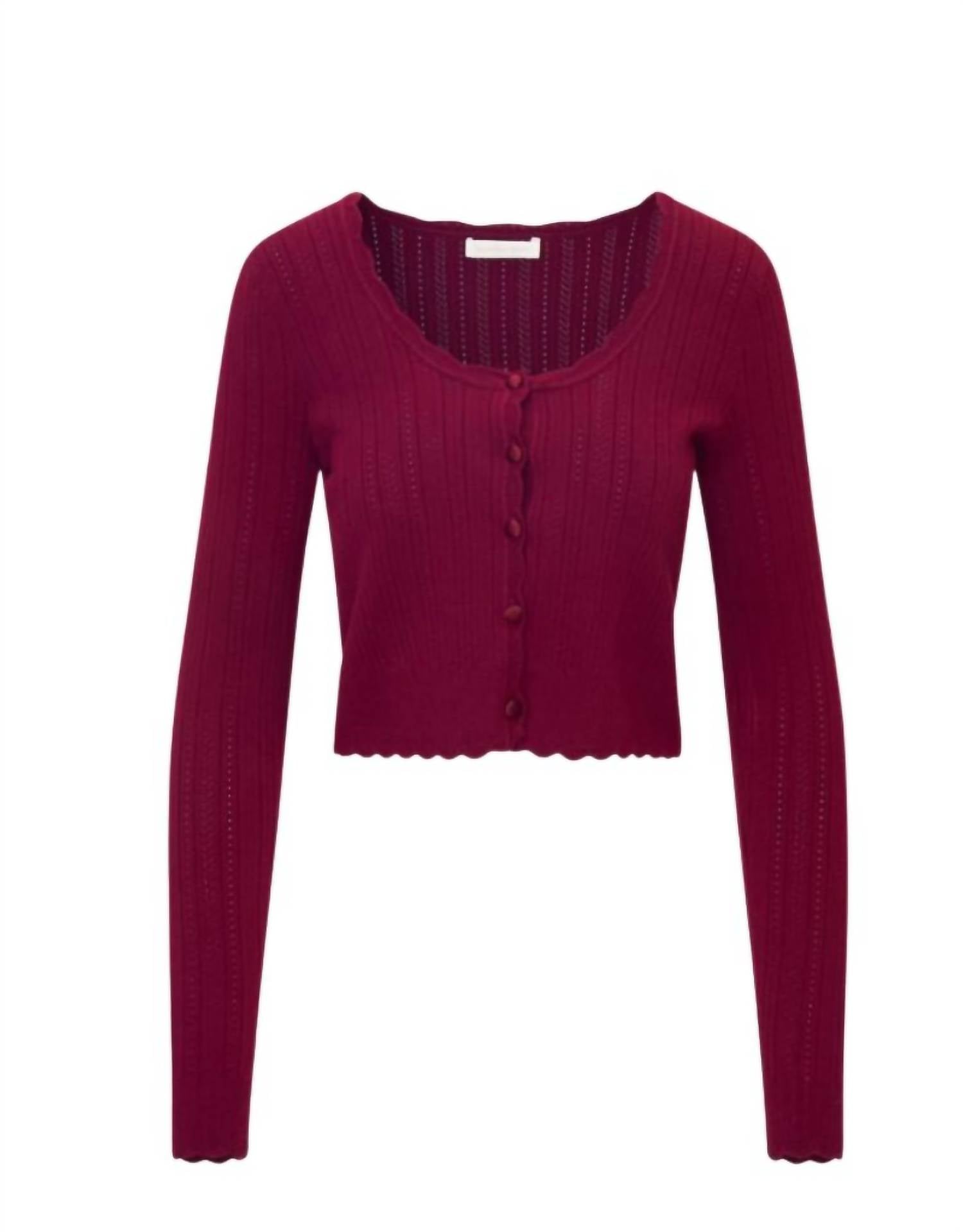 Throw this adorable cardigan over any cami or tank top. Elevate your spring wardrobe with the Martti Stretch Pointelle Cardigan from LoveShackFancy, designed in a rich Spiced Berry hue. Crafted with long sleeves and a luxurious blend of 82% Viscose and 18% Polyester, this cardigan showcases a flattering scoop neckline and features custom shell buttons down the front. Closure: Button closure. For care, hand wash in cold water, lay flat to dry, and cool iron if needed.