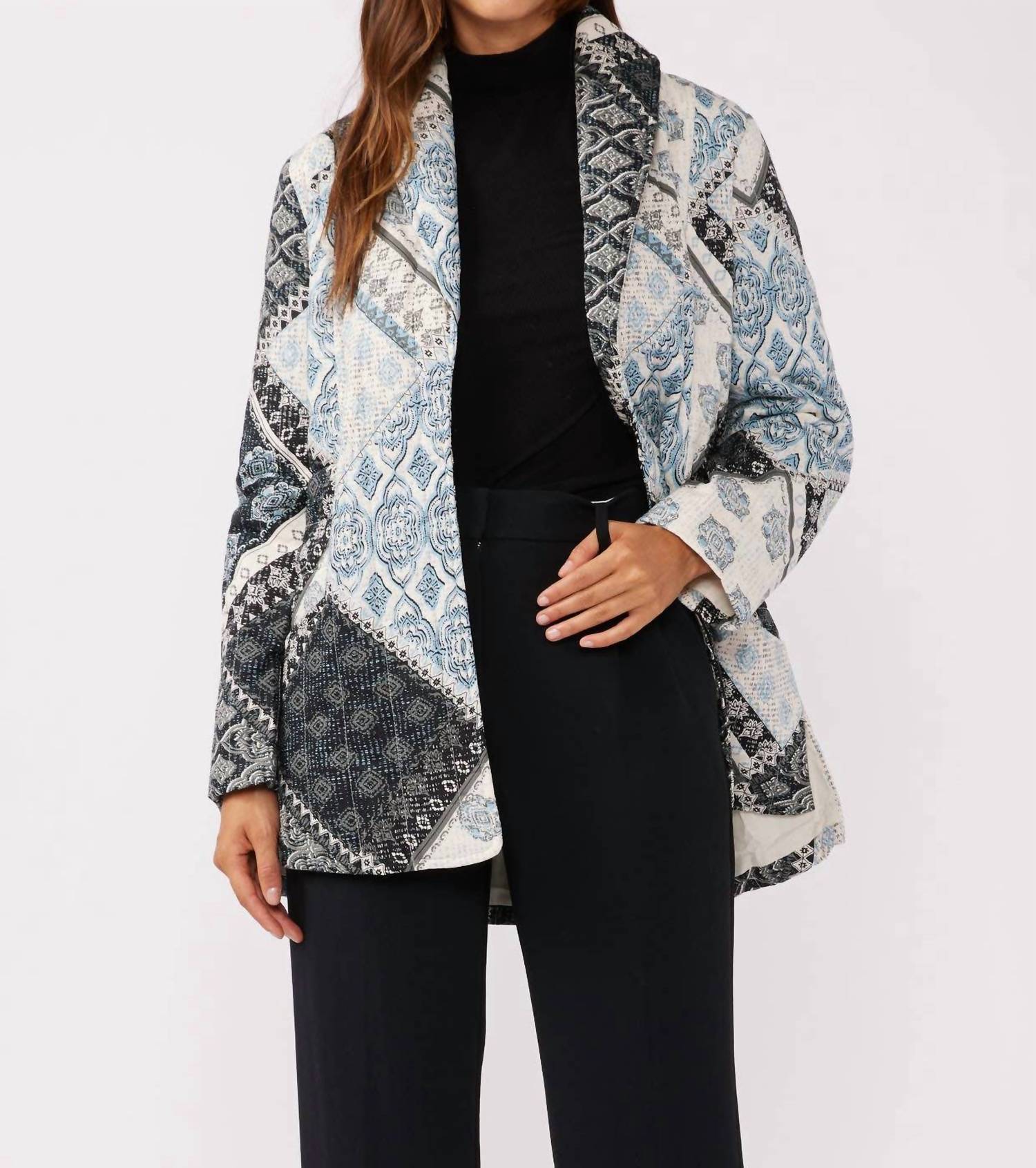 A casual yet cool jacket that every closset needs. Step into the season with the Quilted Patchwork Shawl Collar Jacket by LOVESTITCH, a standout piece in a natural and blue patterned design. This casual jacket features a V-neck with a shawl collar, long sleeves, and a stylish tie closure for an adjustable fit. Thoughtfully designed with side pockets, it is the perfect lightweight bohemian addition to your travel wardrobe. Care for this maximalist statement piece by hand washing and laying flat to dry.