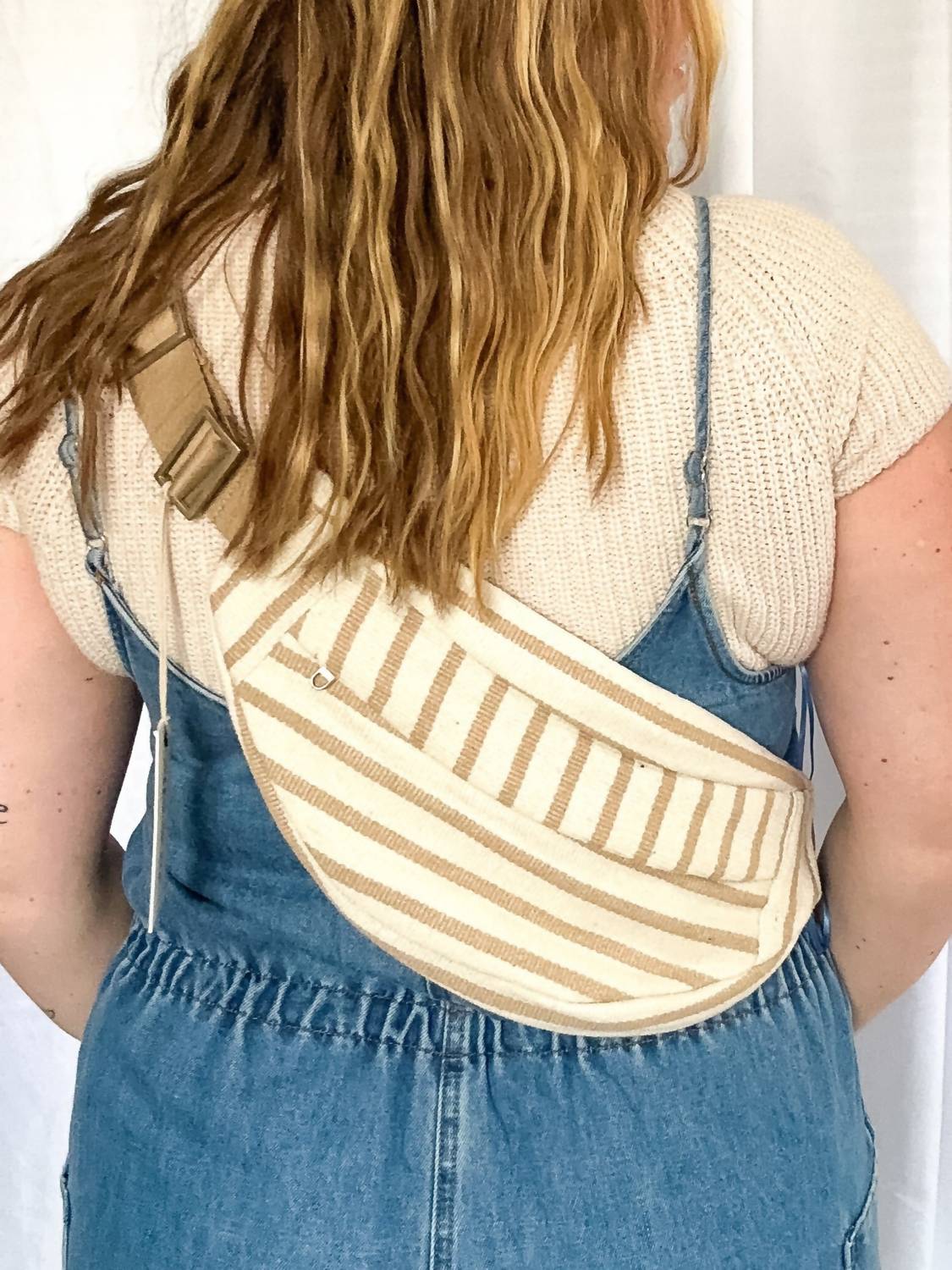 The crossbody bag is a trend that is here to stay and we especially love this style. Discover the Women's Nahla Stripe Sling Bag by Lu & Elle, crafted for both style and practicality. This crossbody bag in tan and white is made from 100% cotton and features a neutral stripe design for added elegance. It comes with an adjustable nylon shoulder strap, nylon zipper closures for security, and convenient front and back pockets. The metal hardware adds a refined touch, complementing its versatile design.