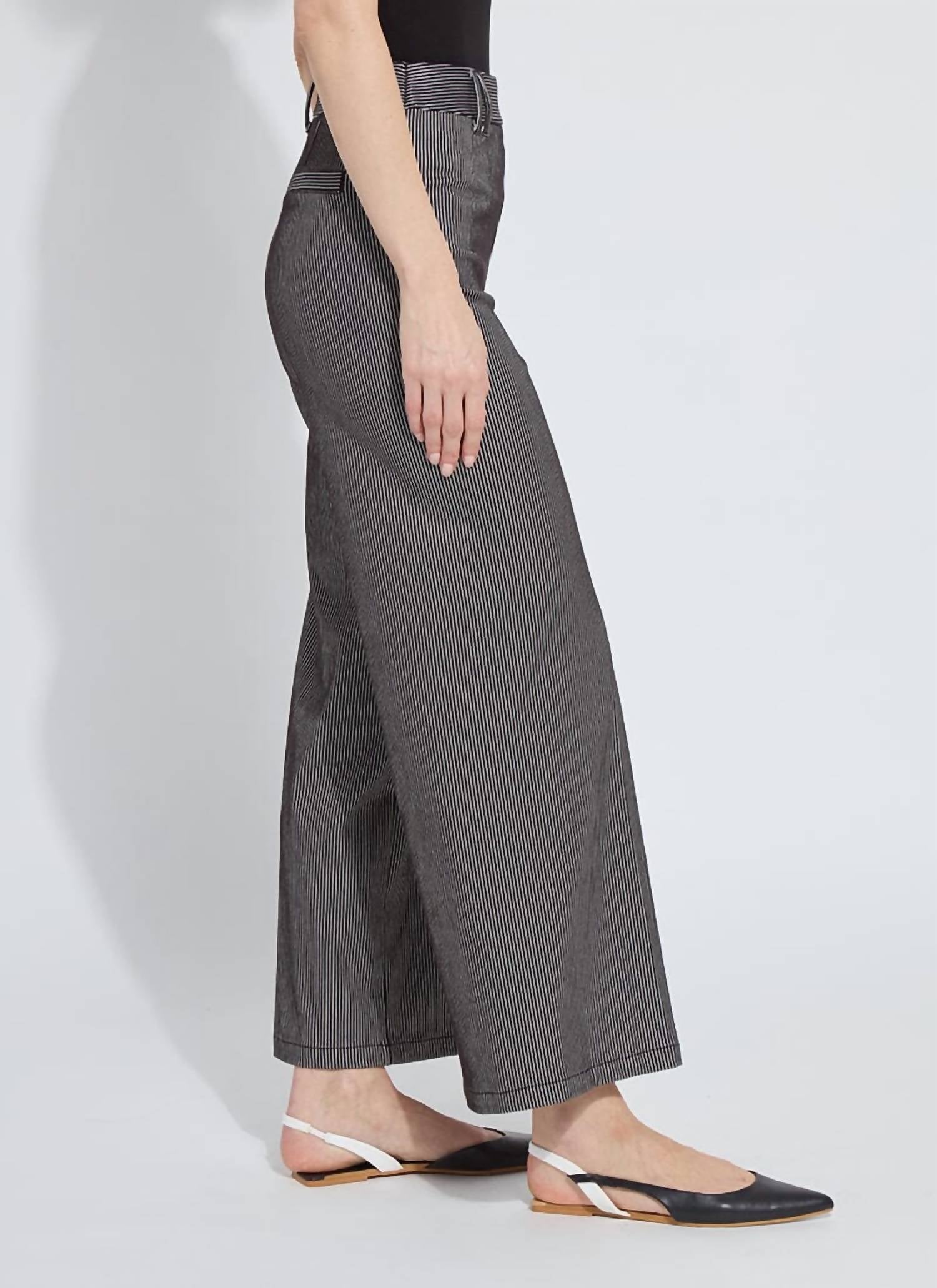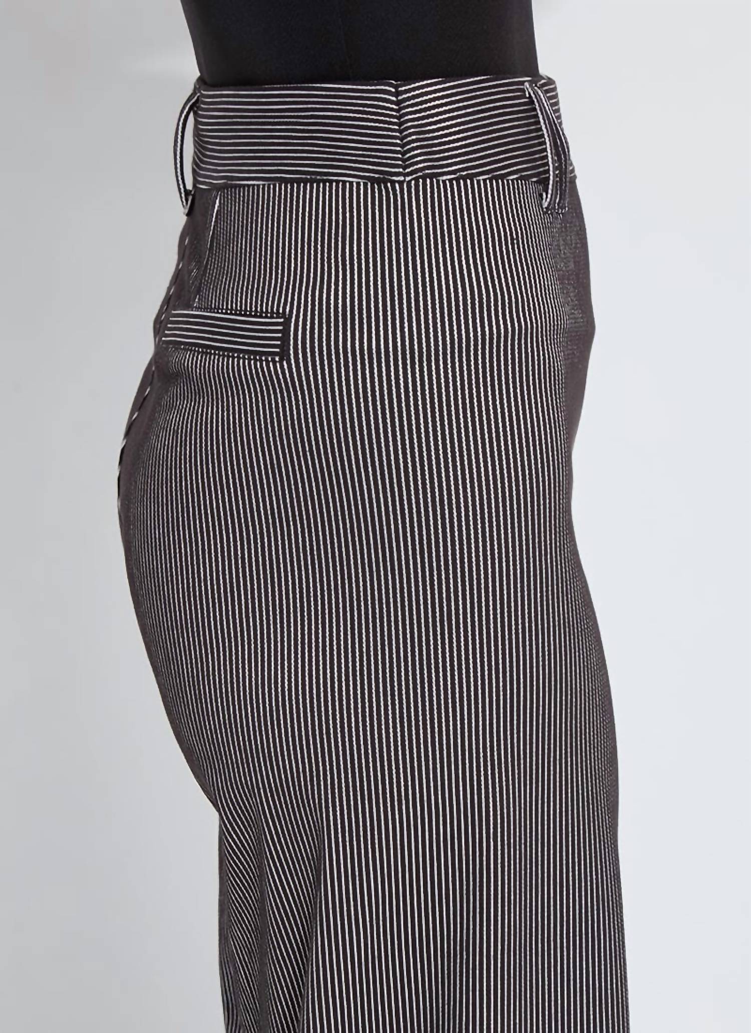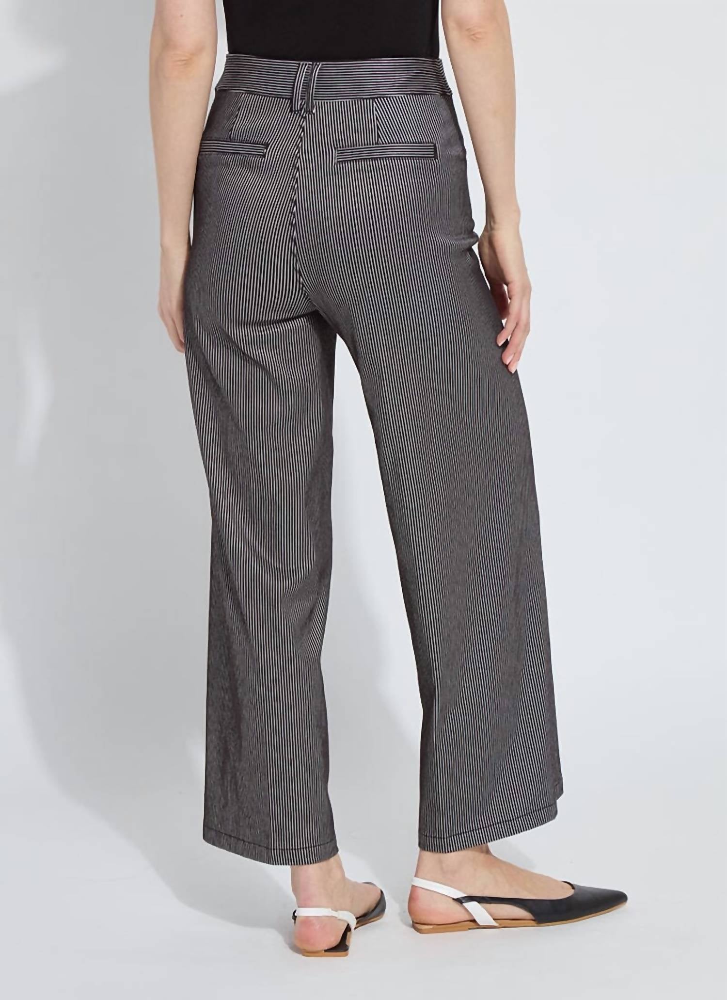 Elevate your ensemble with the Darlene High Waist Wide Leg Trouser by Lysse, crafted in a striking black with an iridescent sheen thanks to high shine polyester threading. Designed with a soft drapey feel and a small front pintuck detail, these trousers offer a relaxed fit and faux back pockets for a polished look. The garment-washed knit denim and patented stretch waistband ensure comfort and style, making these trousers perfect for occasions from workwear to holiday parties. Care instructions include hand wash and line dry to maintain the luxurious feel.