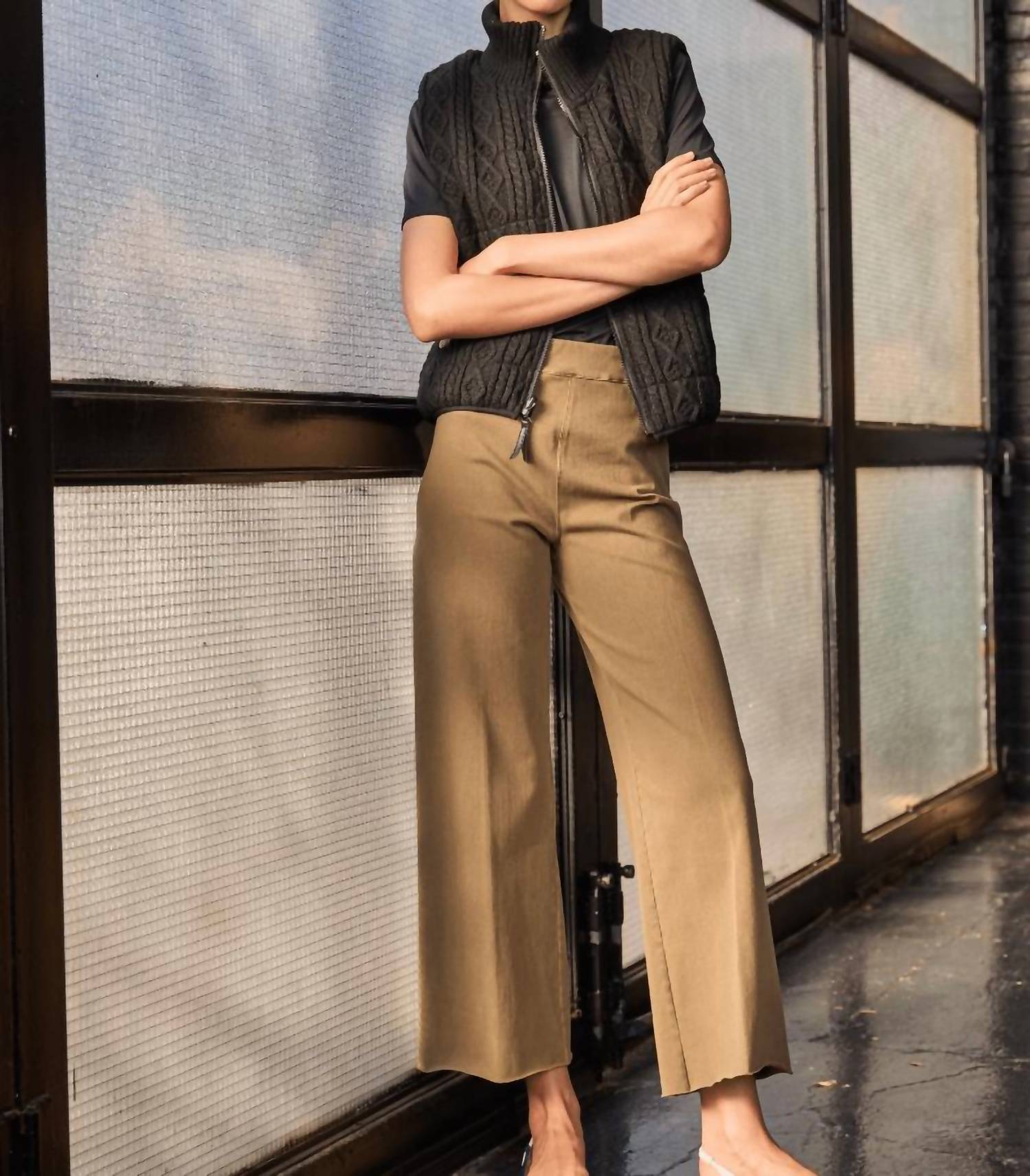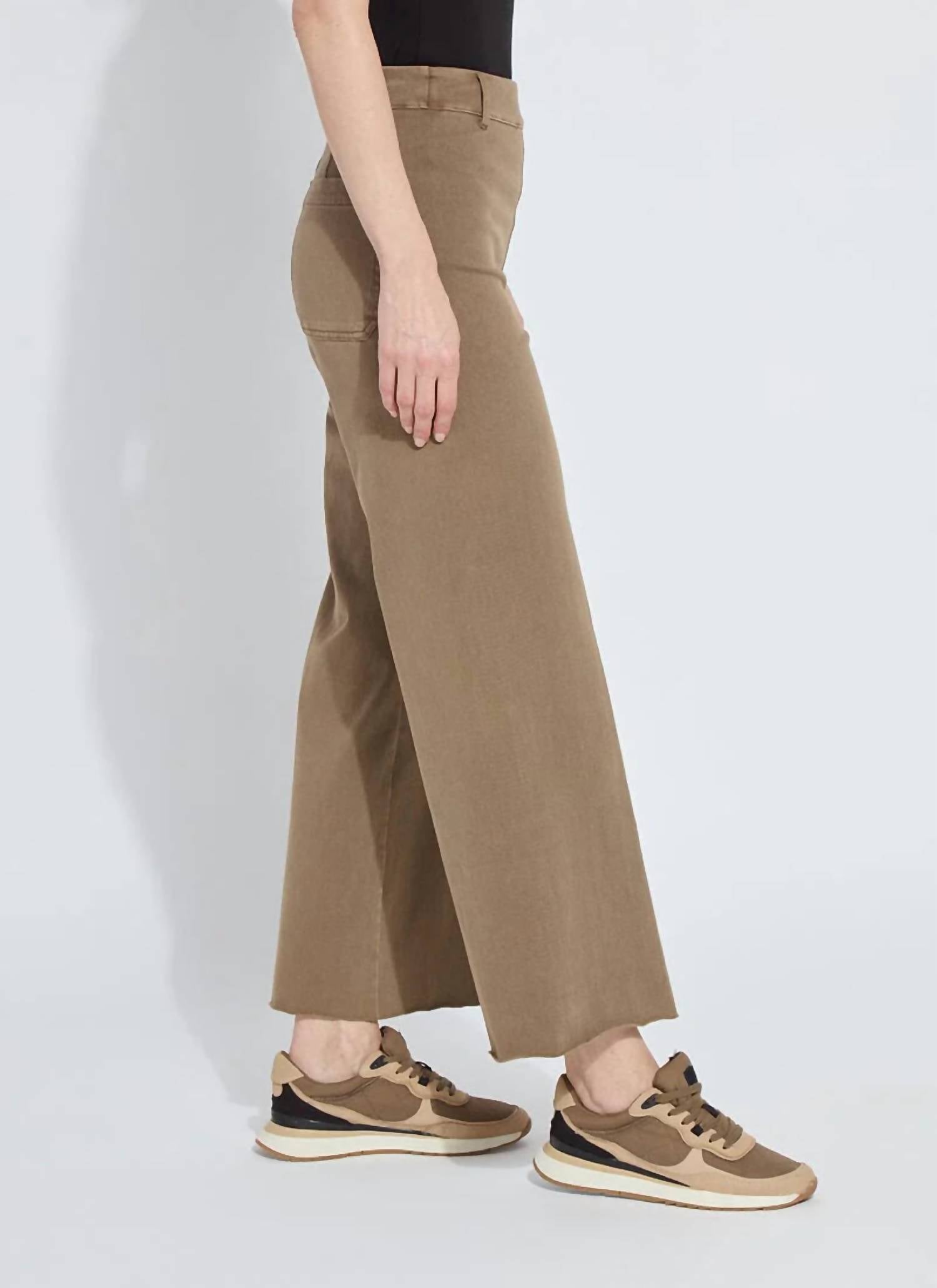 Introducing the Erin Wide Leg Denim by Lysse, a standout piece in a smoked olive antique wash. These wide-leg pants feature a cropped ankle length with a raw hem and are designed with a concealed patented waistband for a flattering fit. Made from a 4-way stretch knit denim composed of 95% Cotton and 5% Spandex, with a 28" inseam, they offer both comfort and style. Care instructions include machine washing and tumble drying, making them as easy to care for as they are to wear.