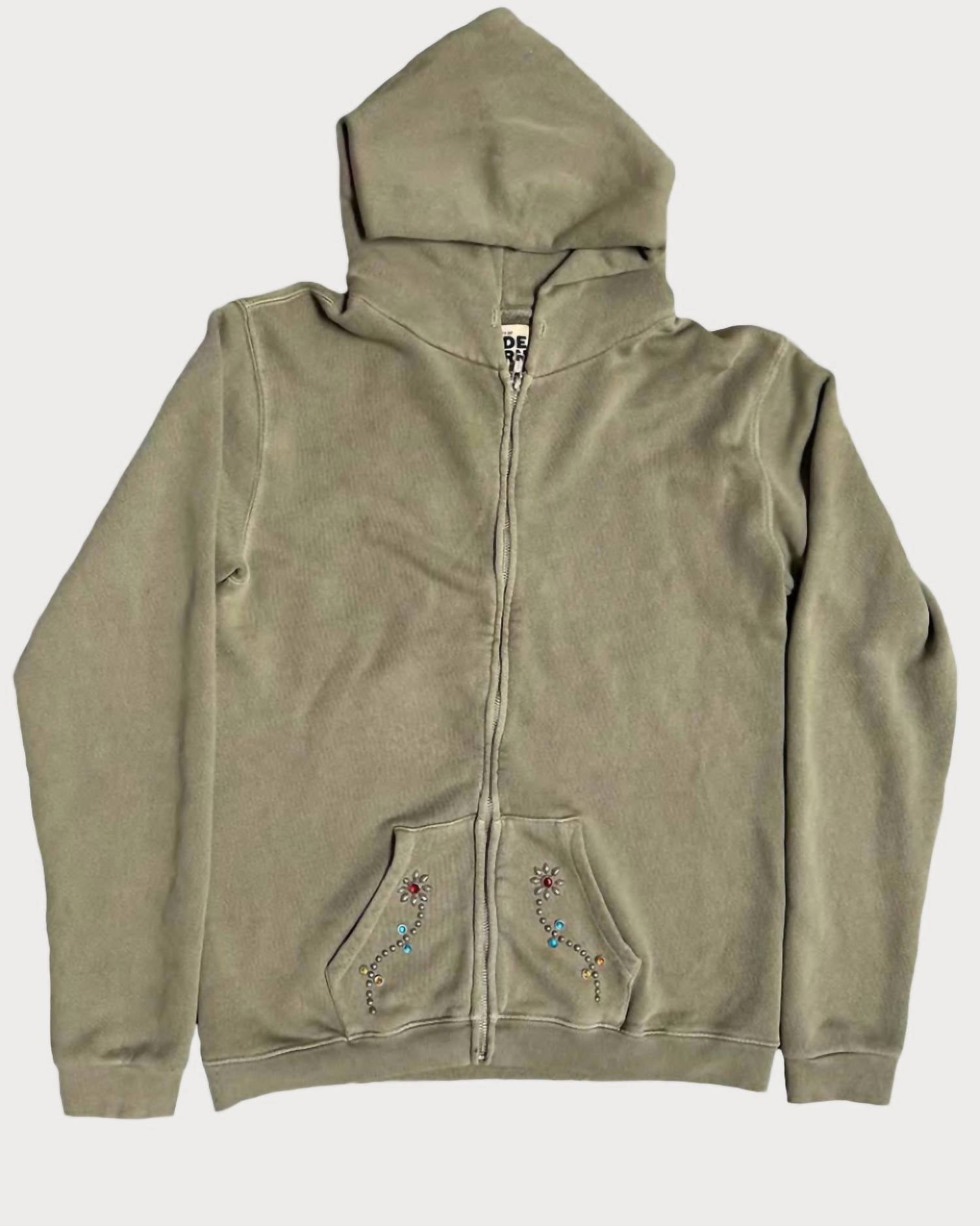 Cooler temps call for layering and we love this adorable sweatshirt for all the obvious reasons. The Women's Flower Power Hoodie by MadeWorn showcases a vintage athleisure style with long sleeves and a unique design in fatigue. Crafted from a 96% cotton and 4% polyester blend, it is made in the USA, featuring colorful rhinestone floral accents and an oversized studded peace sign on the back. This garment includes a convenient front zip closure with kangaroo pockets, making it both stylish and functional. Care for this piece by hand washing to maintain its signature hand-finished detail.