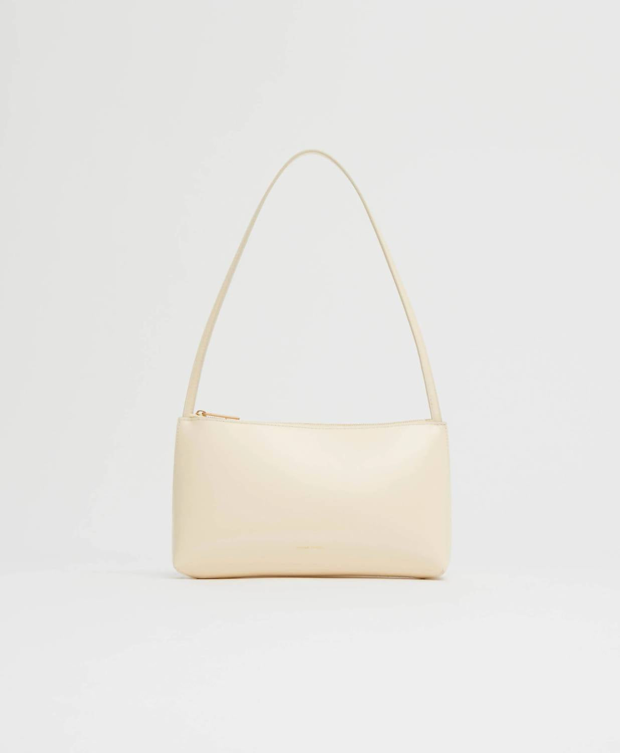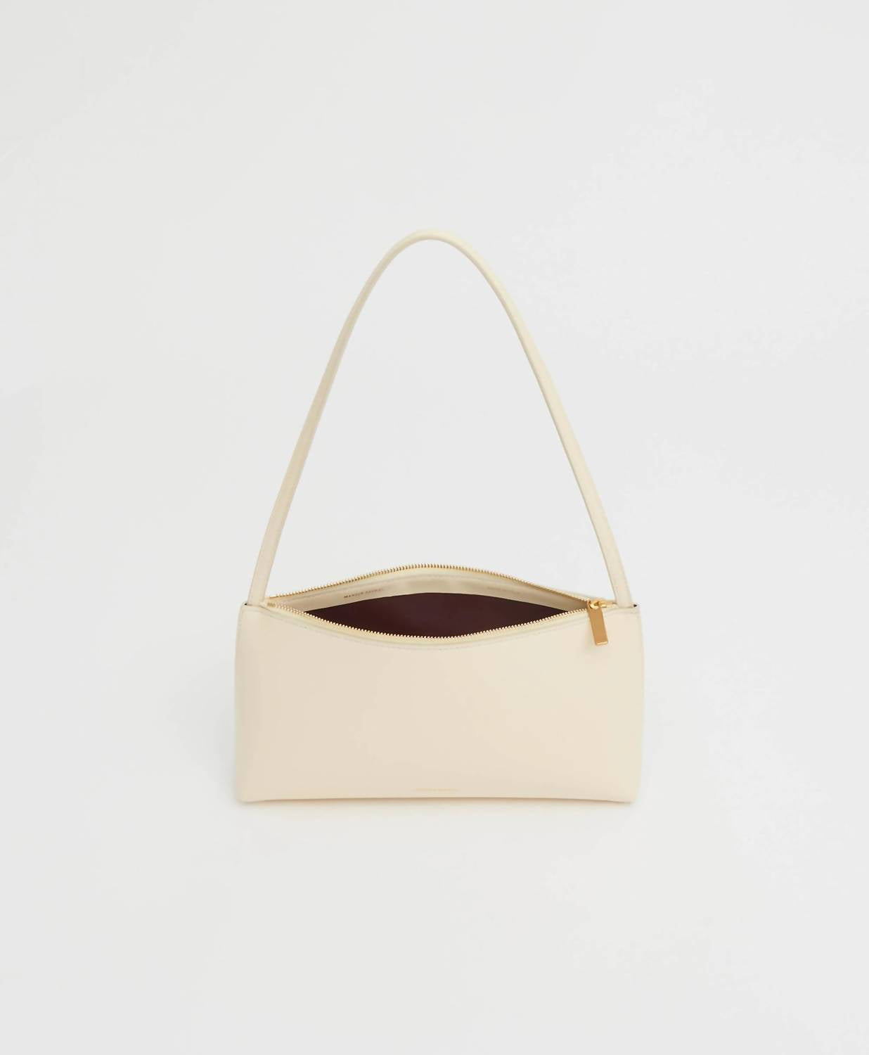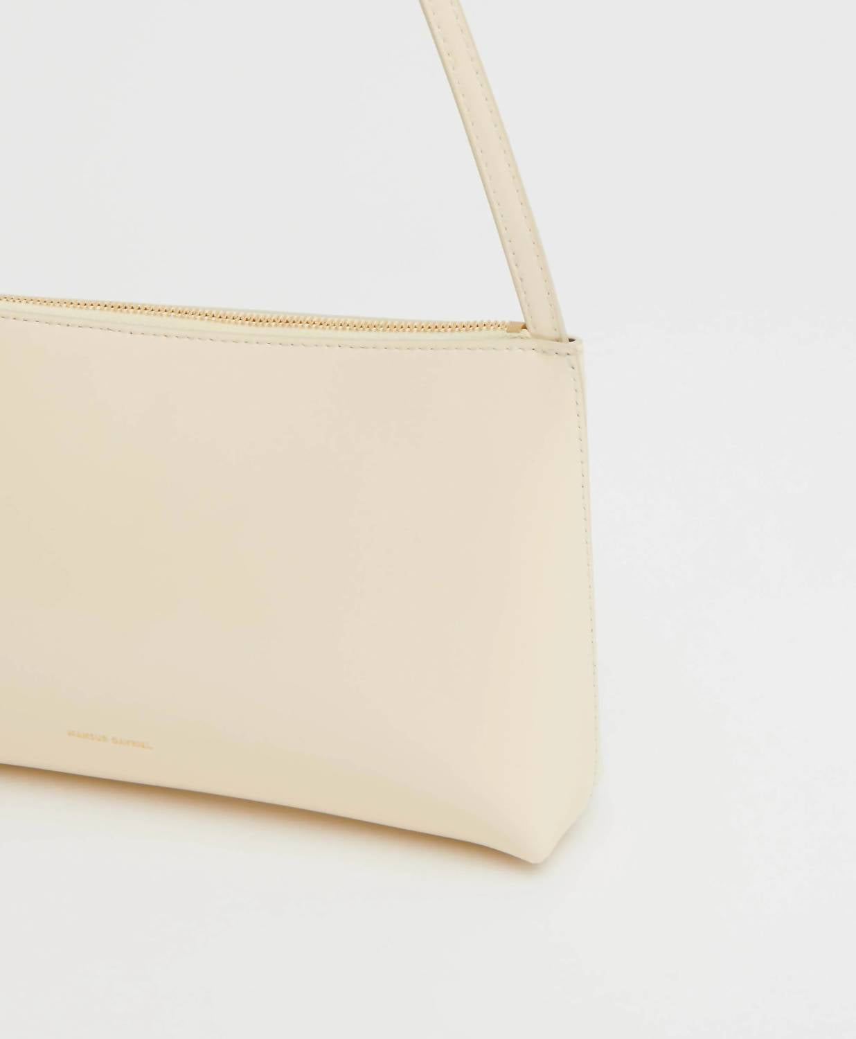Presenting the Women's Gaia Shoulder Bag by Mansur Gavriel in a sophisticated Crema hue, perfect for carrying your essentials in style. This slender accessory, crafted from 100% Italian Spazzolato Leather, features a polished shine and is renowned for its durability. The bag measures 9.5 inches in width, 5.5 inches in height, with a depth of 1.5 inches, complemented by a strap drop of 10.2 inches. Designed with a zipper closure and smooth coating lining, it is made in Italy and can be stored in its dust bag when not in use for longevity.
