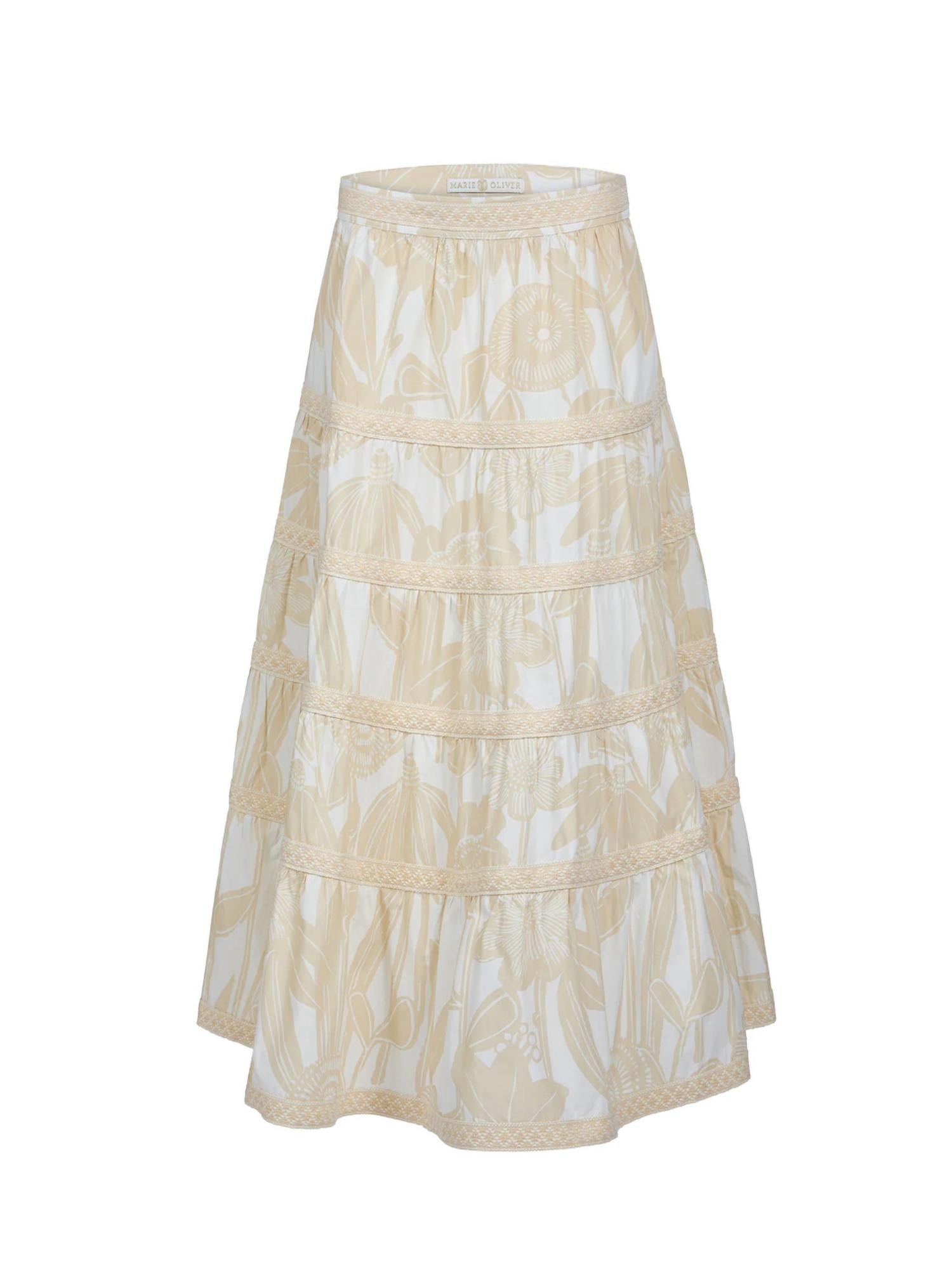 Discover the Blakely Skirt by Marie Oliver, a perfect blend of understated elegance and boho chic style. This A-line, full-length skirt sits at the natural waist and features a charming botanical pattern in cream and beige. Made from 100% cotton, it boasts embroidered trim details and a side seam invisible zipper with a hook and eye closure. Care is simple: machine wash on a gentle cycle and hang dry for best results.