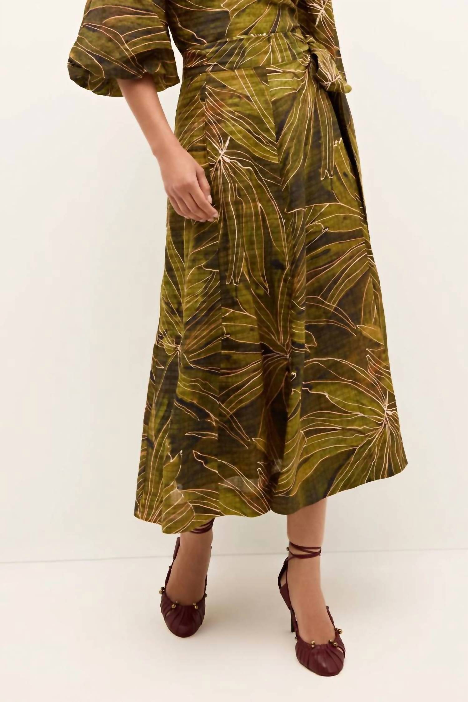 The midi length skirt is here to stay and we especially love this style. Introducing the Estine Midi Skirt by Marie Oliver, a Boho Chic addition to your spring wardrobe in the stunning Canopy color. This women's skirt is crafted from a blend of 56% Viscose and 44% Linen, ideal for vacation wear. The midi-length skirt features a stylish tie closure for a perfect fit. Patterned for an eye-catching look, it is recommended to dry clean only.