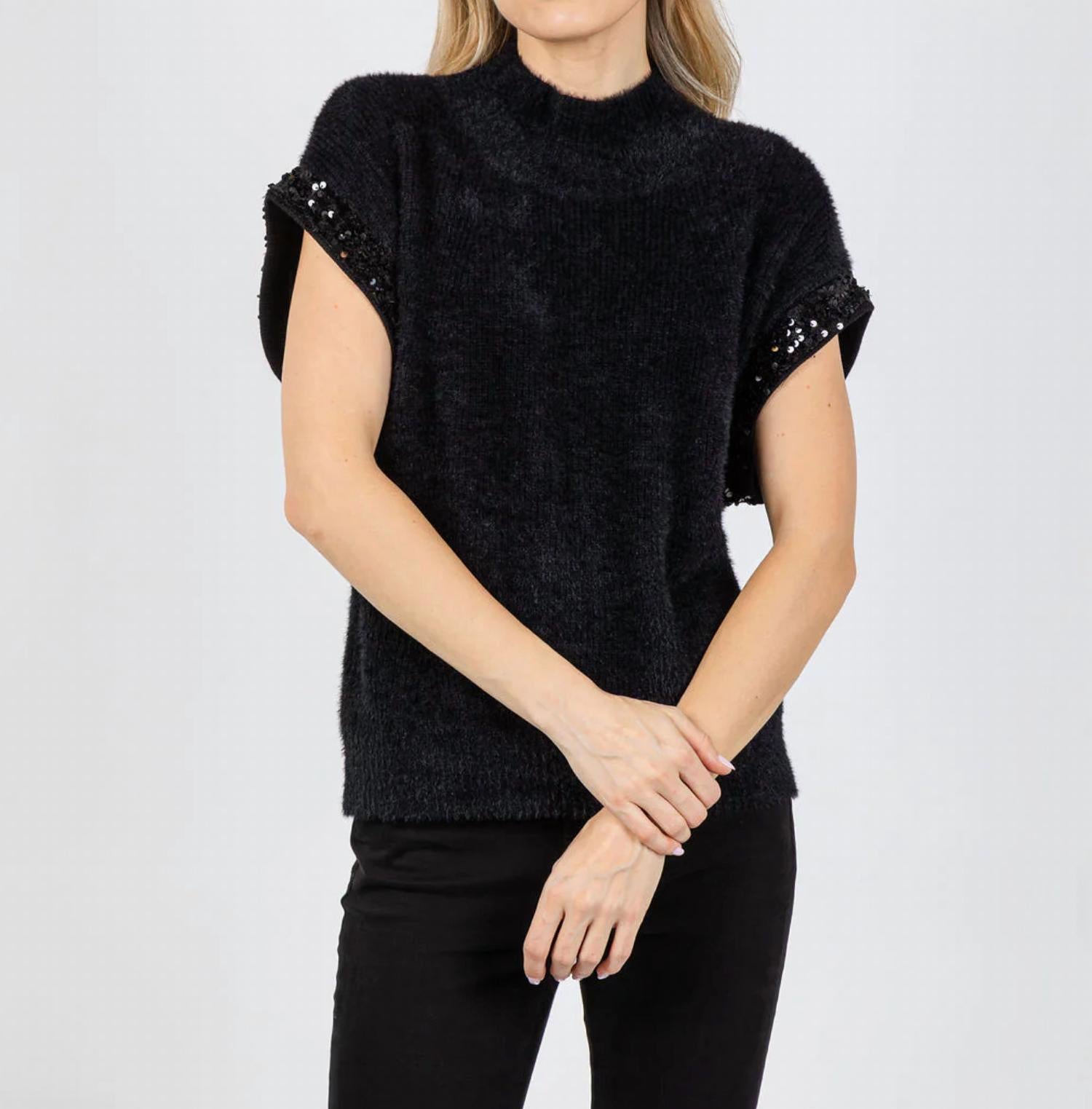 The ultimate go-to sweater, expertly crafted to provide the perfect combination of warmth and style. Its classic design and soft fabric make it a must-have addition to your wardrobe. Introducing the Yura Sweater Top by MELISSA NEPTON, designed to elevate your holiday wardrobe with its playful charm. This black knit top features short sequin sleeves that add a shimmering touch to any outfit. Crafted from polyamide with a textured, elegant eyelash finish, it offers a sophisticated look with a cozy feel. Closure: Pull-on. Perfect for festive gatherings or casual outings, this versatile piece promises comfort and glamour.