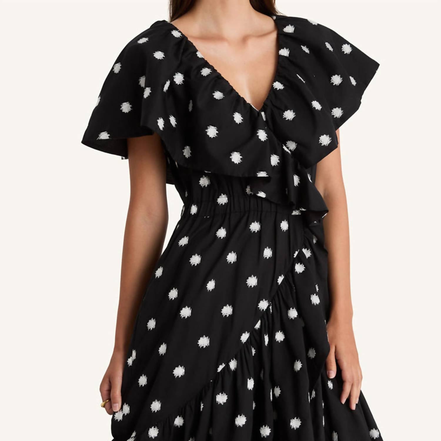Just add slides or mules and you are good to go. Introducing the Merlette Loris Midi Dress, a chic and fun addition to your wardrobe in an eye-catching black and white ikat pattern. This dress features short flutter sleeves and a flattering A-line silhouette with a V-neckline, enhancing its playful yet sophisticated vibe. Expertly crafted in 100% cotton, its timeless style makes it suitable for brunch or dinner outings. Care instructions: Hand wash. Ideal for engagement occasions or any spring event.