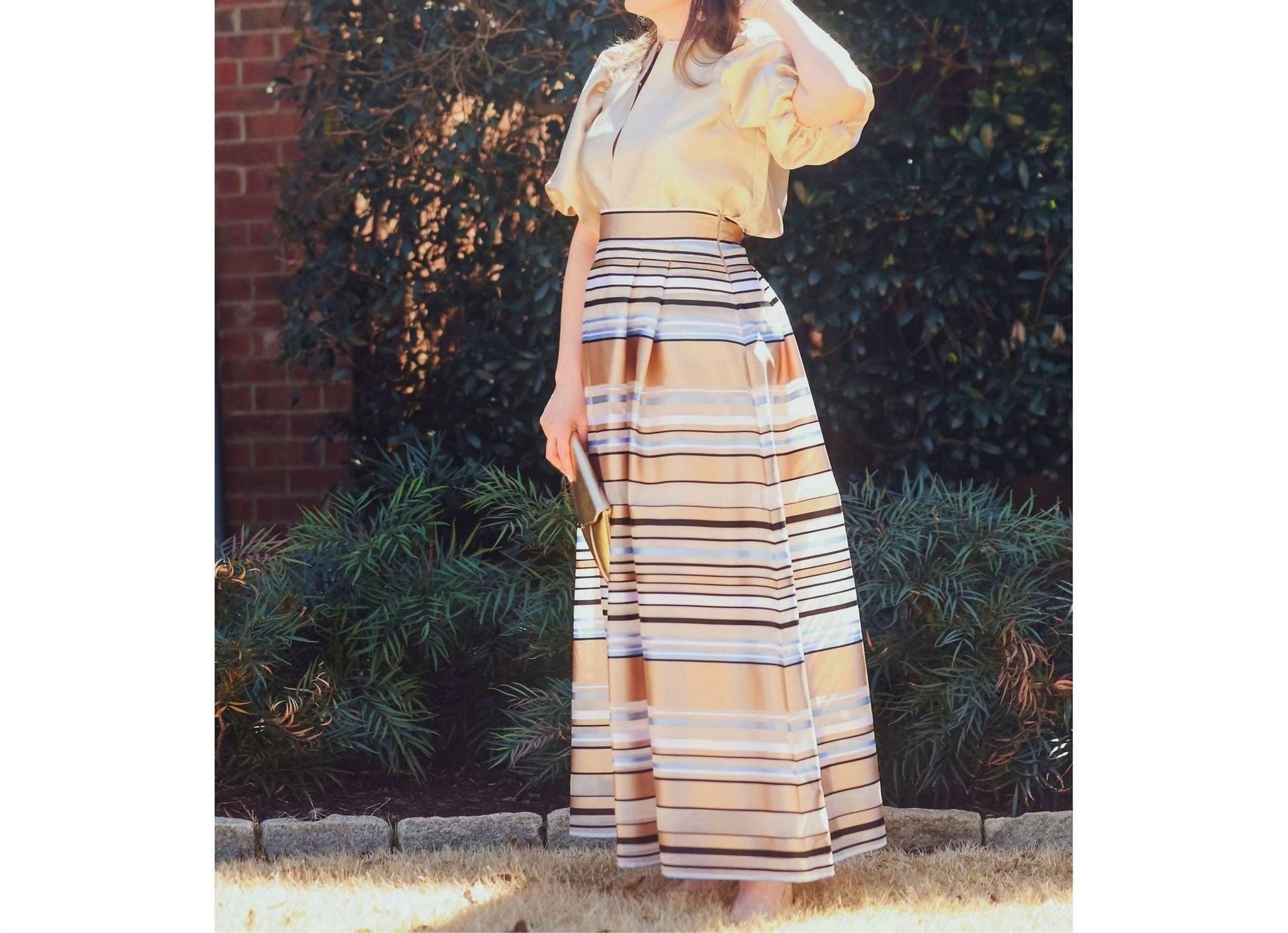 Who doesn't love a good maxi skirt? Introducing the Ribbon Stripe Maxi Skirt by Milva Mi, an elegant choice for your spring wardrobe. Crafted from a soft cotton blend, this skirt displays a chic stripe pattern in gold and blue. Designed with a convenient pull-on closure, this skirt offers a comfortable, pocket-free silhouette. Perfect for holiday parties and Thanksgiving gatherings, it captures a timeless vintage trend.