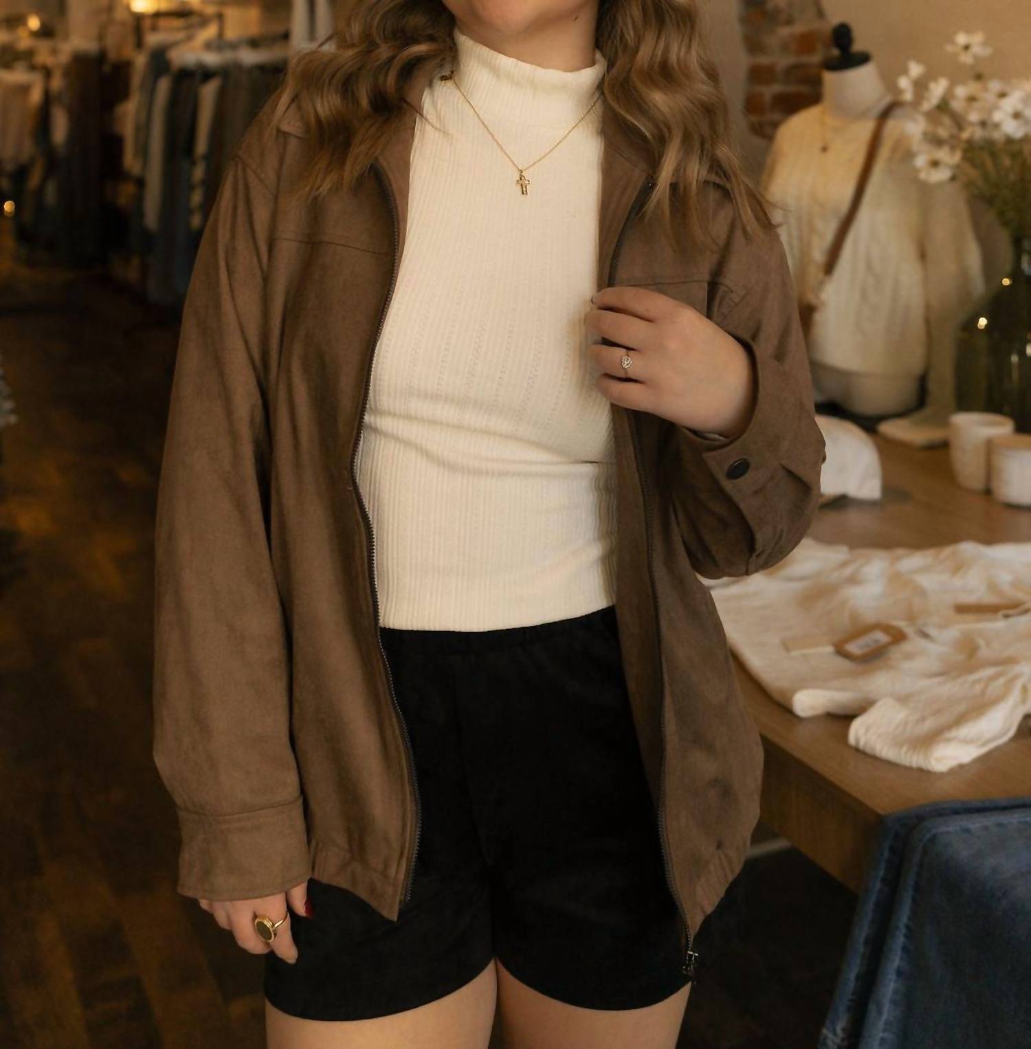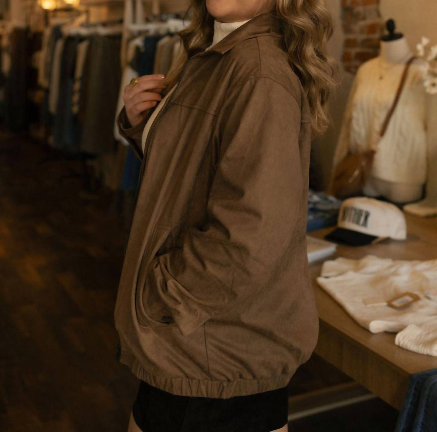 A riff on your favorite classic bomber jacket. Elevate your autumn wardrobe with the Brown Suede Oversized Bomber Jacket by MIOU MUSE, designed for stylish versatility. Crafted with long sleeves, this solid monochrome piece seamlessly blends 95% Polyester and 5% Spandex for comfort and durability. It features a classic collar and a practical zip closure, complemented by convenient pockets. Care instructions include machine wash and tumble dry, making it perfect for your Thanksgiving vacation look.