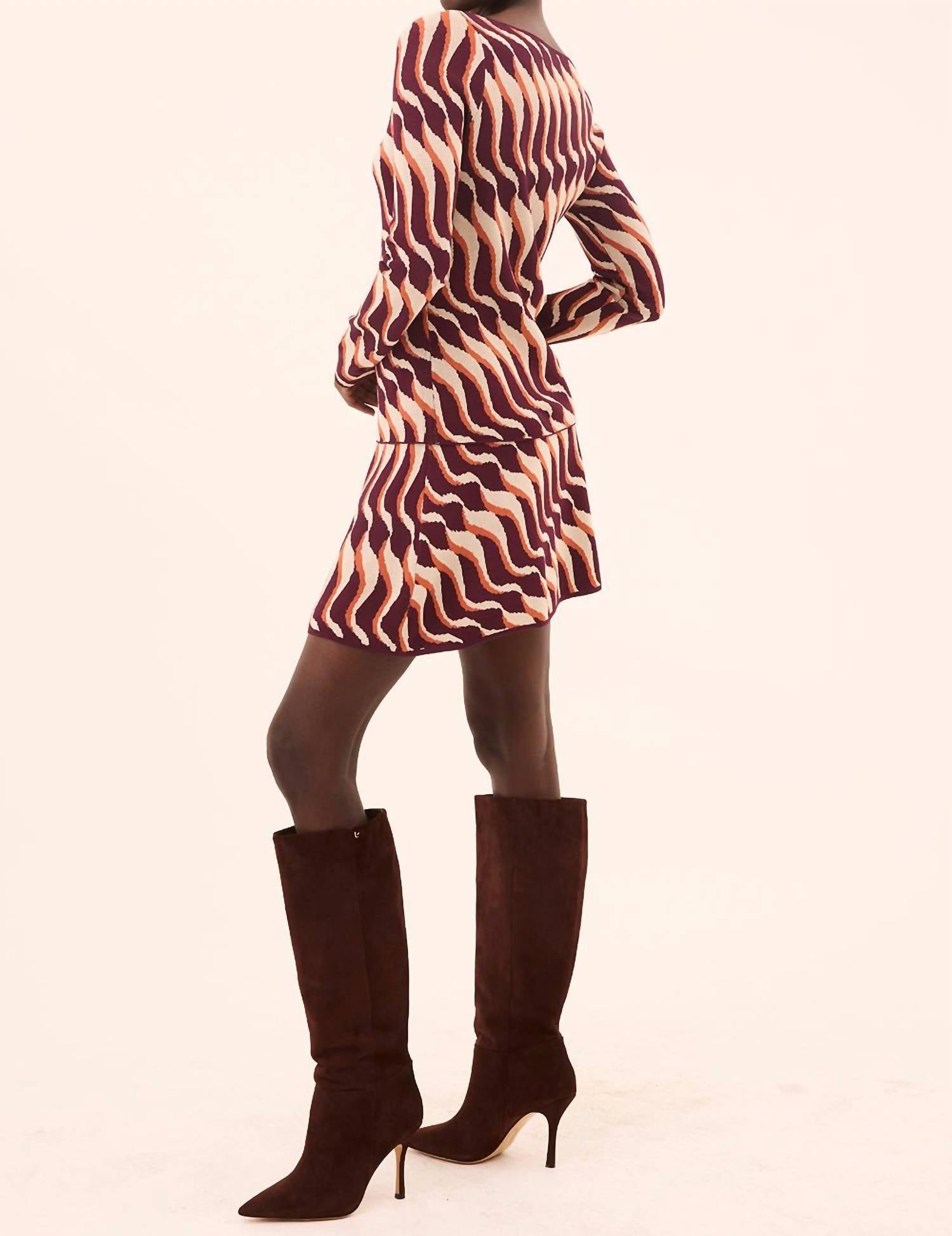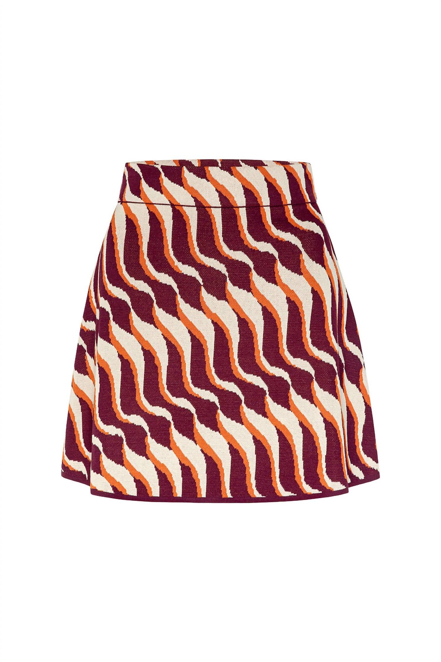 Tuck in your favorite tee for a more laid-back vibe. Elevate your wardrobe with the Orlie Skirt by Misa Los Angeles, crafted in a vibrant Autumnal Wave print to make a bold statement. This chic A-line mini skirt boasts an easy pull-on style, expertly crafted from a stretch jacquard knit for comfort and fit. Composition: 80% Viscose, 20% Nylon. Made in China. Care: Dry clean only. Model is wearing size XS (5'9" height, 30" bust, 23" waist, 34" hips).