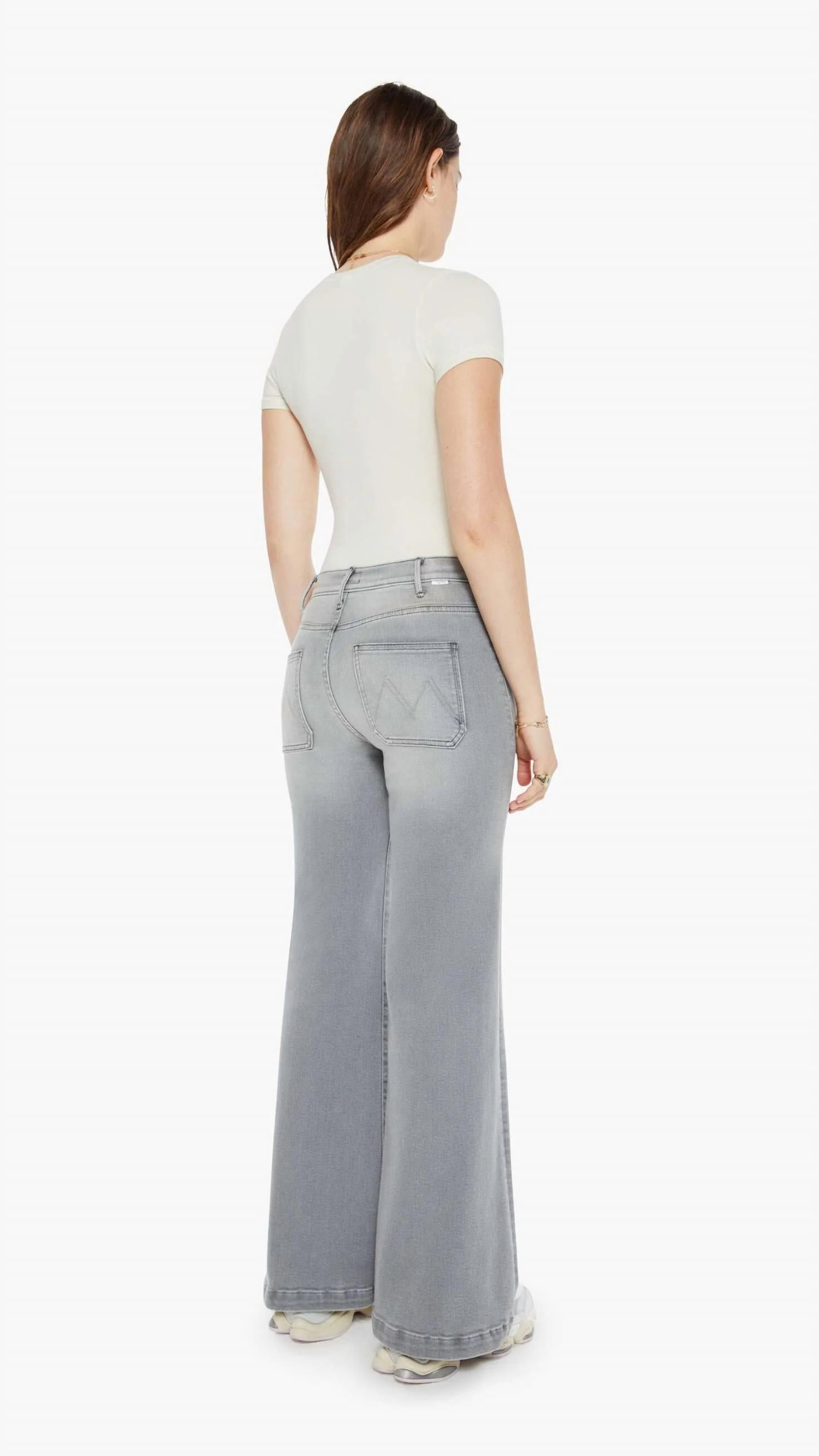 Pair these wide leg jeans with mules, slides or your favorite strappy sandals. Introducing the Hustler Roller Patch Sneak Wide Leg Jeans by Mother, a perfect nod to 90s fashion. These jeans feature a high-rise waist and a relaxed fit with wide legs and a 33-inch inseam, offering both comfort and style. Crafted from a cotton blend stretch denim, they come in a light wash faded grey known as Noted and include convenient patch pockets. Made in Los Angeles, these jeans have a button closure and can be machine washed, making them an ideal choice for spring vacations.