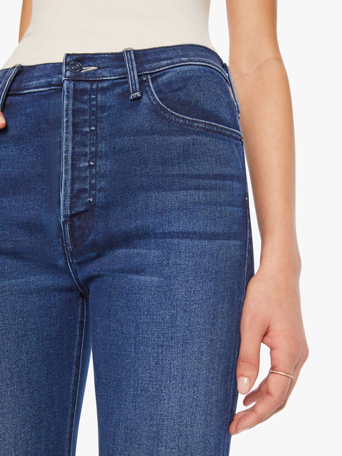 We especially love this cropped jean with a cute pair of slides or sandals. Elevate your outfit with the Tripper Ankle Jeans by Mother, featuring a chic high-rise flare design in a dark blue Homecoming High color. Crafted from a quality cotton blend with a stretch fit, these jeans showcase subtle whiskering and a clean ankle-length hem. Proudly made in Los Angeles using fine imported materials, they come with an easy zip closure. Rise measures 11.25 inches with a 27.5-inch inseam, making them a flawless choice for spring style.