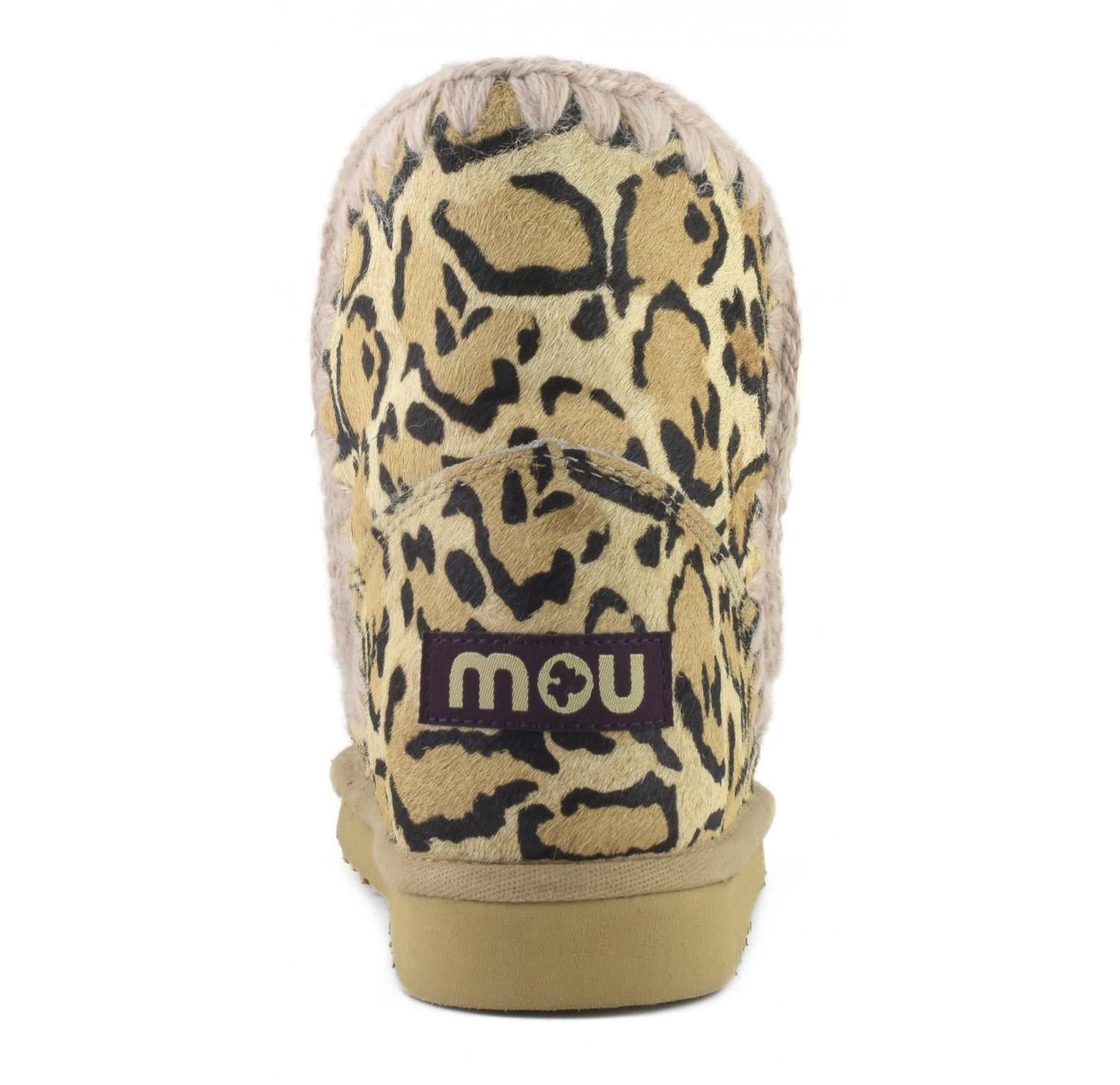 Say hello to the perfect, most versatile boot. The ankle height makes this style easily transition from day to night. Wear them with your favorite skinny jeans and tee for a more laid back look, or pair them with your favorite mini dress and jacket for a night out on the town. Embrace bold style with the Women's Eskimo 18 Boots by Mou, featuring a luxe ponyskin upper in a striking big leopard sand print. Handcrafted artisanal details like signature hand-crochet wool stitching set these boots apart, offering both comfort and durability. The genuine sheepskin lining ensures warmth, while the lightweight EVA and rubber outsole provides lasting support. With a flat heel and round toe, these 18cm height boots are perfect for a statement-making entrance at spring dinner parties.