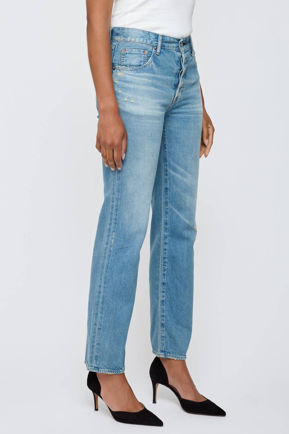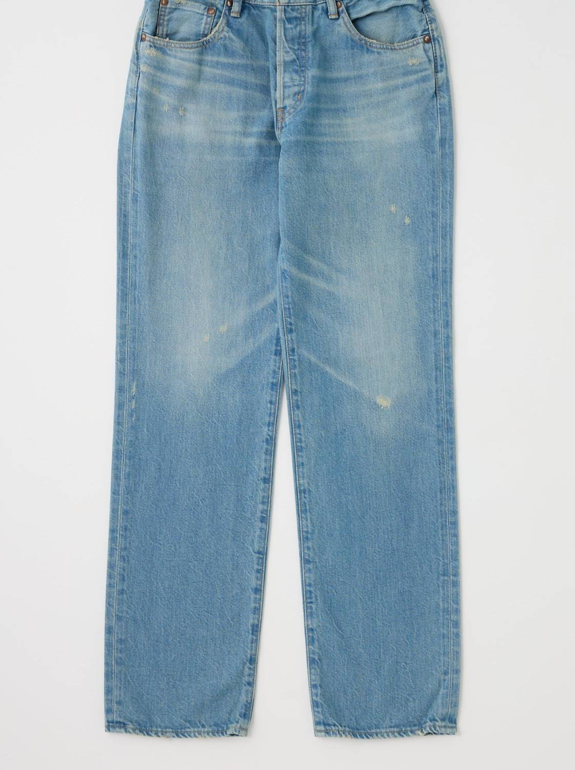 This classic straight leg jean has a perfect fit and goes with just about everything. Introducing the Goulds Straight Leg Jean by Moussy, the perfect blend of style and comfort in a classic blue. Crafted in Japan, these jeans are made from soft 100% Cotton with a light wash and a solid pattern, embodying a preppy, regular fit that flatters with its mid-rise and straight leg design. Featuring convenient pockets and a classic button closure, these jeans make a versatile addition to your wardrobe for any spring holiday party. Care: Machine wash as needed.