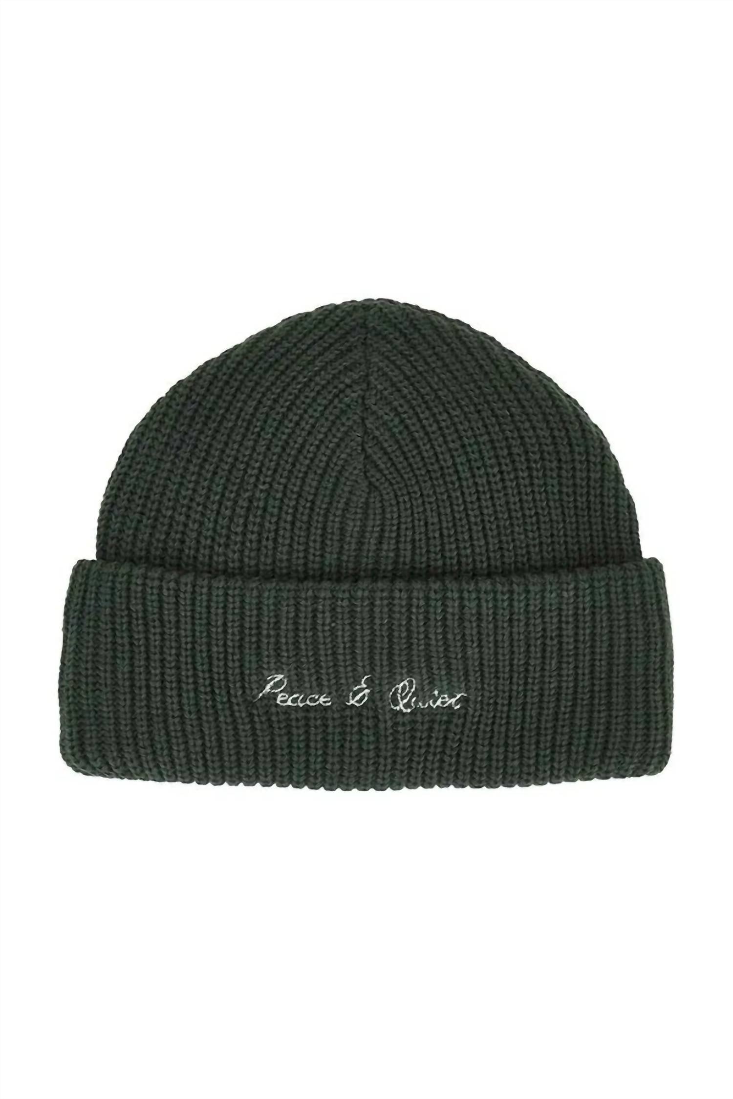 Turn heads in this stylish and chic hat. Not only is this accessory a must for keeping the sun out of your face, it will also be the perfect complement to any cute warm-weather outfit. Elevate your winter wardrobe with the Women's Signature Rib Knit Beanie from Museum of Peace & Quiet. Crafted in China from a 60% cotton and 40% acrylic blend, this forest-colored beanie promises warmth and style. It features a ribbed knit fabric with a front embroidered logo detail for a touch of sophistication. Simply toss it in the machine for easy care.