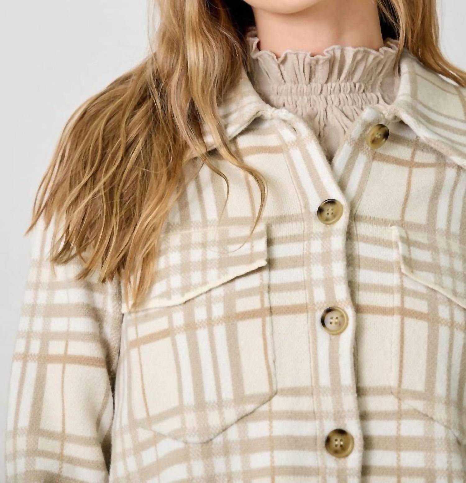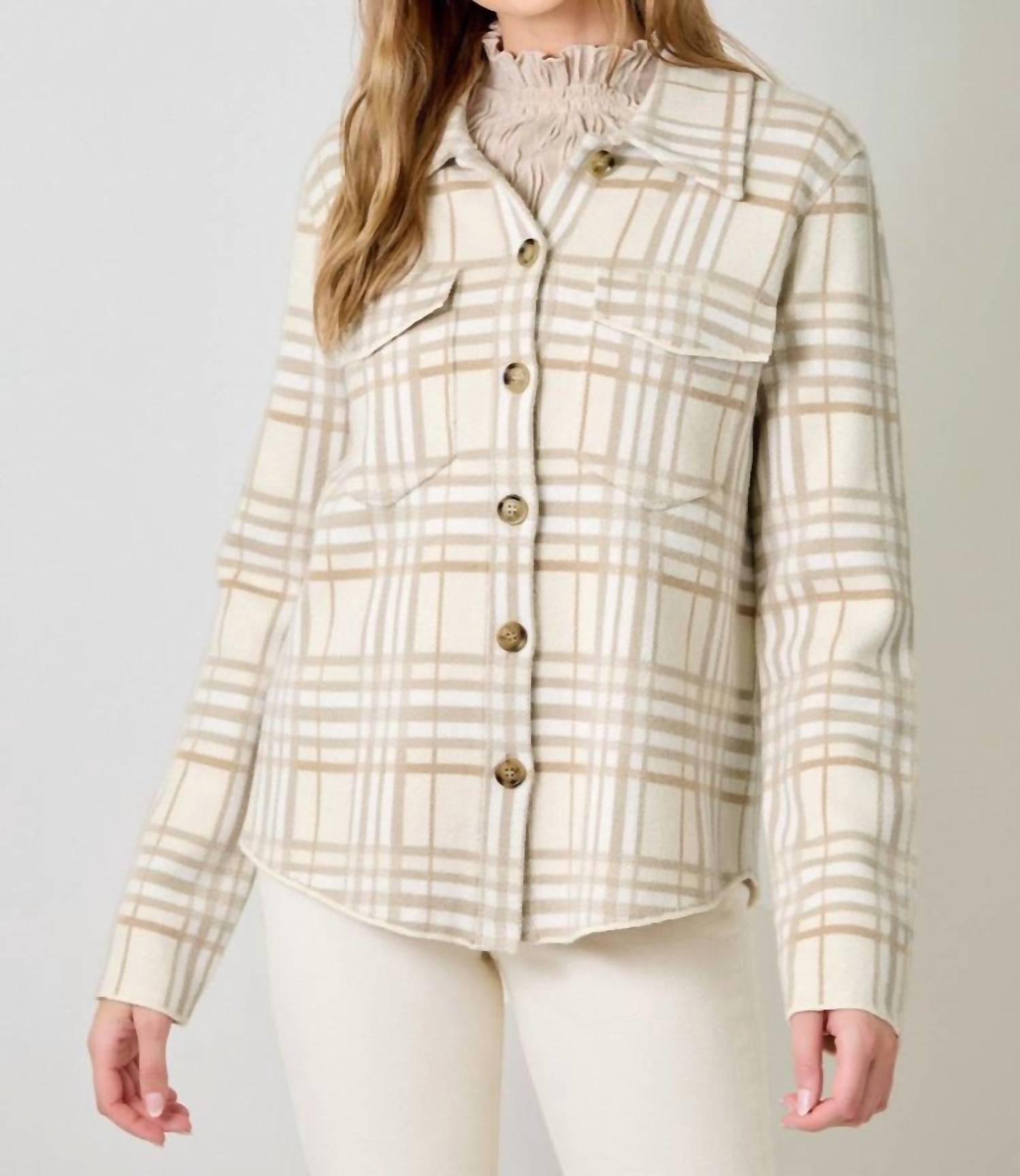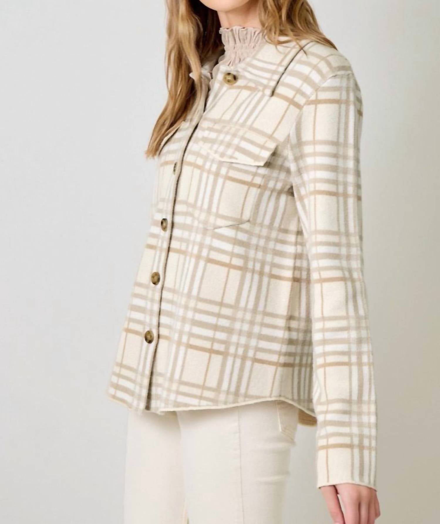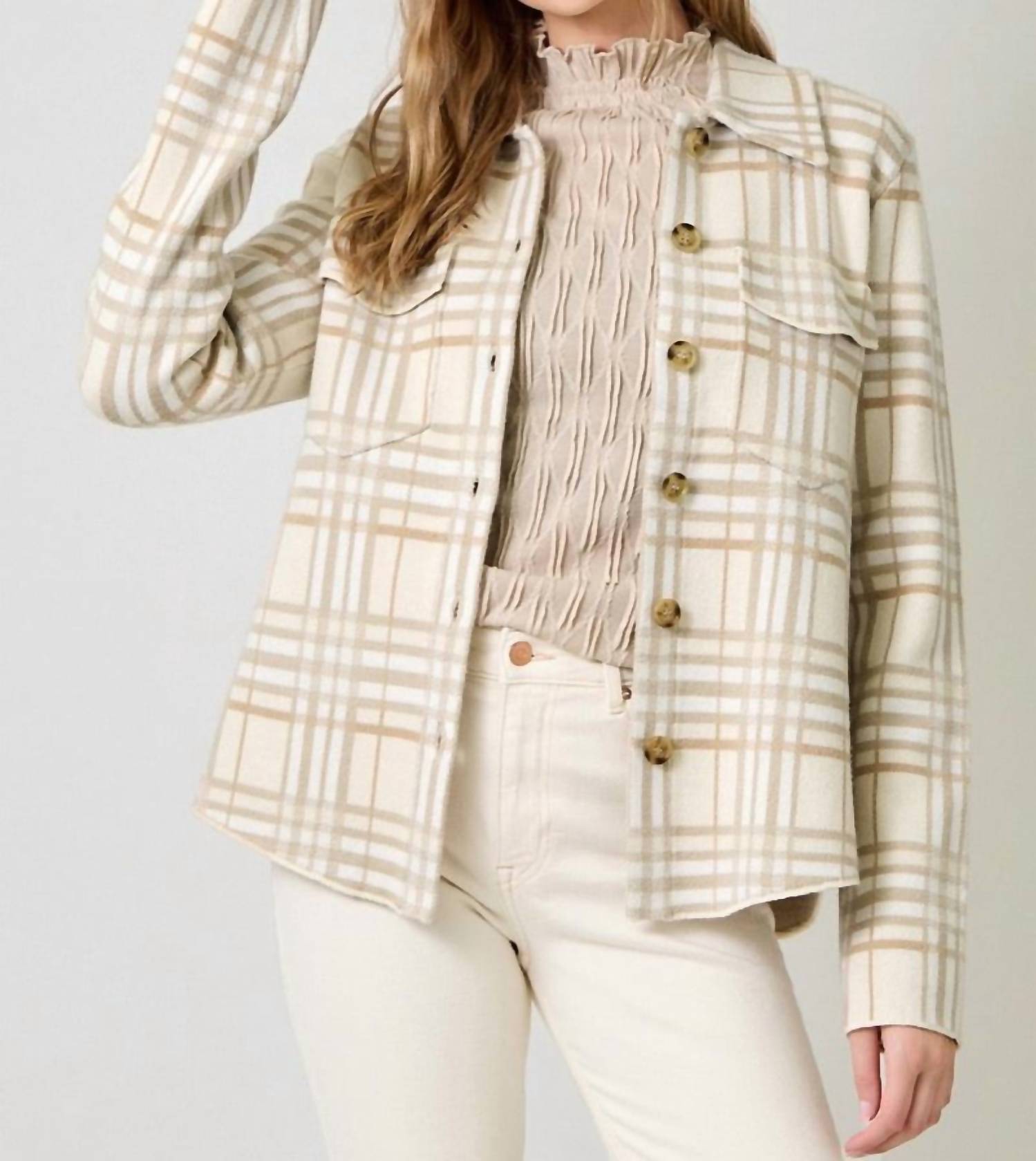 The ultimate cool-girl utility jacket. Embrace the autumn vibes with the Vibe Check Shacket by Mystree, an essential for your fall wardrobe in classic oatmeal plaid. This shacket boasts long sleeves and a heavy flannel design, complete with a button closure and a hi-lo hem for added style. Crafted from a blend of 45% Viscose, 28% Polyester, and 27% Nylon, it offers both comfort and durability. Care is simple with machine wash and tumble dry instructions, making it a versatile addition to your preppy collection.