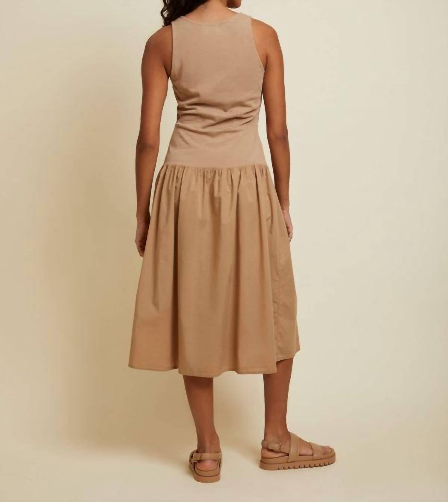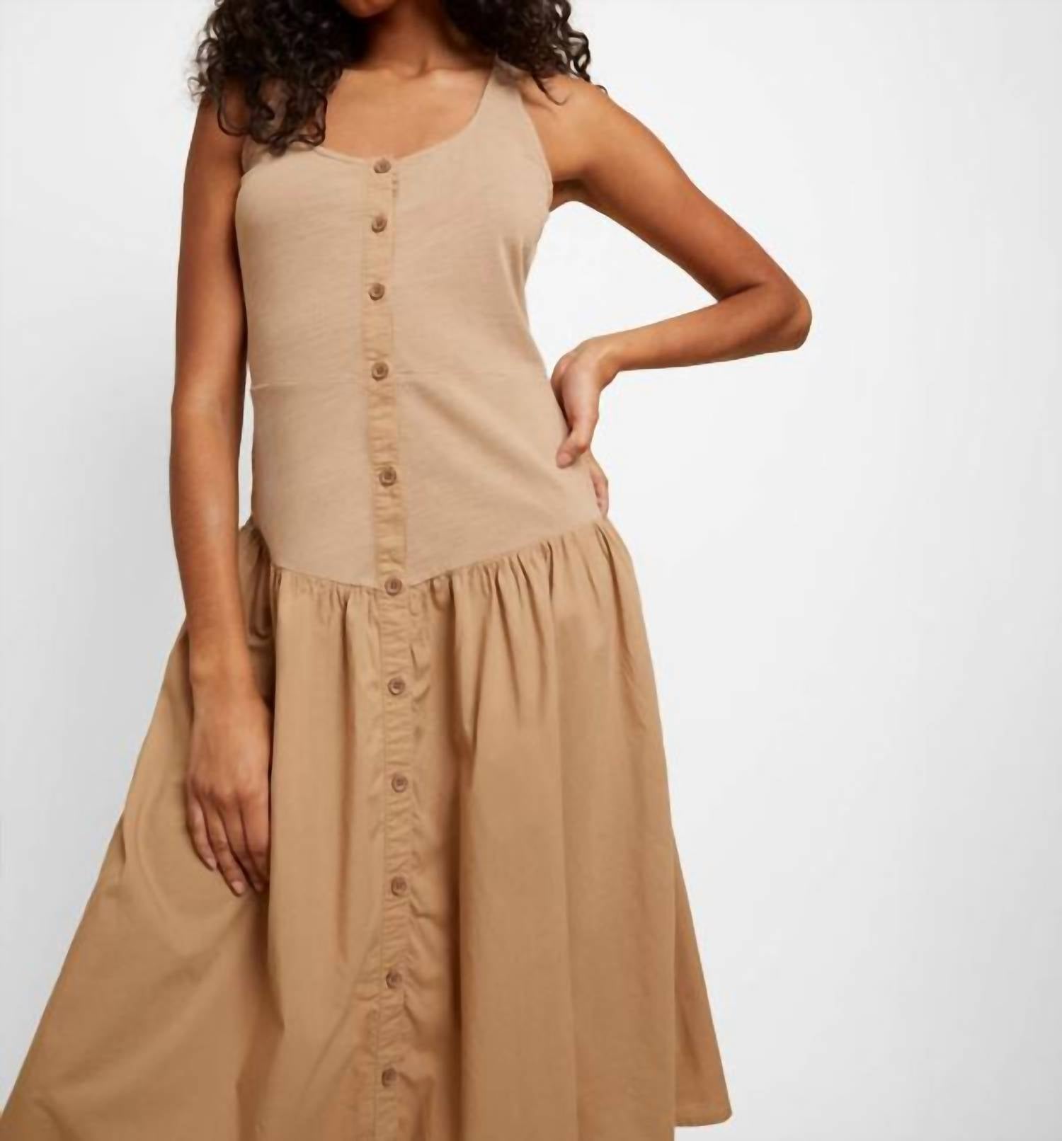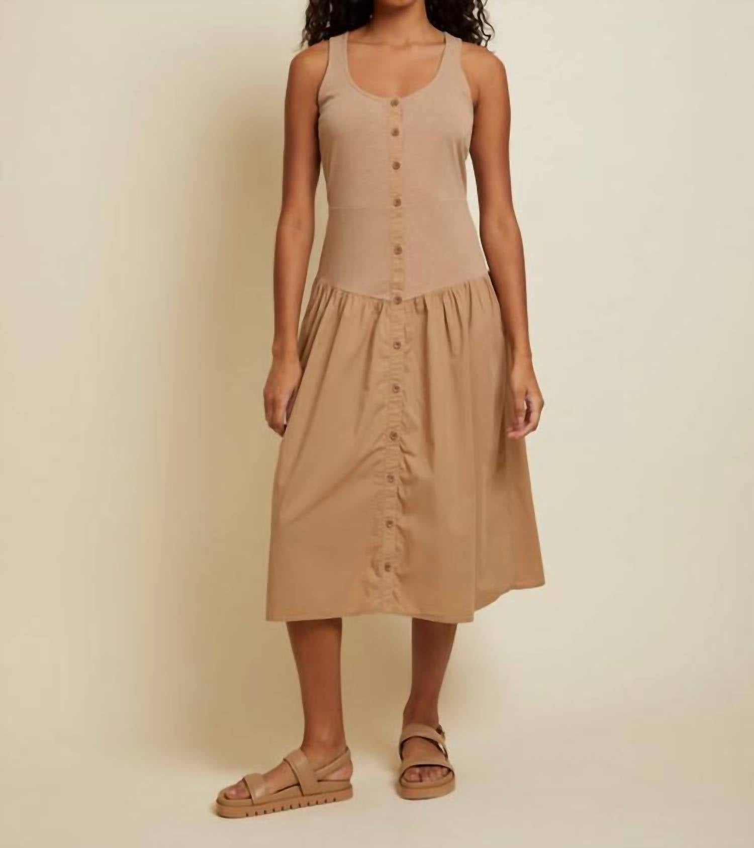 Just add slides or mules and you are good to go. Presenting the Carrie Romantic Midi Sundress by Nation LTD, an elegant choice for any occasion in the sophisticated shade of Cafe Au Lait. This sleeveless dress features a unique combination of a knit button-down bodice and gathered poplin skirt, with a waist seam to enhance your silhouette. Crafted from 100% heavyweight Peruvian Cotton, this 46-inch dress offers a comfortable structured fit with natural stretch, ideal for a holiday party or minimalist spring look. Originating from Peru, it celebrates simple yet sexy style with button closure, designed to keep you looking chic with minimal effort.