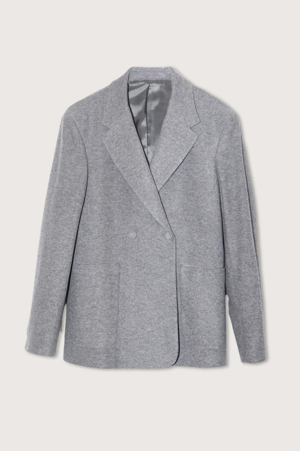 An elevated version of your favorite classic blazer. Discover the Migua Italian Jersey Jacket by Officine Générale, a sophisticated choice in a mid heather grey shade designed for stylish evening events. This long sleeve blazer, crafted from a luxurious blend of 90% wool and 10% cashmere, boasts a double-breasted style with four-hole fabric-covered buttons and convenient patch pockets. Made with exquisite Italian fabric and produced in Portugal, it offers an oversized fit tailored for comfort. Care for this elegant piece through dry cleaning only, ensuring its timeless appeal for every fall occasion. The model stands at 5'9" and wears a size 36.