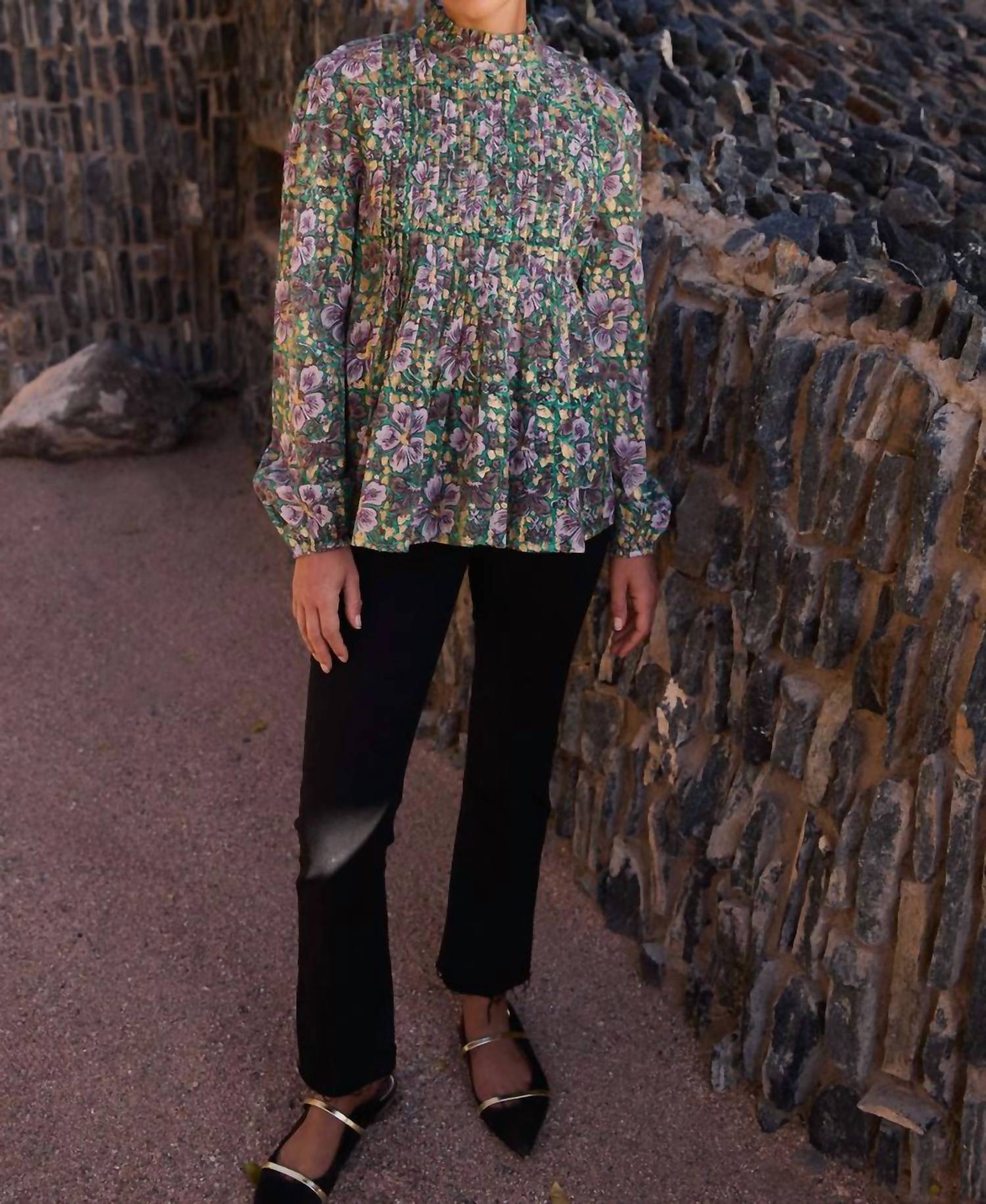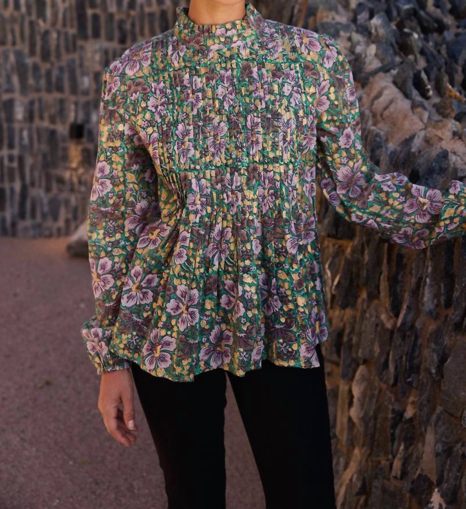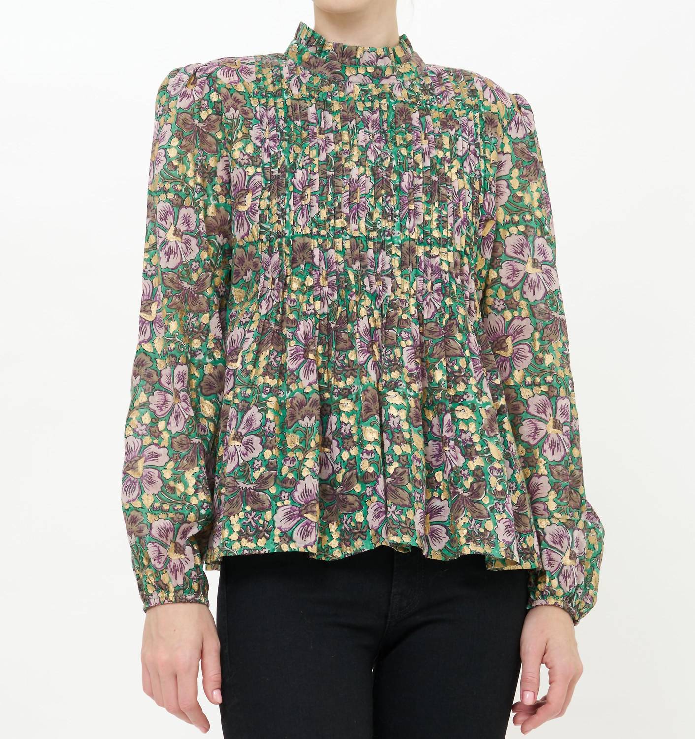 A timeless blouse that will never go out of style. Elevate your spring wardrobe with the Long Sleeve Pintuck Blouse by Oliphant in a captivating Matera Green. Made from lightweight cotton voile, this piece features a mock neck with romantic ruffle trim and long bishop sleeves with elasticized cuffs. The blouse boasts an allover hand block printed pattern with gold paint detailing and a peplum silhouette accented by pintuck pleats at both the front and back yokes. Offering easy style with a button closure, it fits true to size and is crafted for holiday parties, making it a perfect choice for Thanksgiving gatherings. Care: Hand wash and lay flat to dry.