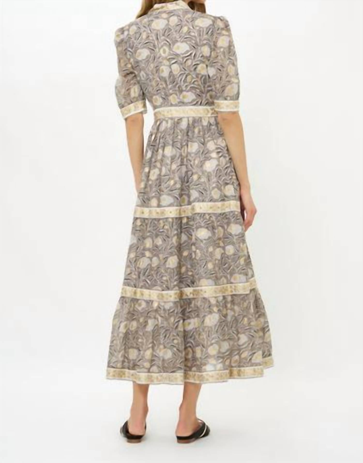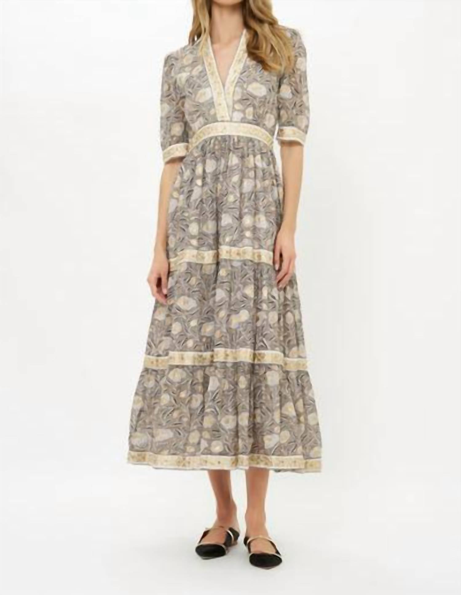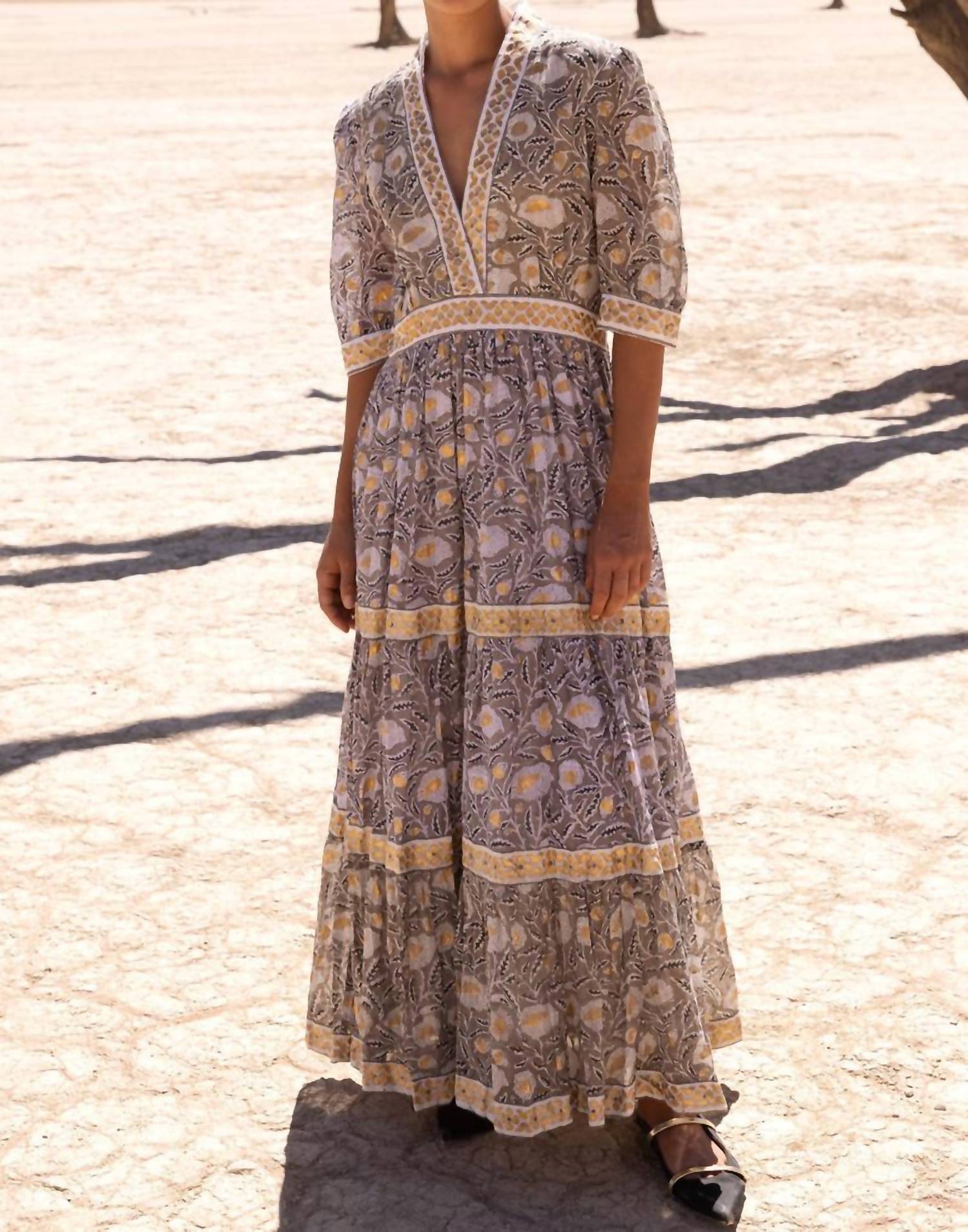 A maxi dress that is just as cute as it is comfortable. Step into elegance with the V-neck Cuffed Maxi Dress by Oliphant, crafted from lightweight cotton voile in a Birch Taupe color. Featuring short sleeves with tailored cuffs, this enchanting empire waist dress showcases a tiered maxi silhouette with a fitted bodice. Adorned with hand block printed patterns and gilded gold paint detailing, it also offers a V-neckline with hook and eye closure for added allure. For a perfect fit, it includes a side zipper, and is fully lined for comfort. Care: Hand wash and line dry for longevity, making it ideal for a Thanksgiving or holiday party.