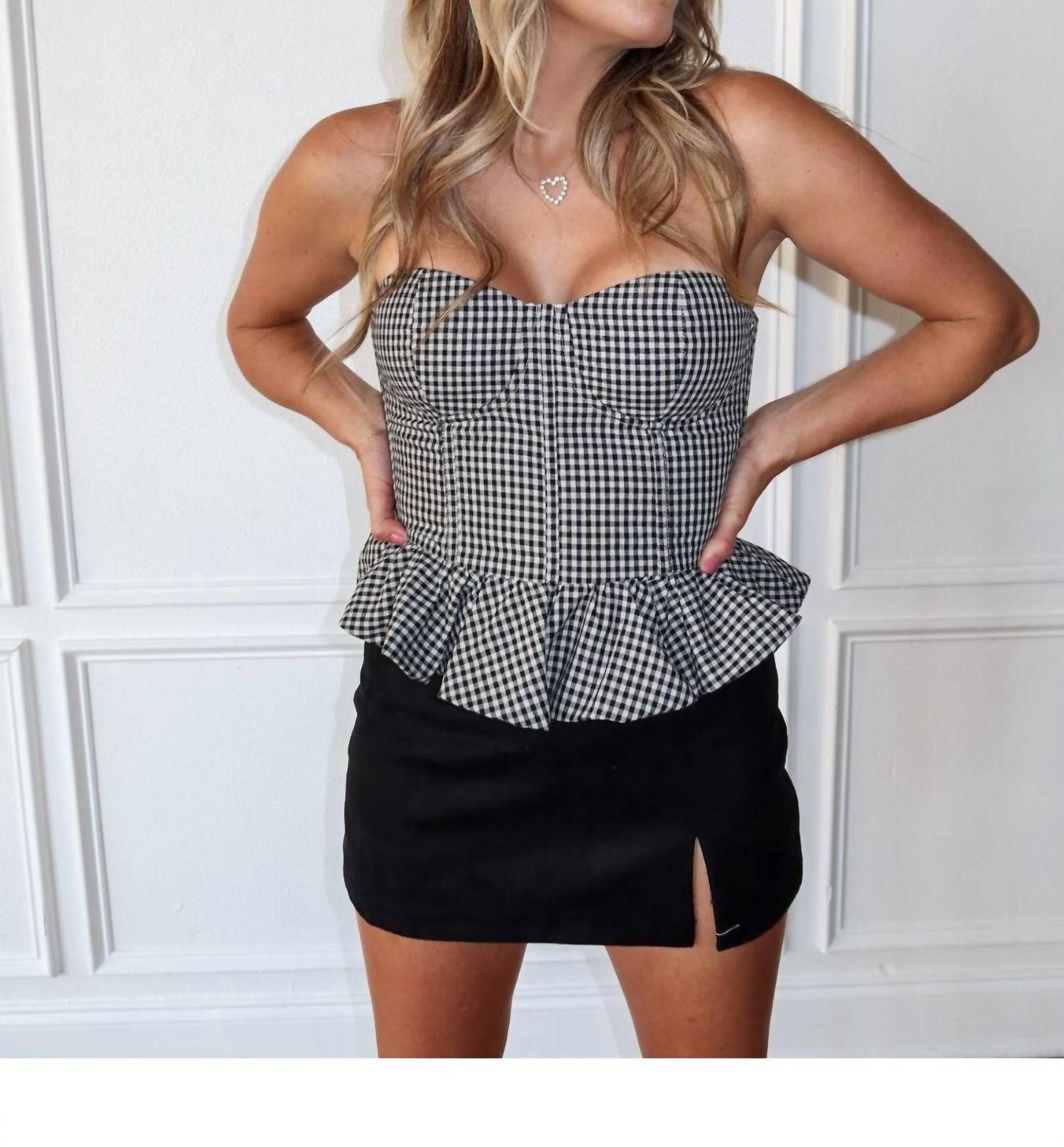 A timeless blouse that will never go out of style. Elevate your summer wardrobe with the Picnic After Dark Corset Strapless Top by OLIVACEOUS, a streetwear-inspired piece perfect for any occasion. This strapless top features a classic black-and-white gingham pattern and a structured corset silhouette with a subtle peplum flare for a flattering finish. Made from 100% cotton, it offers a cropped length ideal for pairing with high-waisted pieces. Closure: Zip closure. Care: Hand wash cold, line dry. Model is 5'4" and wearing size Small.