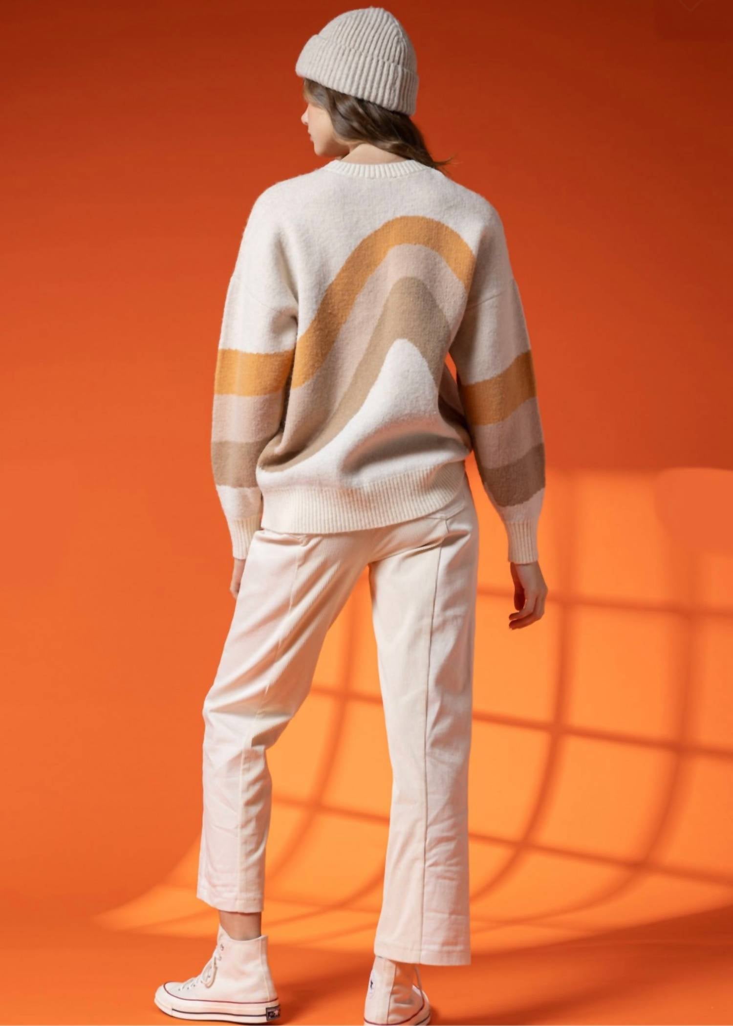 The ultimate go-to sweater, expertly crafted to provide the perfect combination of warmth and style. Its classic design and soft fabric make it a must-have addition to your wardrobe. Stay cozy and chic with the Chloe Oversized Long Sleeve Sweater by PAPERMOON, featuring a captivating rainbow swirl design in cream multi. This patterned women's sweater boasts a classic crewneck and is ideal for a preppy fall wardrobe. Closure: Pull on. Perfect for travel and making a statement on New Year's Eve.