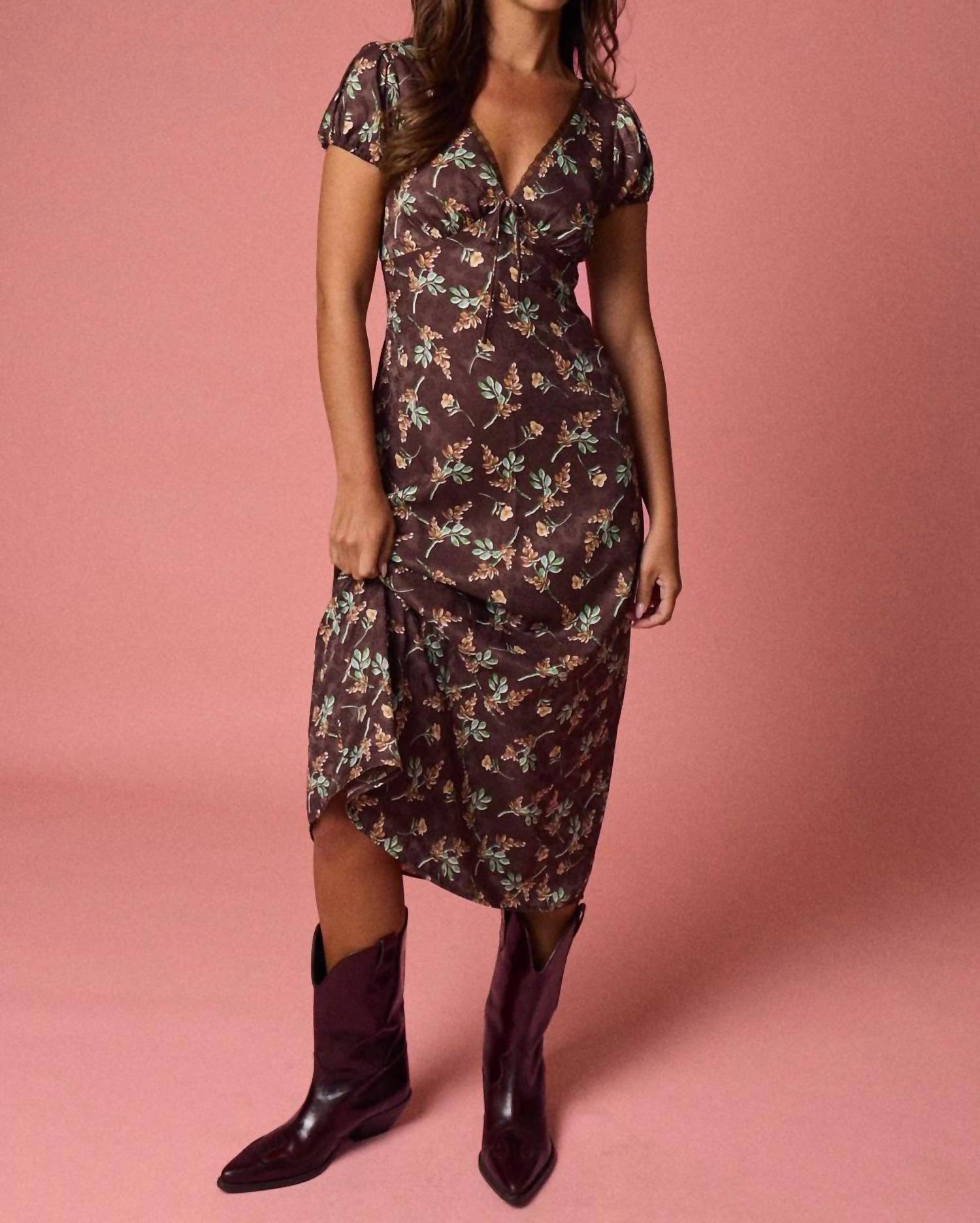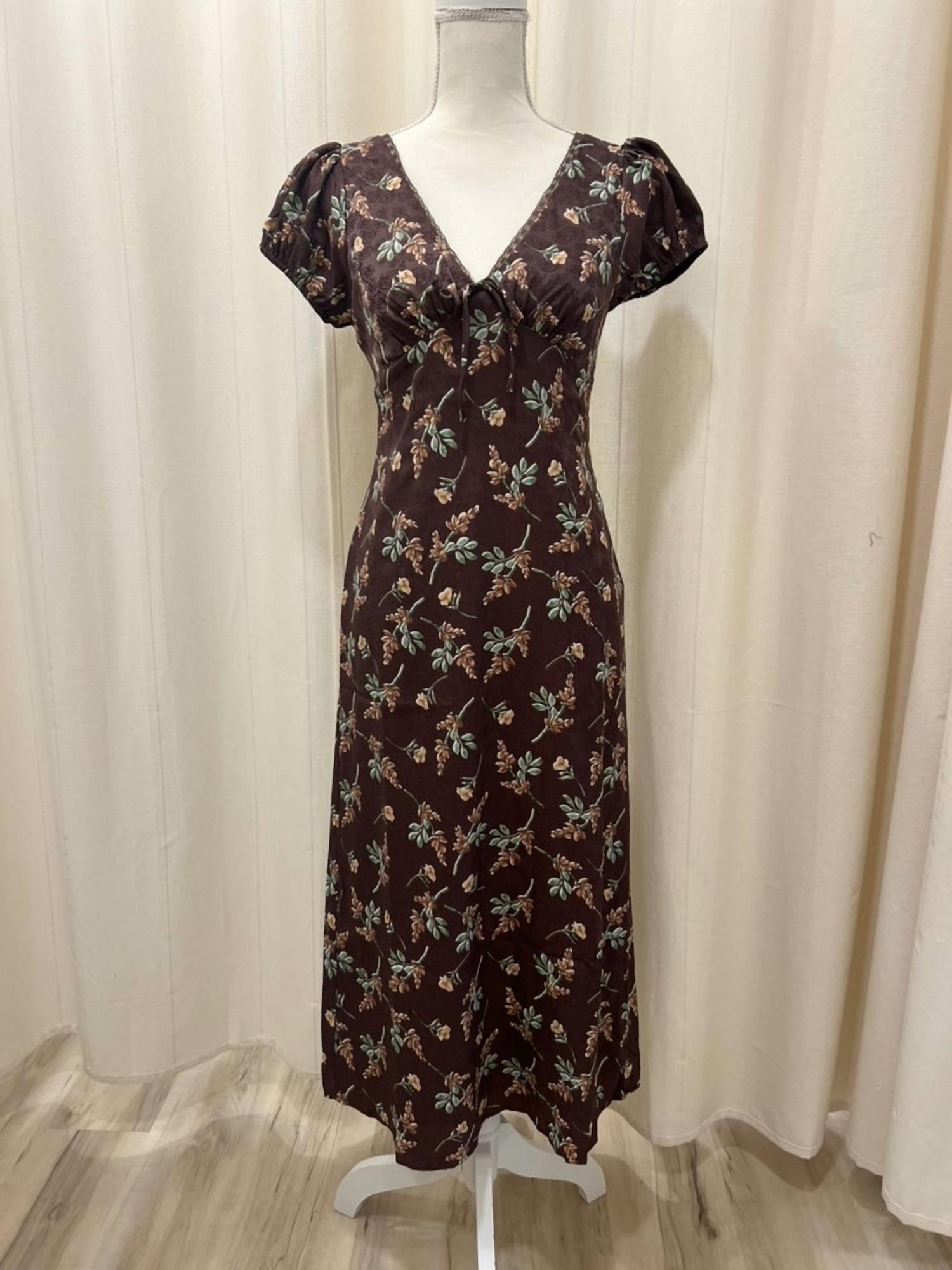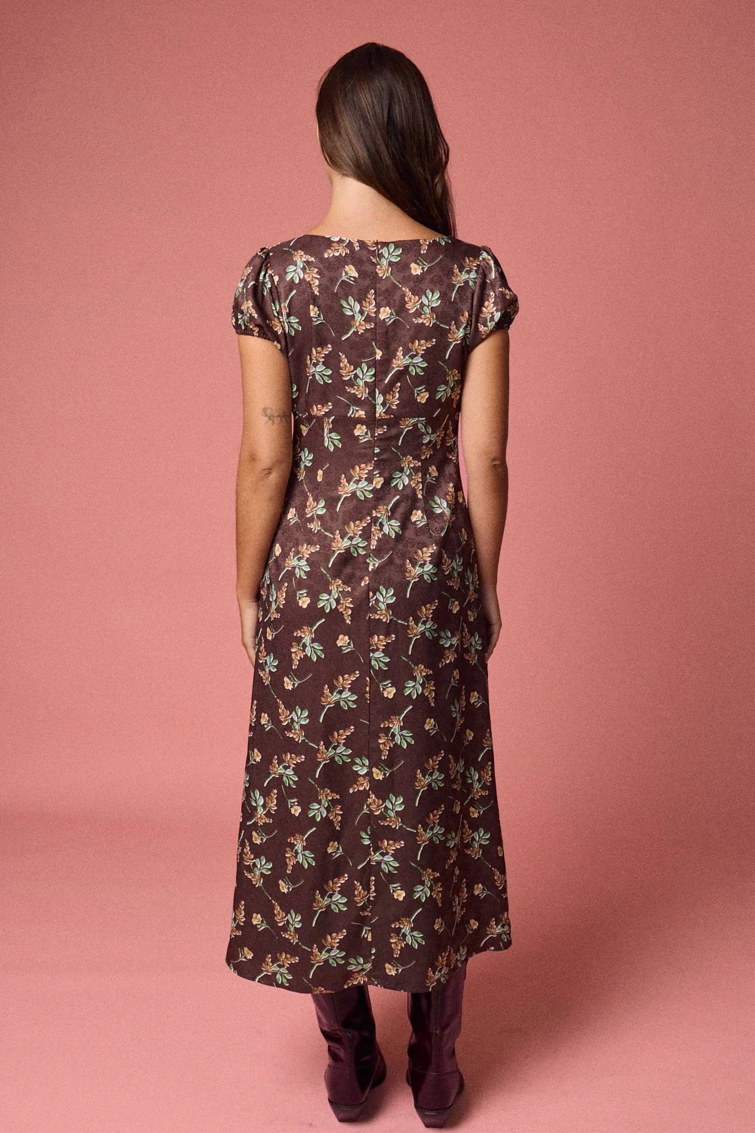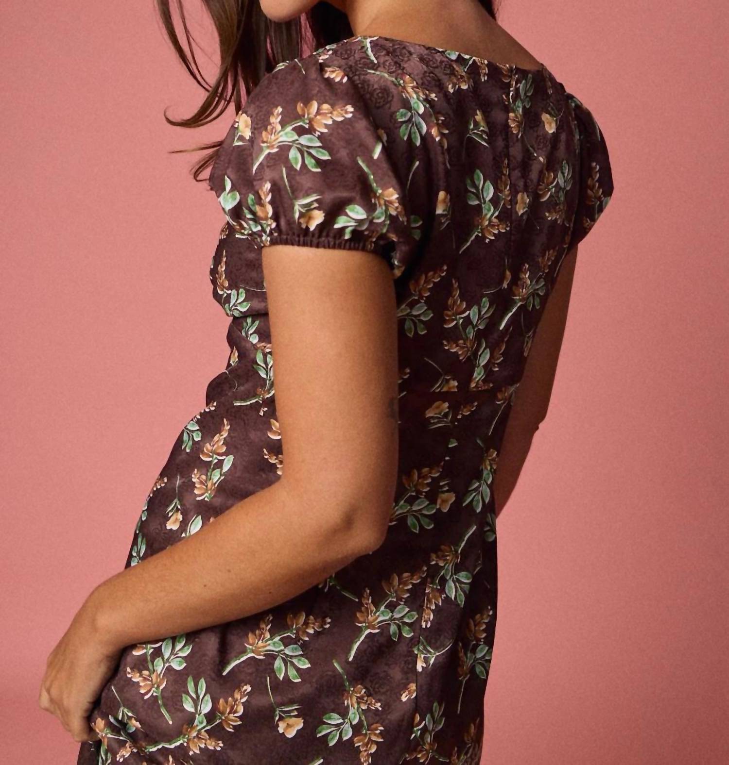 A midi dress so versatile, your options for wearing it are endless. The Floral Puff Sleeve Midi Dress by PAPERMOON is an elegant option in brown floral that embodies timeless sophistication. Featuring short puff sleeves and a structured A-line silhouette, this dress is crafted from 100% polyester with a lining of 95% polyester and 5% spandex for a smooth feel against the skin. Its charming details include lace edges and a bow accent, with a discreet back zip closure for ease of wear. Care instructions recommend hand washing and line drying to maintain its graceful appeal.
