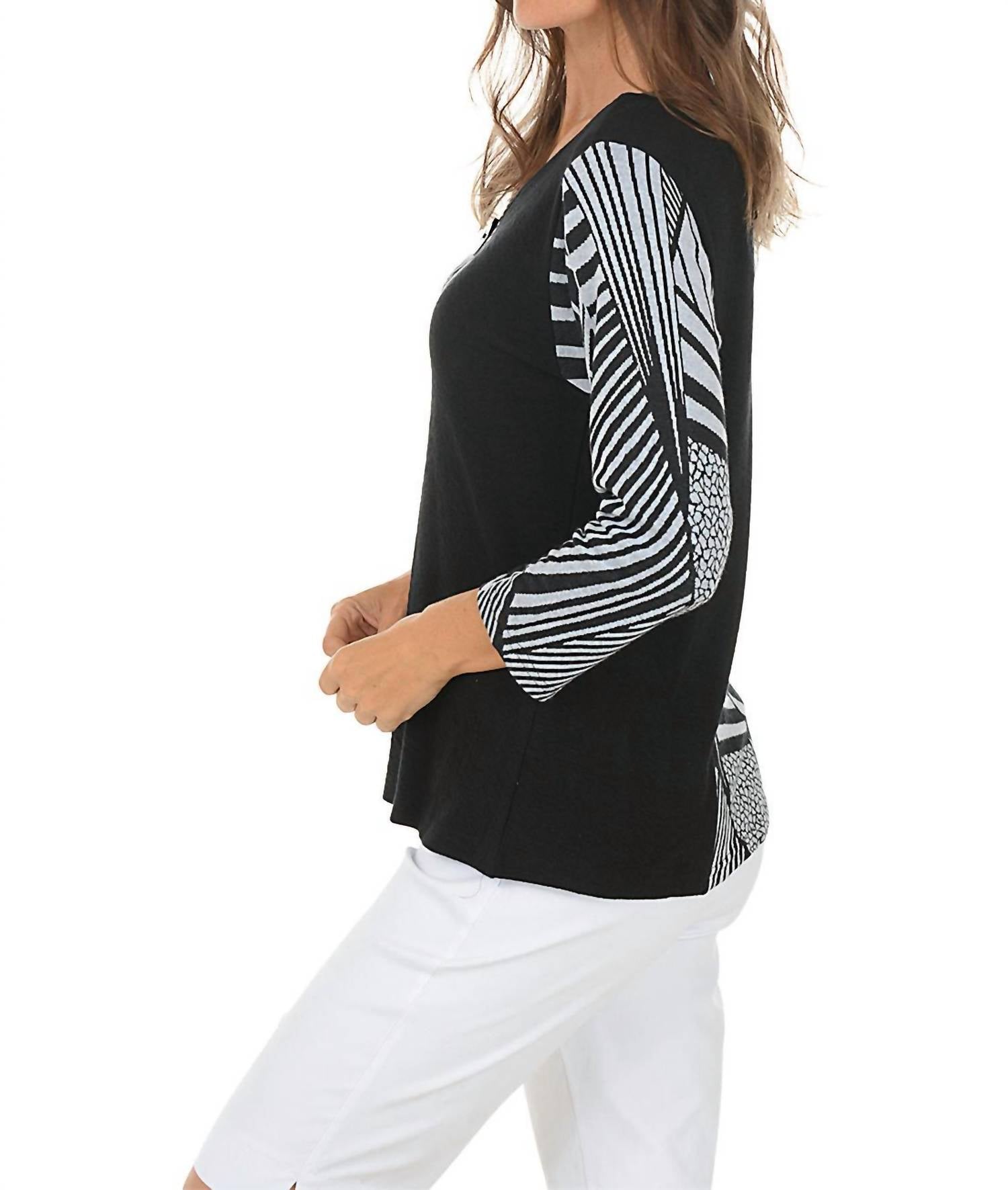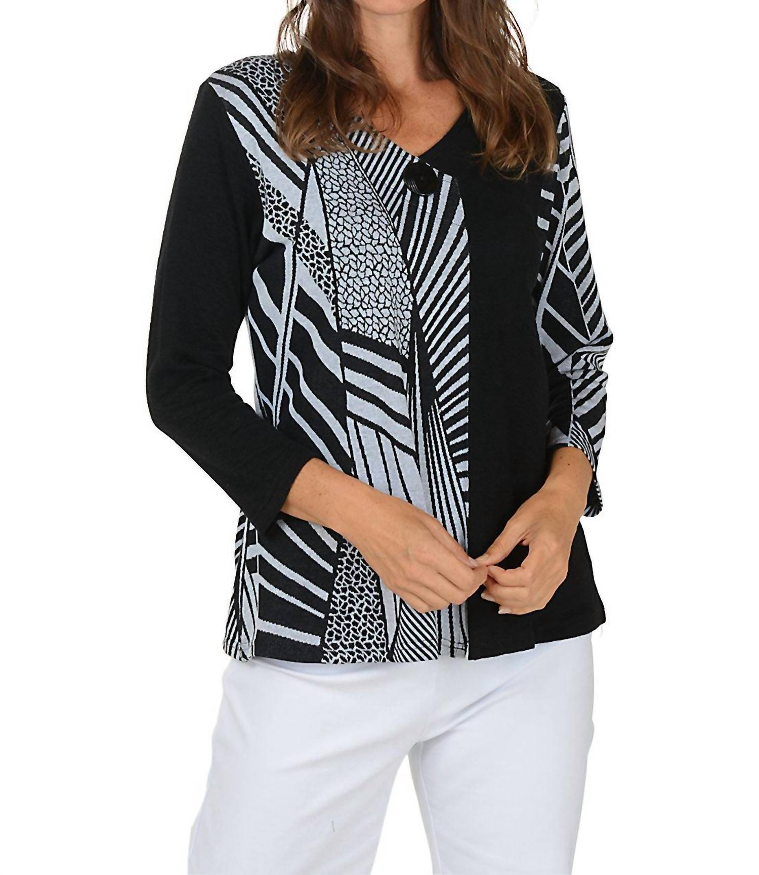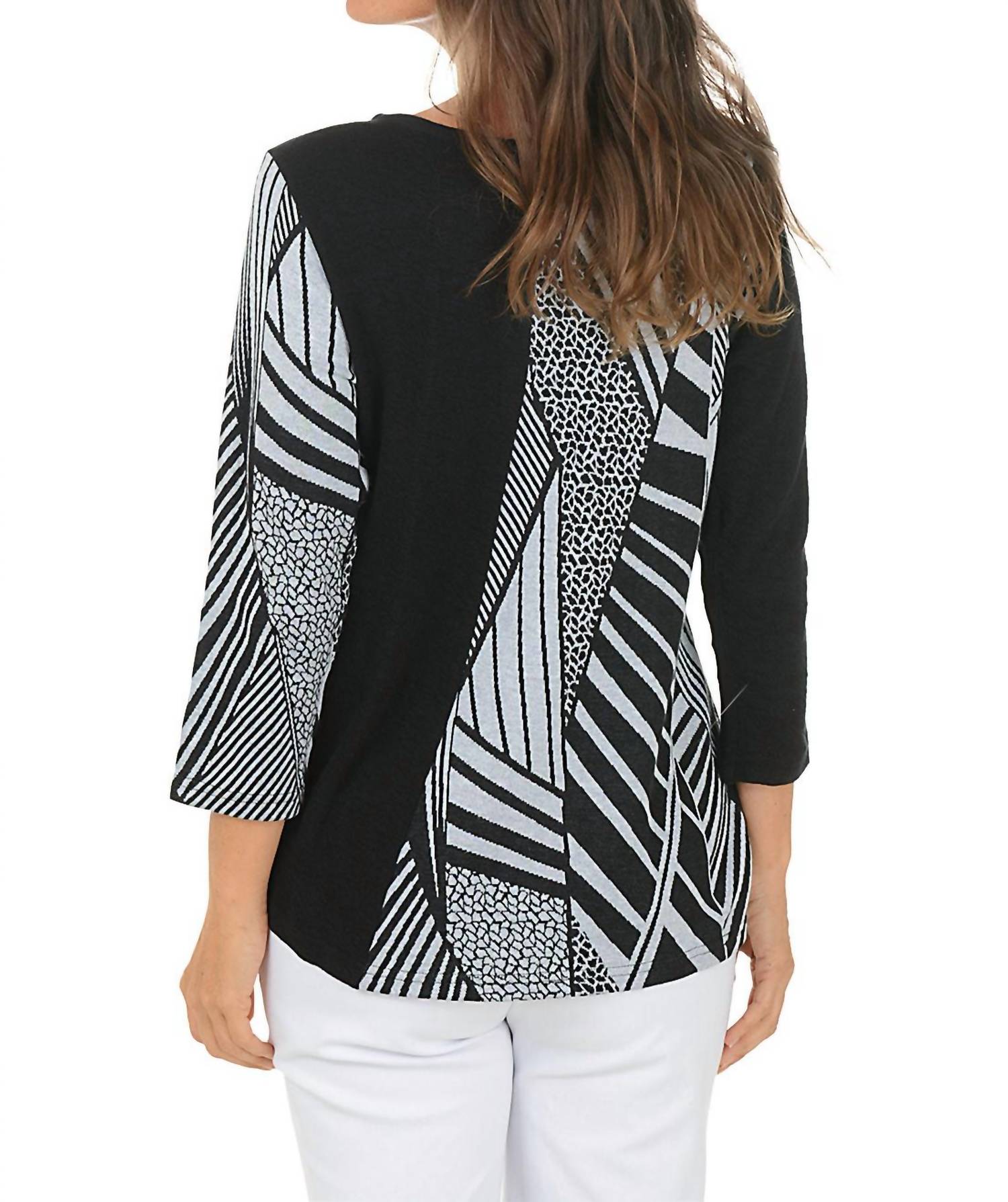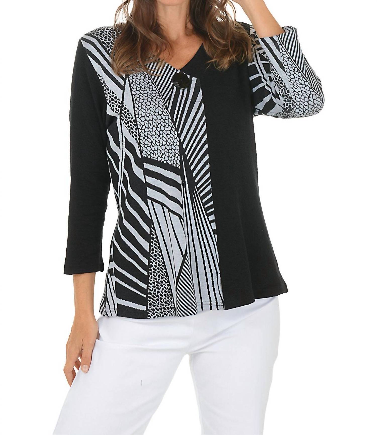 A timeless blouse that will never go out of style. Discover the Tula Top by Parsley & Sage, a chic choice for casual elegance with its animal-inspired pattern and black contrasting panels. This V-neck blouse boasts three-quarter sleeves and a single button closure, ideal for fashion-forward styling. Crafted from a 60% Cotton and 40% Rayon blend, it features a textured fabric and a subtle 3-inch slit on the front hem, with a center back length of 24.5 inches. Made in India and easy to maintain, simply machine wash cold and tumble dry low for lasting wear.
