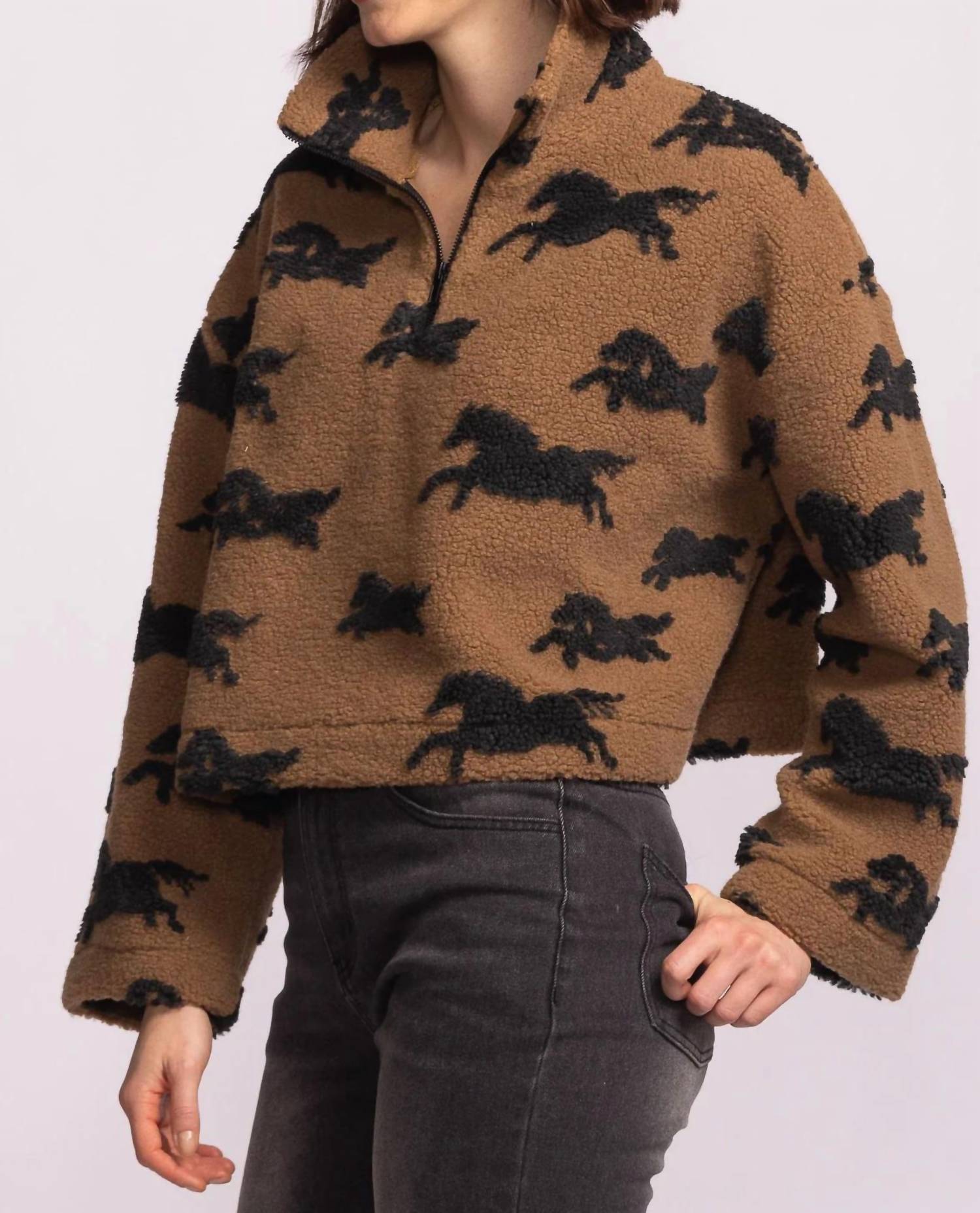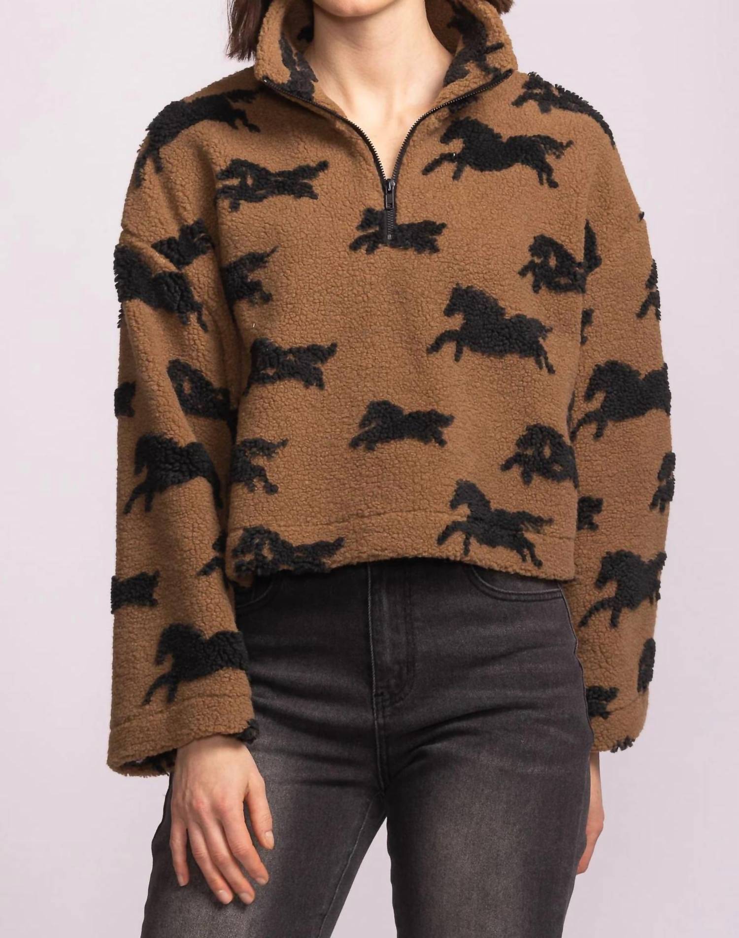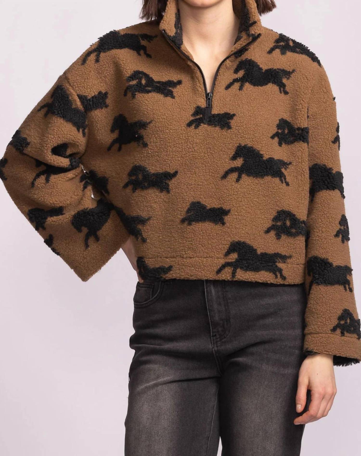Cute, casual, and comfortable. This jacket is a must have. The Spirit Jacket is a cozy fleece jacket featuring horse silhouettes for a touch of rustic charm. Designed with a half-zip closure and a cropped, boxy fit, this versatile piece layers effortlessly over any outfit. Pair it with jeans for casual days or a skirt for a comfy-cute look you’ll wear on repeat. Half-zip closure Jacquard print Cropped length Boxy fit Model is wearing size XS