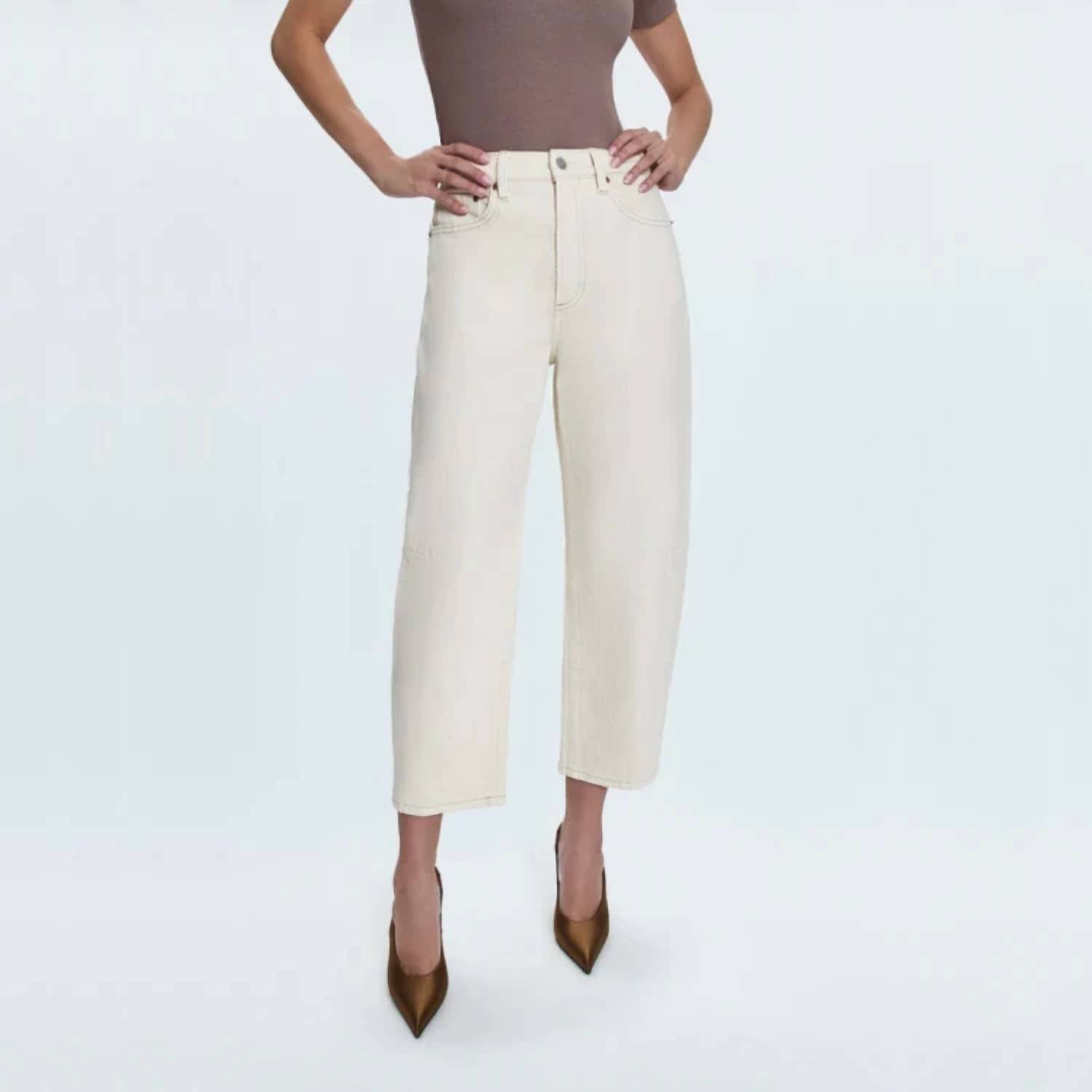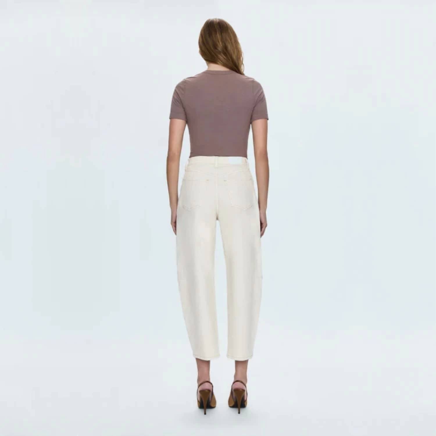 A modern silhouette designed with a barrel bowed leg and a relaxed silhouette with a 26" inseam. Crafted from Pistola's wear-everywhere comfort stretch denim. Offered in a warm, off-white colored denim wash with contrast stitching and contrast metallic hardware.