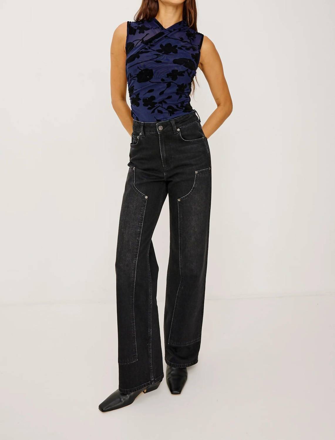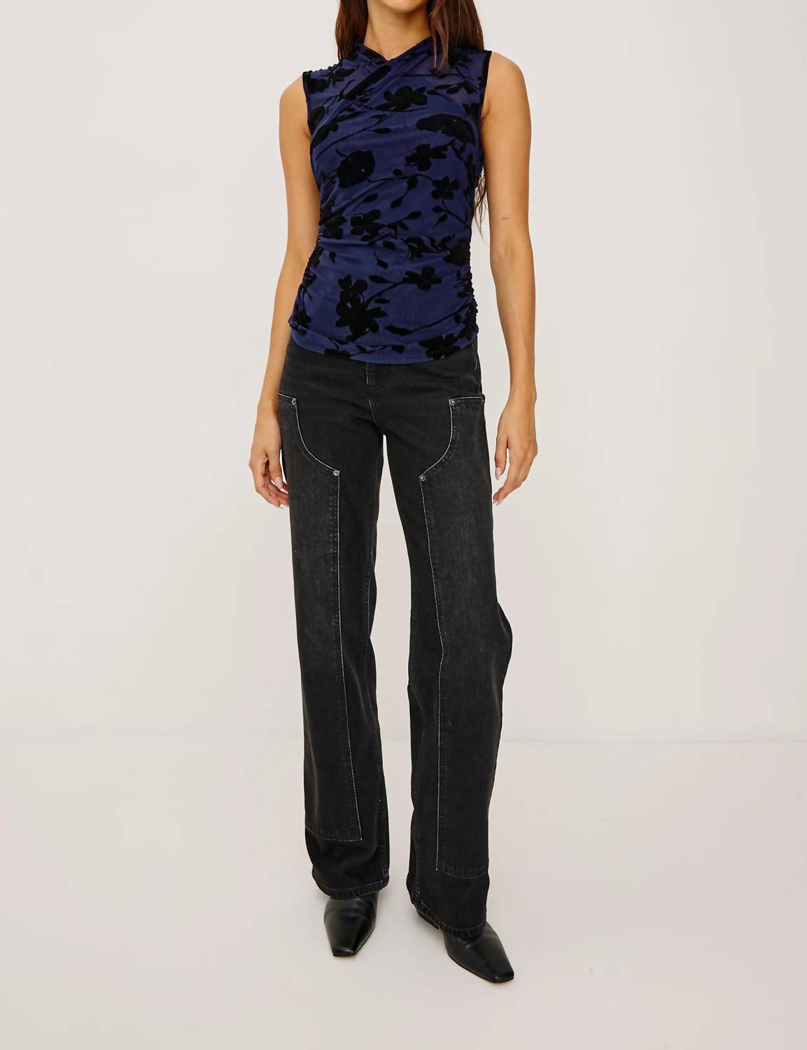 Pair this with your favorite jeans and slides for your next girls night out. Discover the Lauris Velvet Shirt by Rails, an elegant sleeveless blouse designed to make an effortless statement. Crafted from a premium stretch nylon and spandex mesh, it features a velvet-flocked floral motif with a chic wrap-style chest and side ruching, finished with a fully lined interior. The pull-on style offers easy wear, and its 21" front body length ensures a sleek fit. For care, hand wash the garment inside out in cold water and lay flat to dry, with a cool iron if needed.
