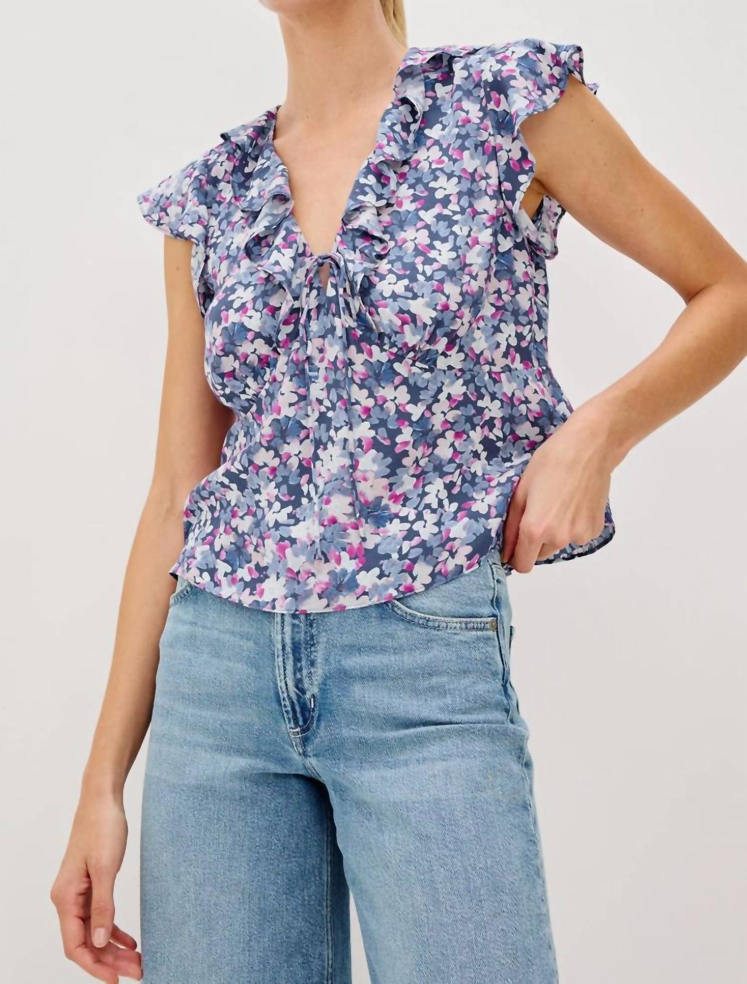 Pair this with your favorite jeans and slides for your next girls night out. The Women's Carmine Blouse by Rails is a chic addition to your summer wardrobe, featuring cap sleeves and a stylish V-neck design. Made for a touch of streetwear flair, this floral print blouse is perfect for vacation occasions. Its button closure ensures a neat and tailored fit.