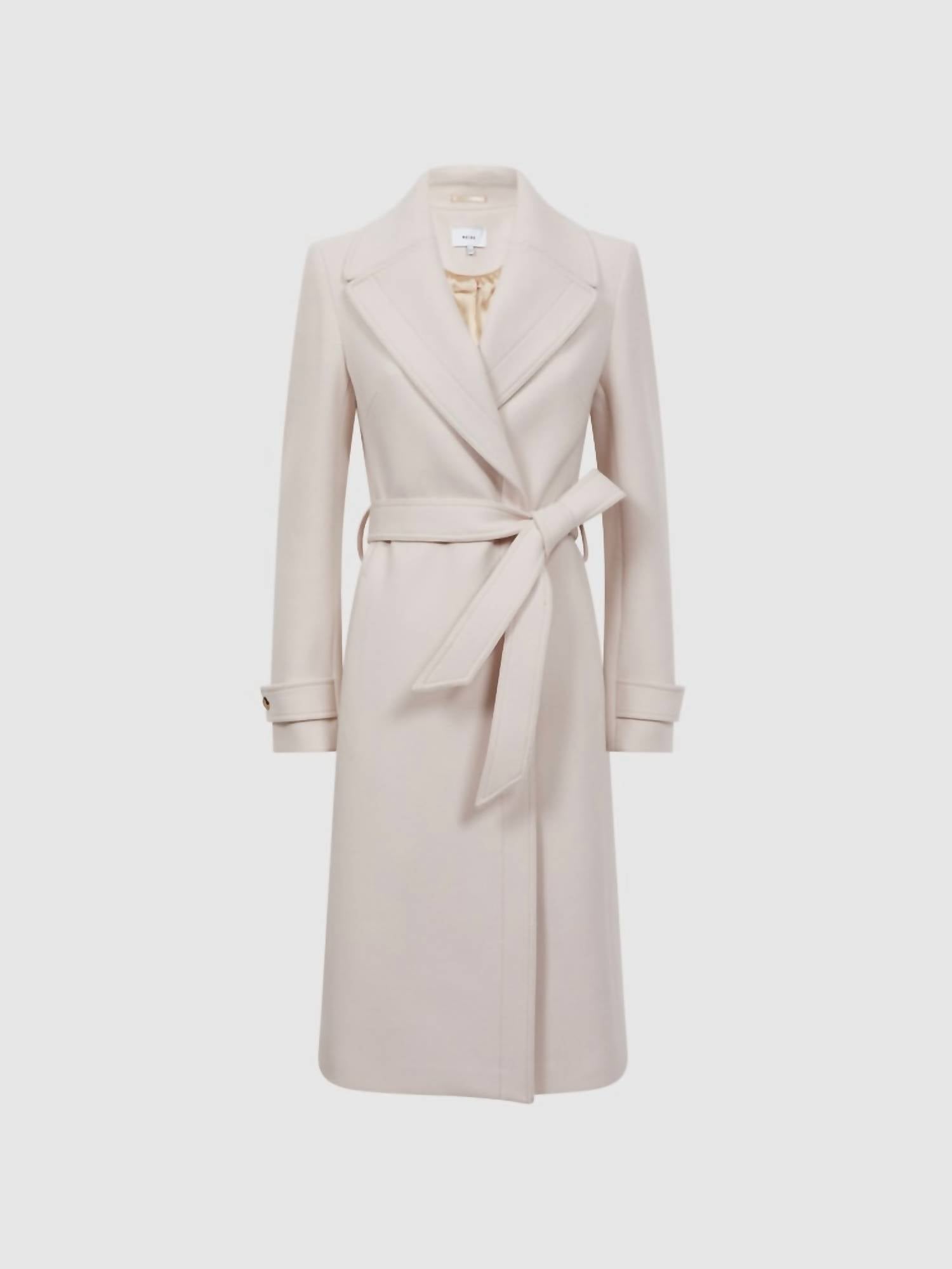 The perfect trench coat that you can throw over any outfit. Elevate your fall wardrobe with the Reiss Neutral Tor Relaxed Belted Coat, a minimalist pea coat designed for women with long sleeves and a collar neckline. Crafted from a wool blend material, this mid-length coat features superior insulation with its lined interior. The design includes side pockets and a self-tie waist belt, offering versatile styling options for vacation occasions. Dimensions: Regular center back neck to hem measures 42.5" / 108cm. Care: Do not wash. Model is wearing a size 8 (5ft 9" height).