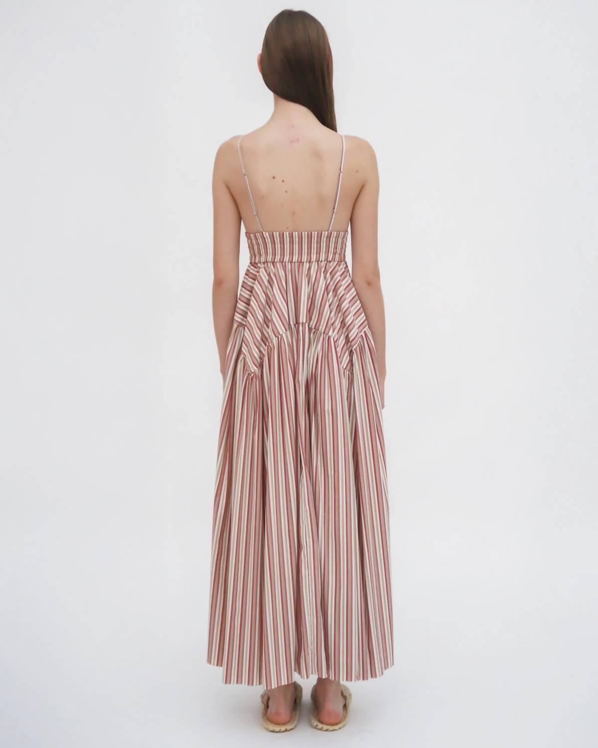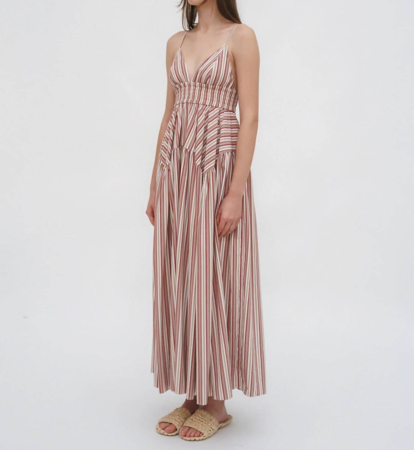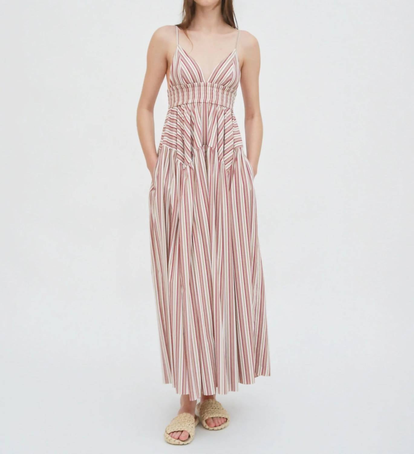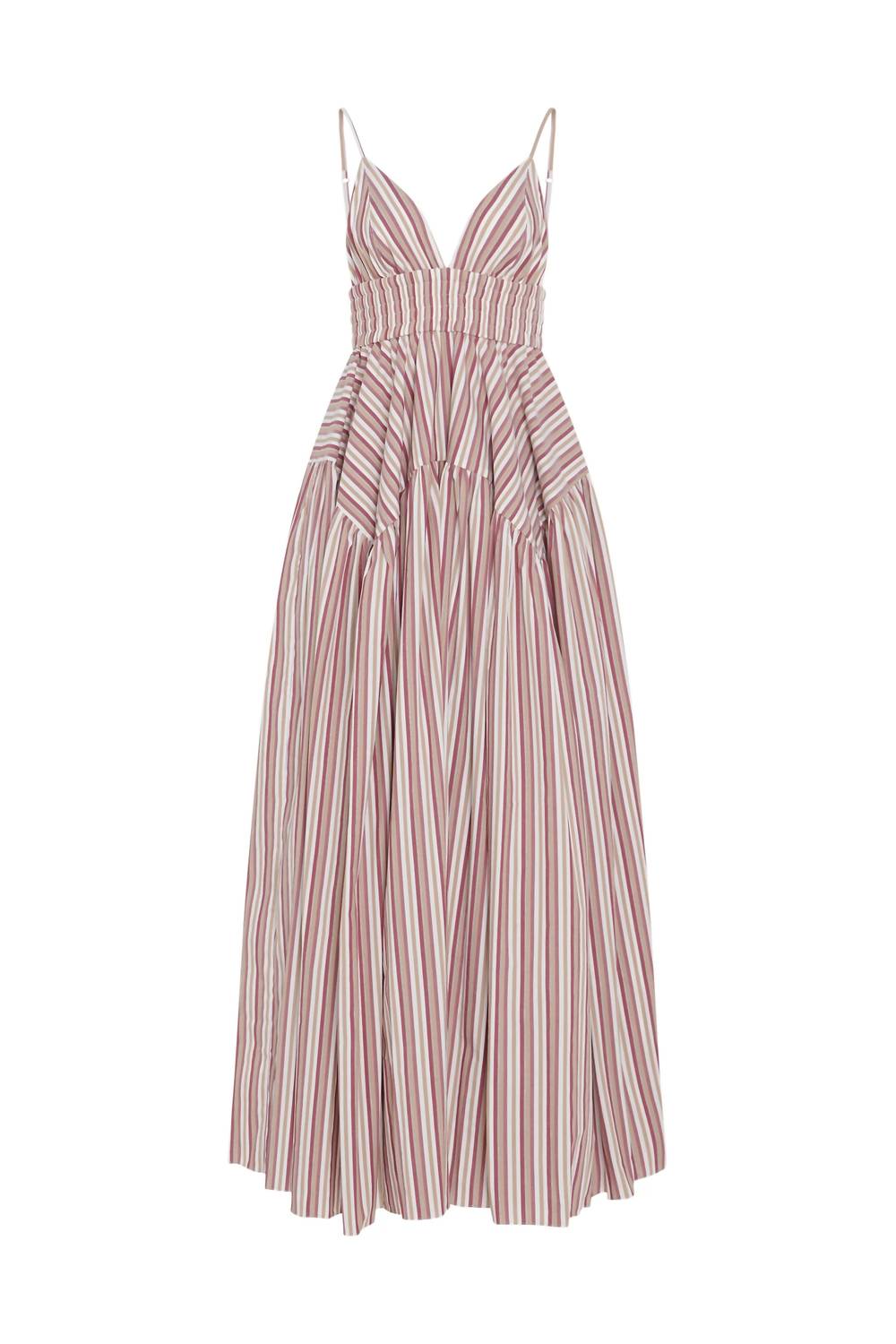 Just add slides or mules and you are good to go. Discover the Gathered Peplum Camisole Dress by Rosetta Getty, an elegant multi-striped piece for your spring wardrobe. Designed with spaghetti straps and a flattering V-neck, this midi dress features a full skirt with an ankle-length finish. Crafted from 100% Cotton Corduroy, it includes an elasticized smocked waistband for a comfortable fit. With a pull-on closure and pockets, this A-line silhouette is your go-to option for stylish ease.