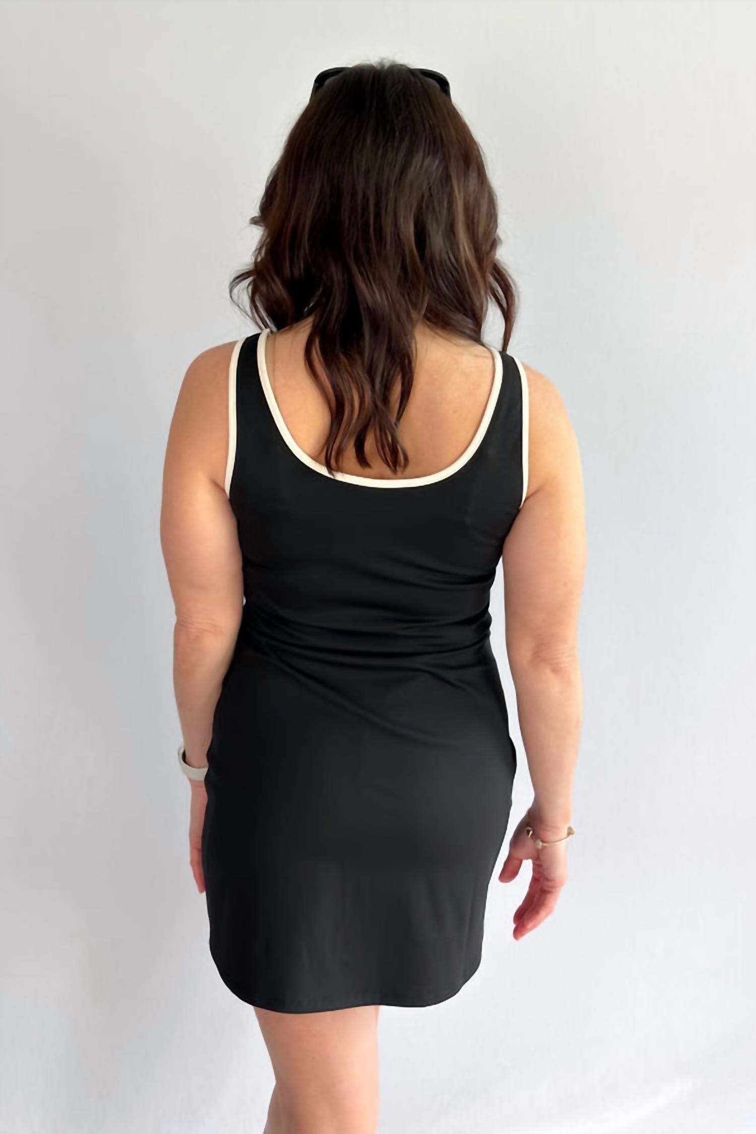 A short and breezy dress for those warmer days. The Sadie & Sage Short Sporty Dress in Black/White is the perfect blend of comfort and style for game day. Crafted from a stretchy nylon blend, this sleeveless mini dress features a flattering bodycon silhouette with a scoop neckline. Notable details include a built-in shelf bra and integrated shorts with pockets, providing both support and practicality. Designed for the athleisure trend, this medium-weight dress offers a snug, reassuring fit.