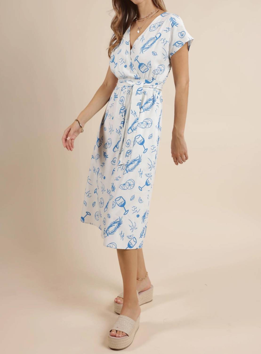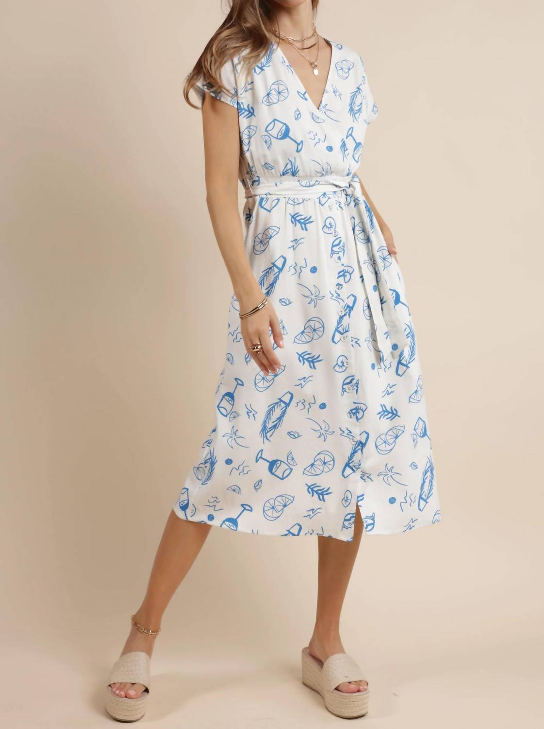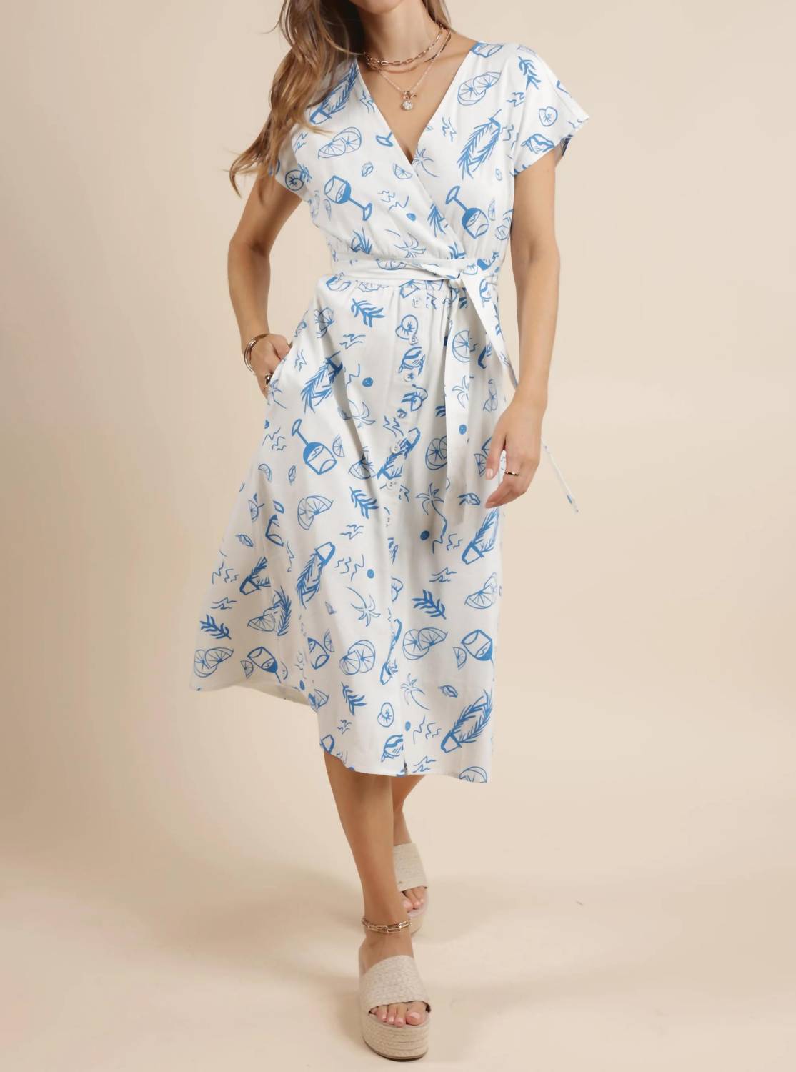 A midi dress so versatile, your options for wearing it are endless. Embrace coastal charm, featuring short sleeves and a flattering surplice neckline. Crafted from a lightweight blend of 83% rayon, 15% linen, and 2% cotton. Wrap-inspired midi dress offers a fresh ivory and blue citrus motif. Designed with side pockets and a self-tie belt for an effortlessly stylish silhouette. Tie waist closure. Machine wash cold, hang dry. Perfect for sun-soaked beach days and boho chic occasions.
