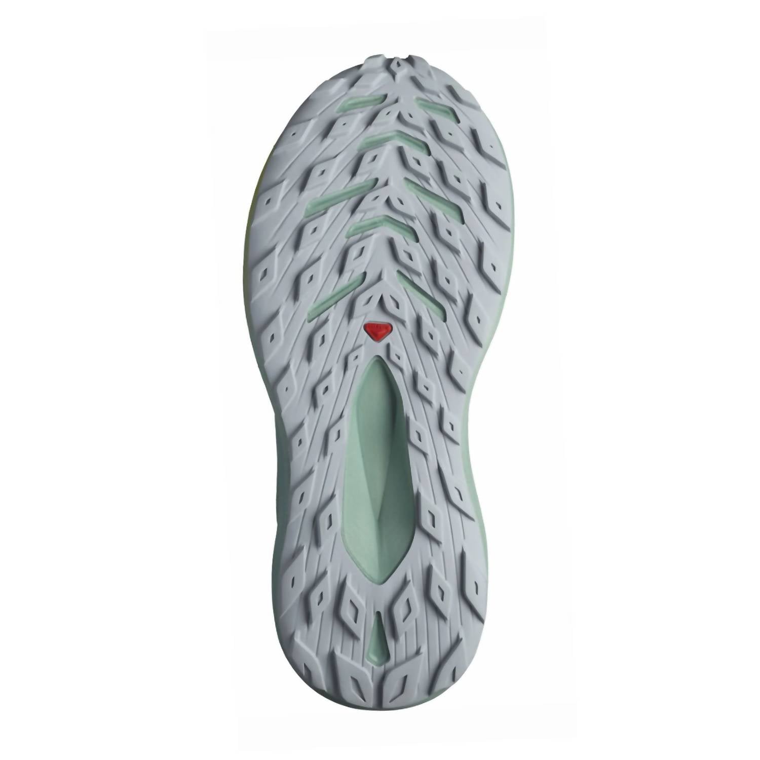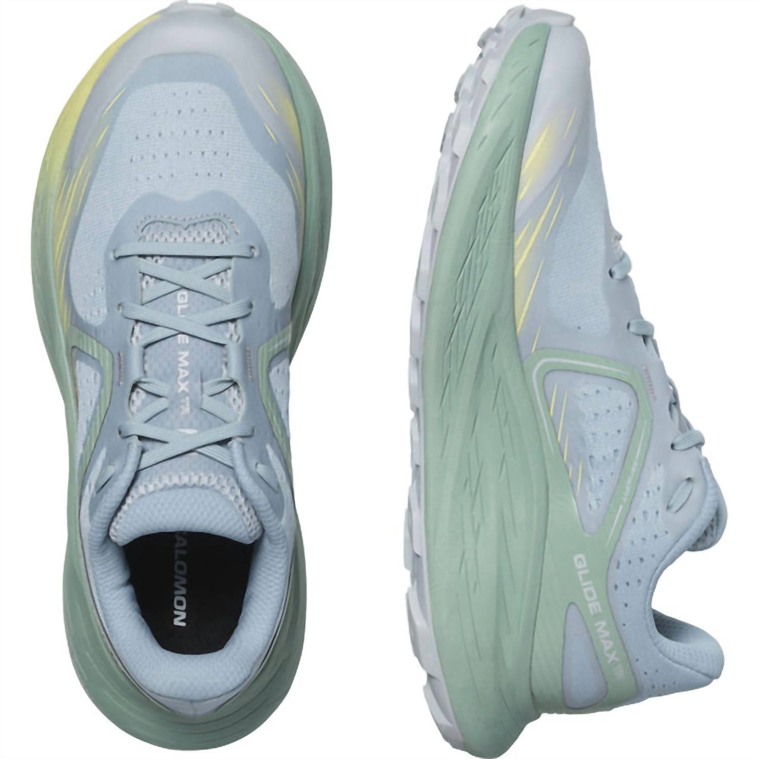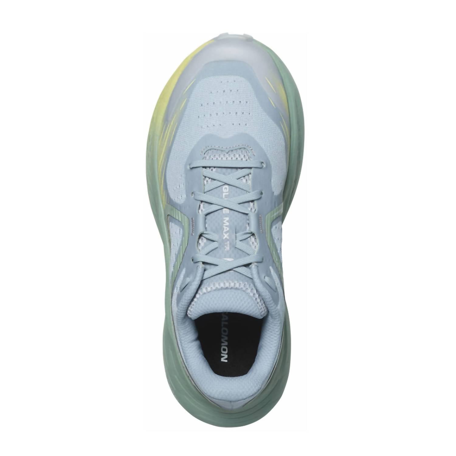 Stylish, comfortable and supportive. These athletic sneakers check all of the boxes. Experience plush comfort with the Women's Glide Max Trail Running Shoes by SALOMON, crafted to support long-distance trail runners. These shoes feature advanced Energy Foam cushioning atop an elevated stack height, offering velvety smooth landings over greater distances. The lightweight engineered mesh upper ensures breathability and comfort, while the All Terrain Contagrip® outsole provides exceptional grip on varied surfaces. Designed with a round toe and a 6mm drop for smooth transitions, these shoes promise reliable performance in a trendy stone blue, granite green, and pearl blue colorway.