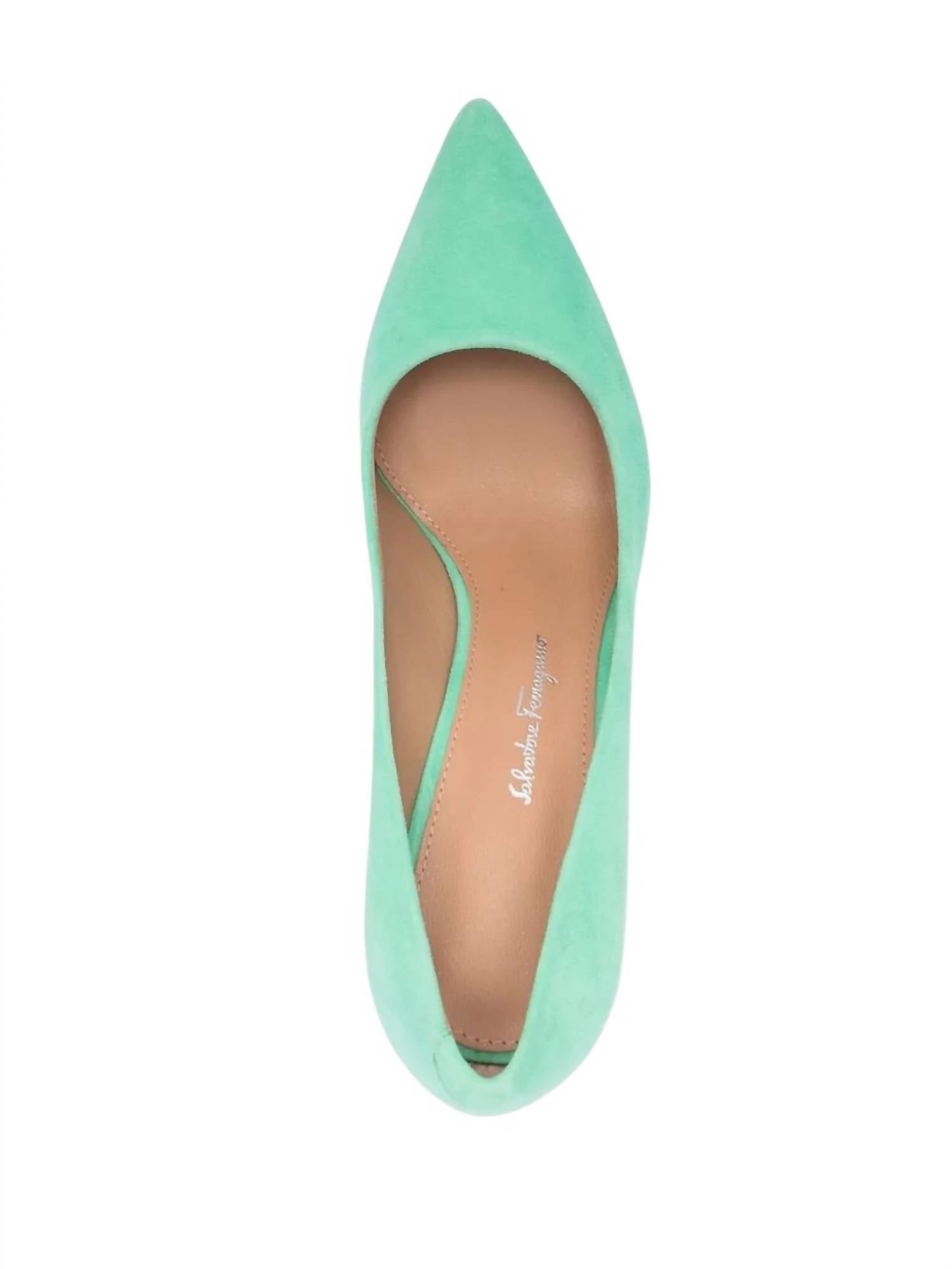 The perfect height for day to night. Elevate your evening attire with the Ilary X5 Suede Pumps by Salvatore Ferragamo, a symbol of quiet luxury. Crafted in Italy, these mint green pumps feature a pointed toe and high stiletto heel, measuring 4.13 inches for a sophisticated lift. With a 100% kid leather exterior, leather lining, and branded leather insole, these shoes promise exceptional quality and comfort. Perfect for New Year's Eve or any special occasion, these heels embody timeless elegance for the modern woman.