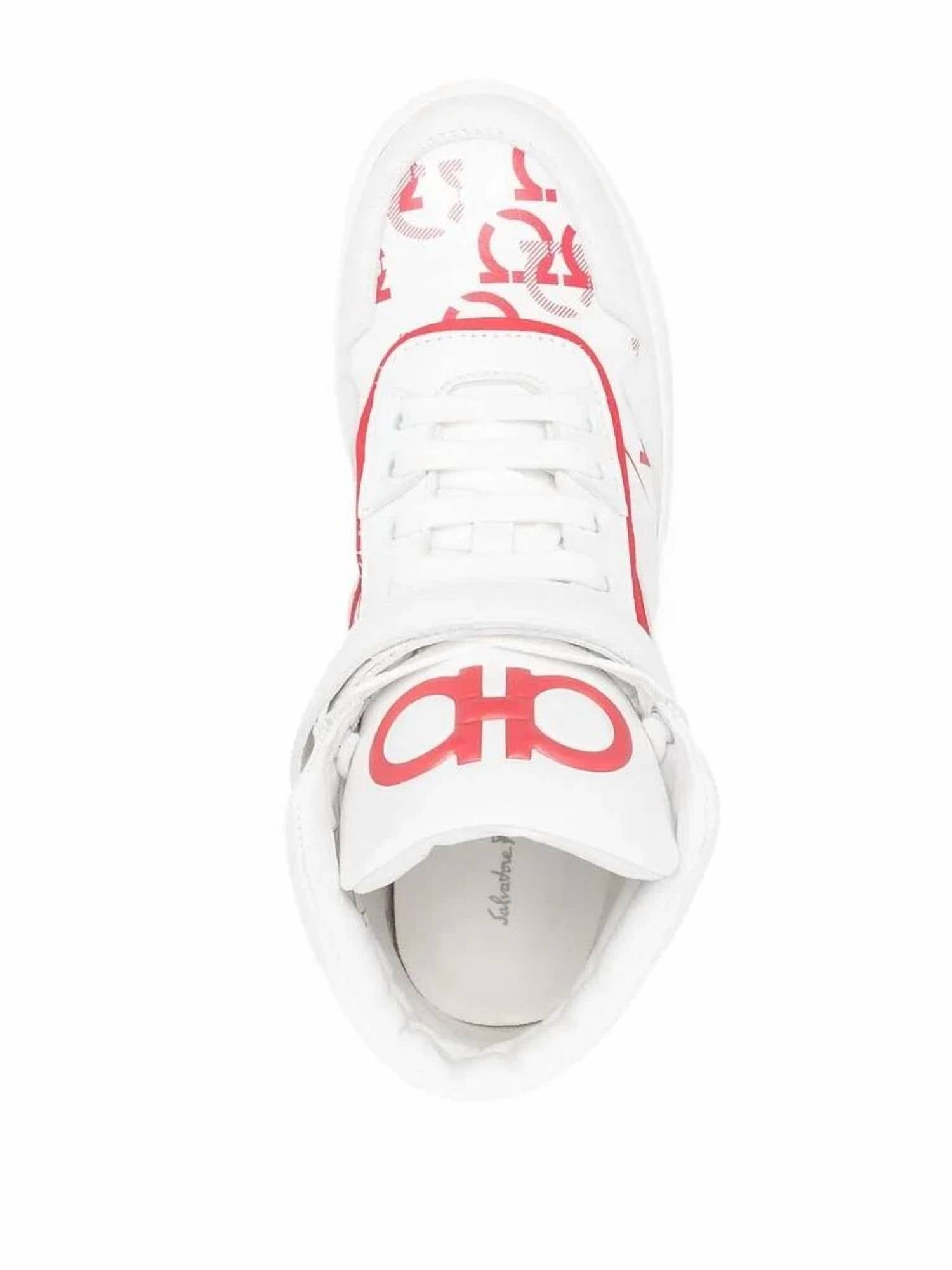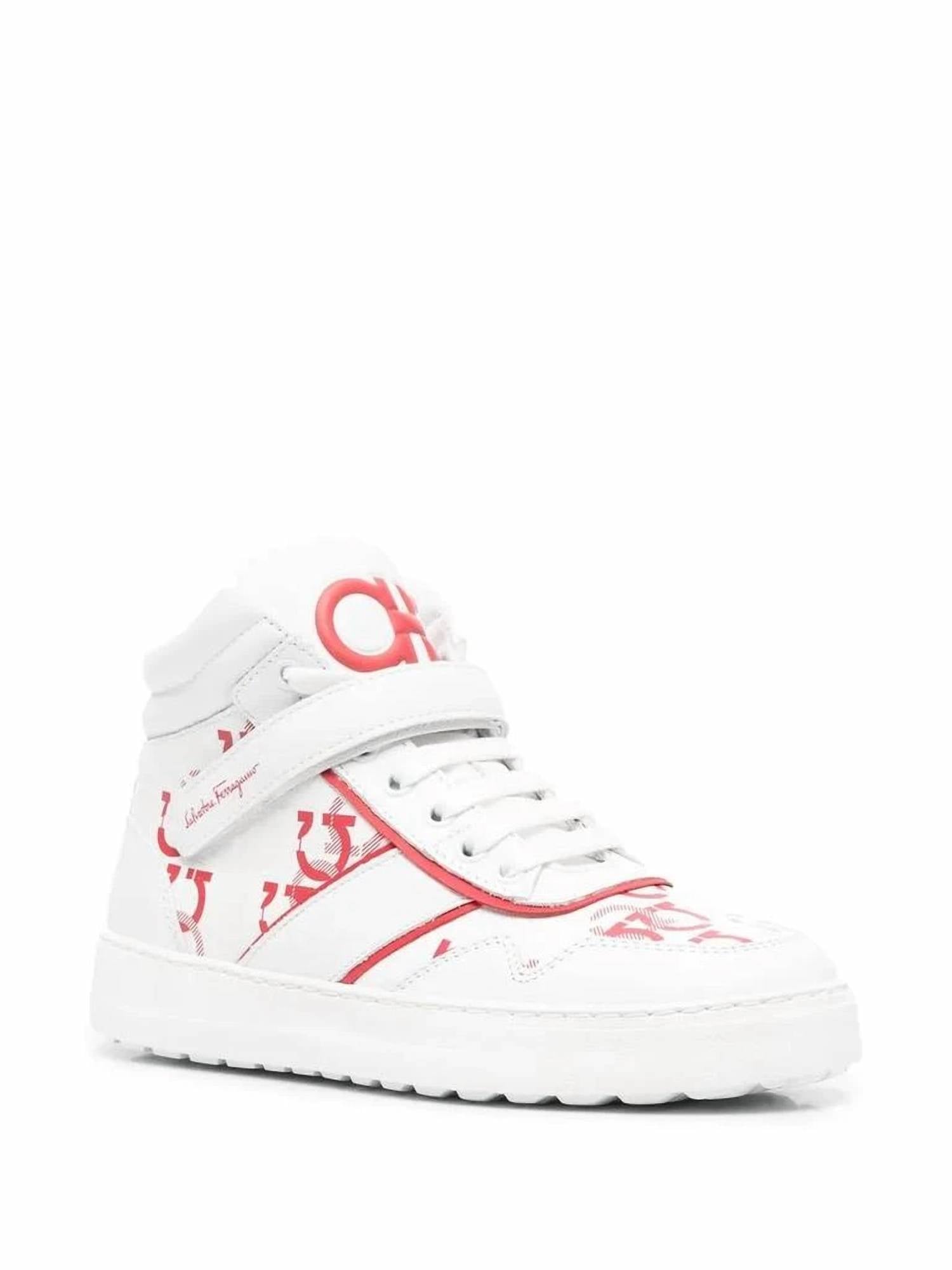Get your daily steps in with these adorable sneakers. Elevate your shoe collection with the Women's Noe High Top Leather Sneakers by Salvatore Ferragamo, skillfully crafted for ultimate style. These fashionable high-top sneakers feature a sleek red and white panelled leather design, complete with a monogram print and a logo-embossed tongue. The sneakers boast an ankle-length silhouette with a convenient touch-strap over lace-up fastening and a flat rubber sole. Made in Italy, they offer a round toe and low heel height of 1.18 inches, perfect for travel and infusing a touch of quiet luxury into your spring wardrobe.