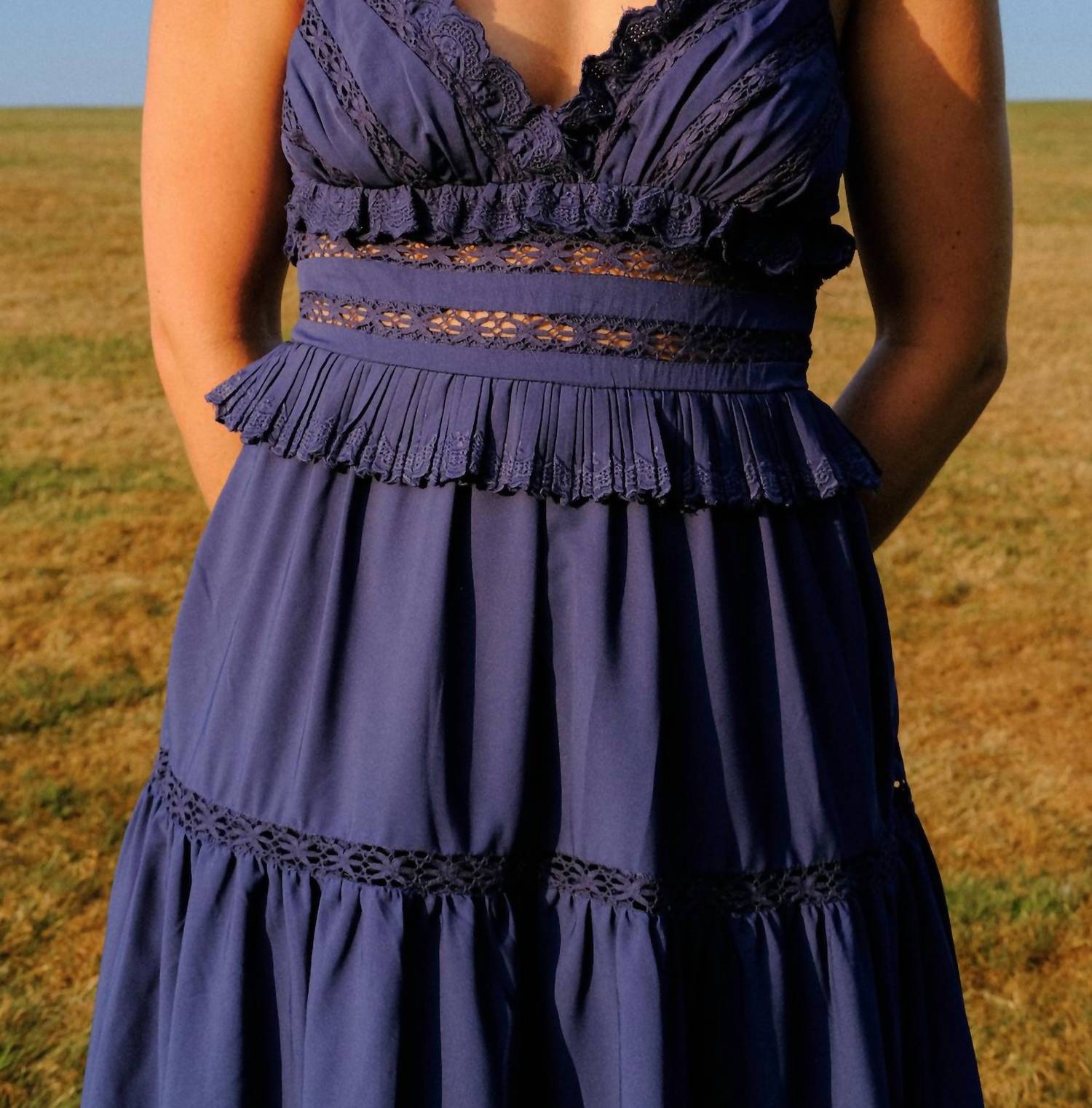 Who doesn't love a good maxi dress? This one you'll be reaching for season after season. Discover the Antonia Puff Sleeve Dress by SEA, a chic navy maxi dress perfect for summer vacations. Designed with a flattering A-line silhouette and V-neck, this stylish choice comes with convenient pockets. Constructed from 100% cotton with a textured pattern, it aligns with a boho-chic aesthetic. For care, machine wash and line dry to maintain its quality.