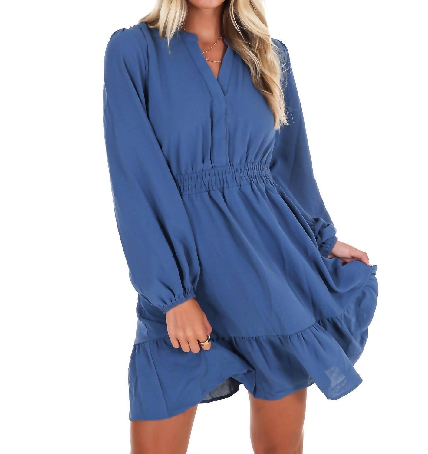 The pefect long sleeve dress for those cooler months. Step into elegance with the Crossed My Mind Long Sleeve Dress by SHE + SKY in a sophisticated dusty blue shade. This A-line woven dress boasts long sleeves and a flattering elastic waistband that gracefully highlights your figure. Featuring practical pockets for added convenience, the dress offers a chic, solid pattern with a V-neckline perfect for spring holiday parties.