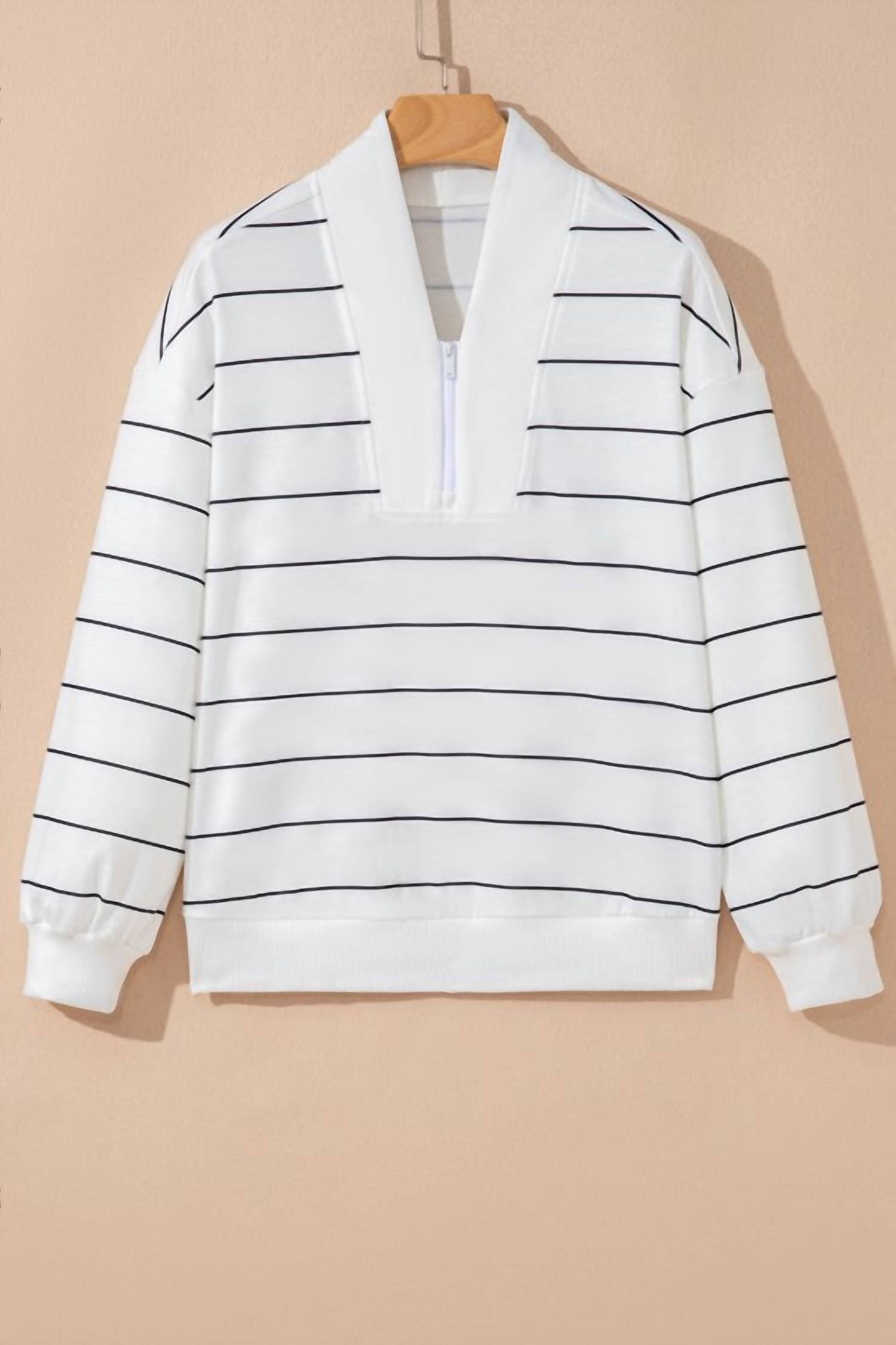 Cozy fabric, impeccable design - Meet the sweatshirt that you'll never want to take off. Elevate your travel wardrobe with the Shewin Half Zip Sweatshirt, boasting a chic white base and classic navy stripes for a nautical appeal. Designed with long sleeves and a playful zipper v-neck, this top ensures both style and comfort. Closure: Pull on. Care: Machine wash and tumble dry, making it a low-maintenance choice for the minimalist traveler seeking casual sophistication.